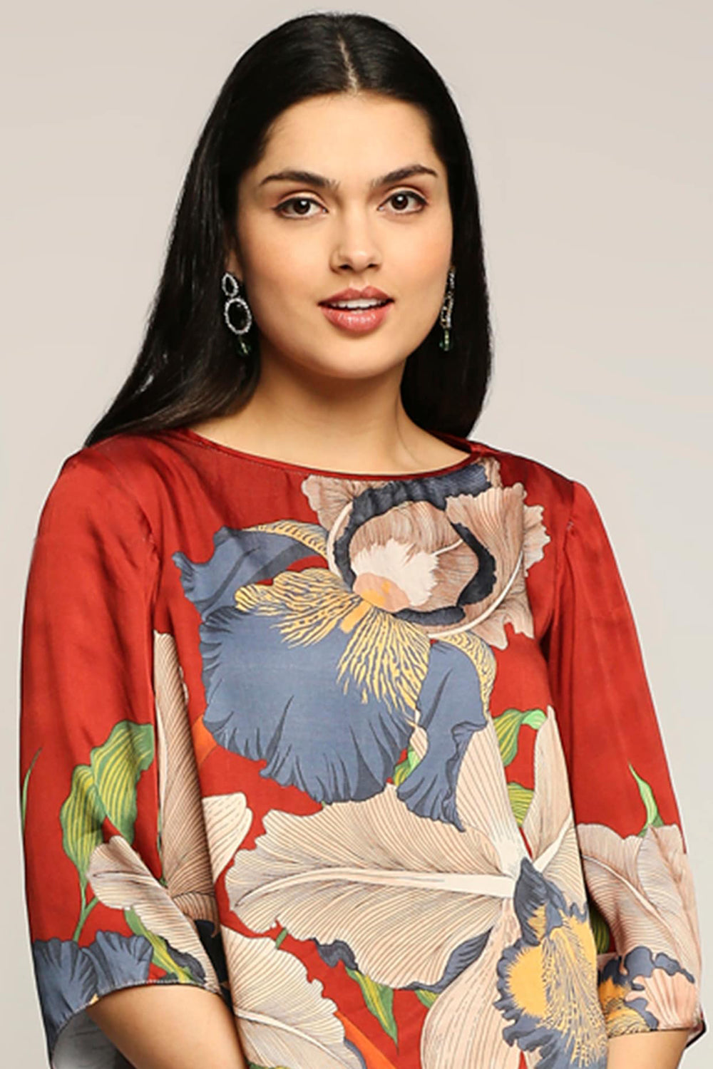 Red Orchid Bloom Printed Top With Pants In Satin.
