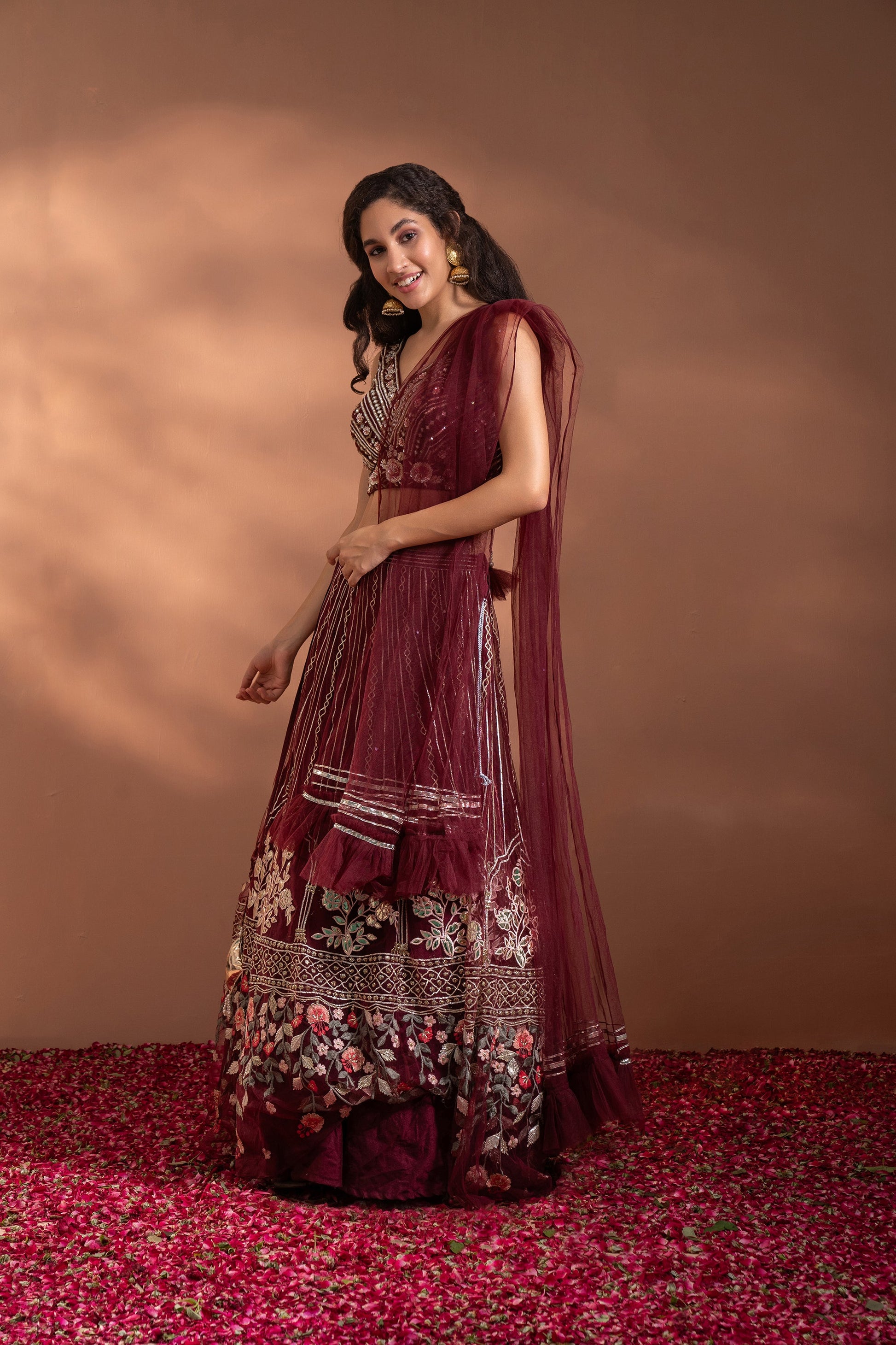 The Lehenga set adorned with intricate mirror, thread & embroidery work.