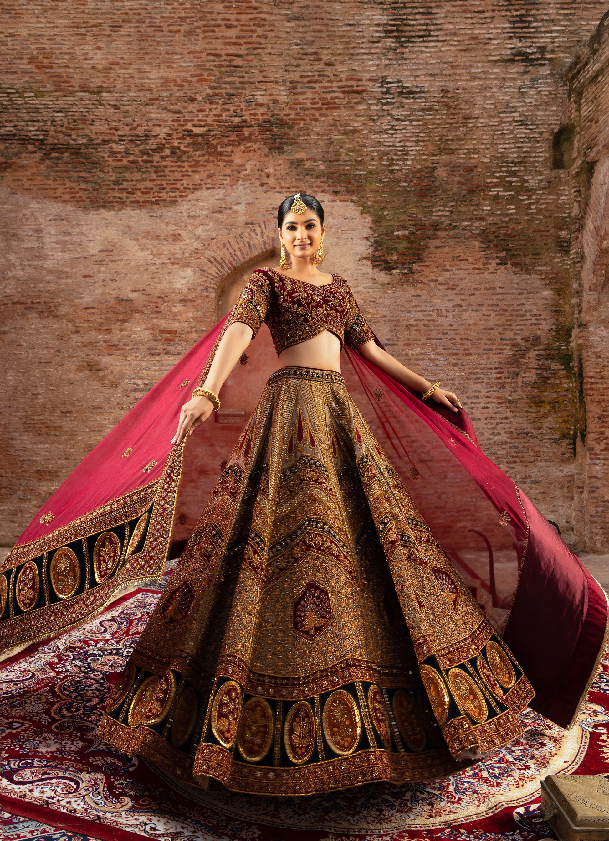 A majestic tale spun in royal hues, behold this Marwari-style bridal lehenga adorned in rich, regal colors. It stands as a masterpiece of Zardozi embroidery and exquisite peacock motifs on silk, paying homage to tradition and celebrating elegance. The bride, a symbol of grace and heritage, embodies the essence of timeless beauty.