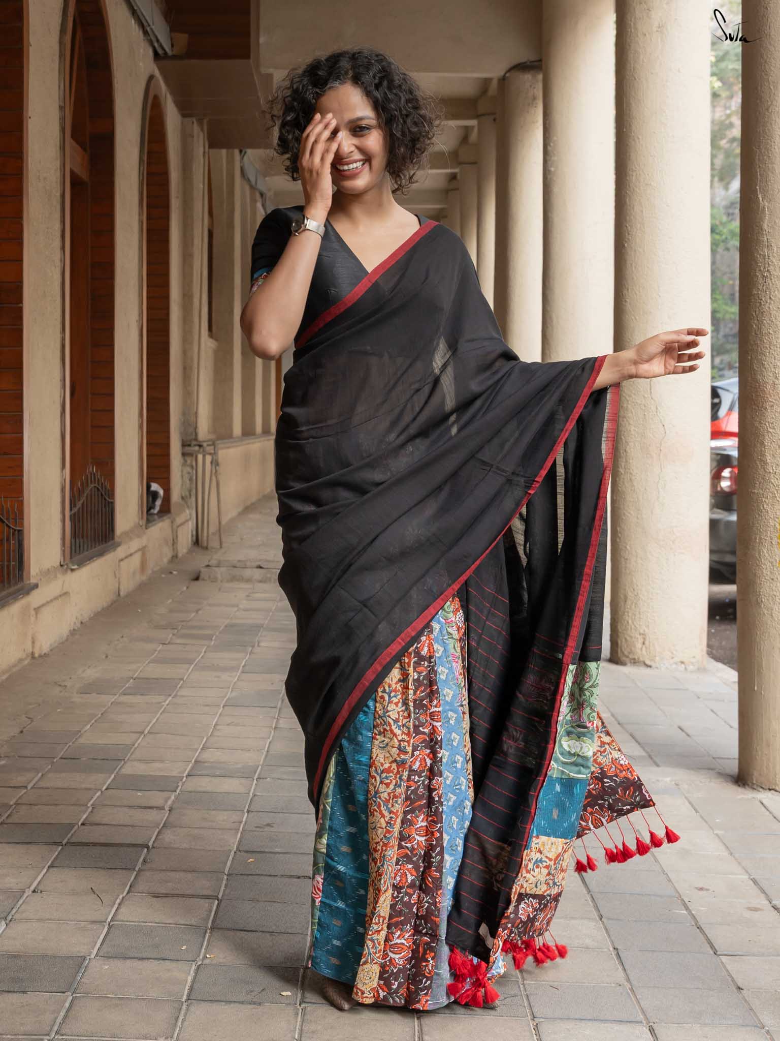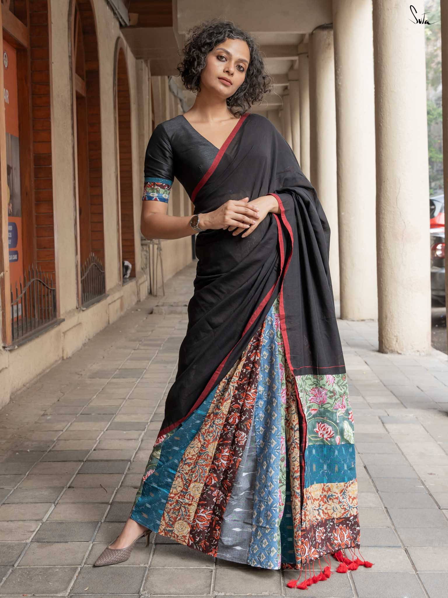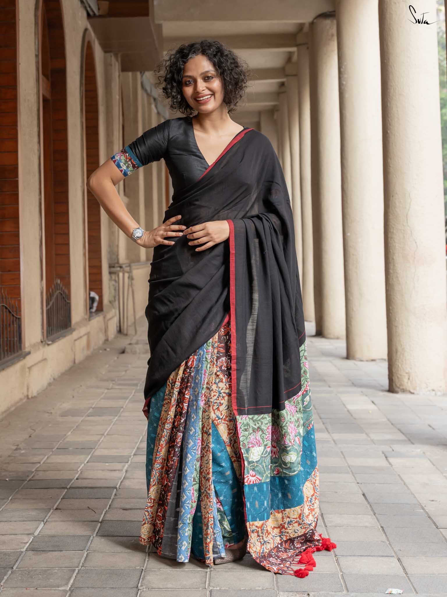 Ye Masala Box hai, aur ismein hai sab kuch! This black mul viscose slub saree shines with a pinch of colorful printed patches, making it confident as the woman who wears it. Just like Doree’s life full of surprises, this saree mixes elegance with a dash of spice. For the woman who’s not afraid to flaunt her fiery side, grab the Masala Box and let your style do all the talking!