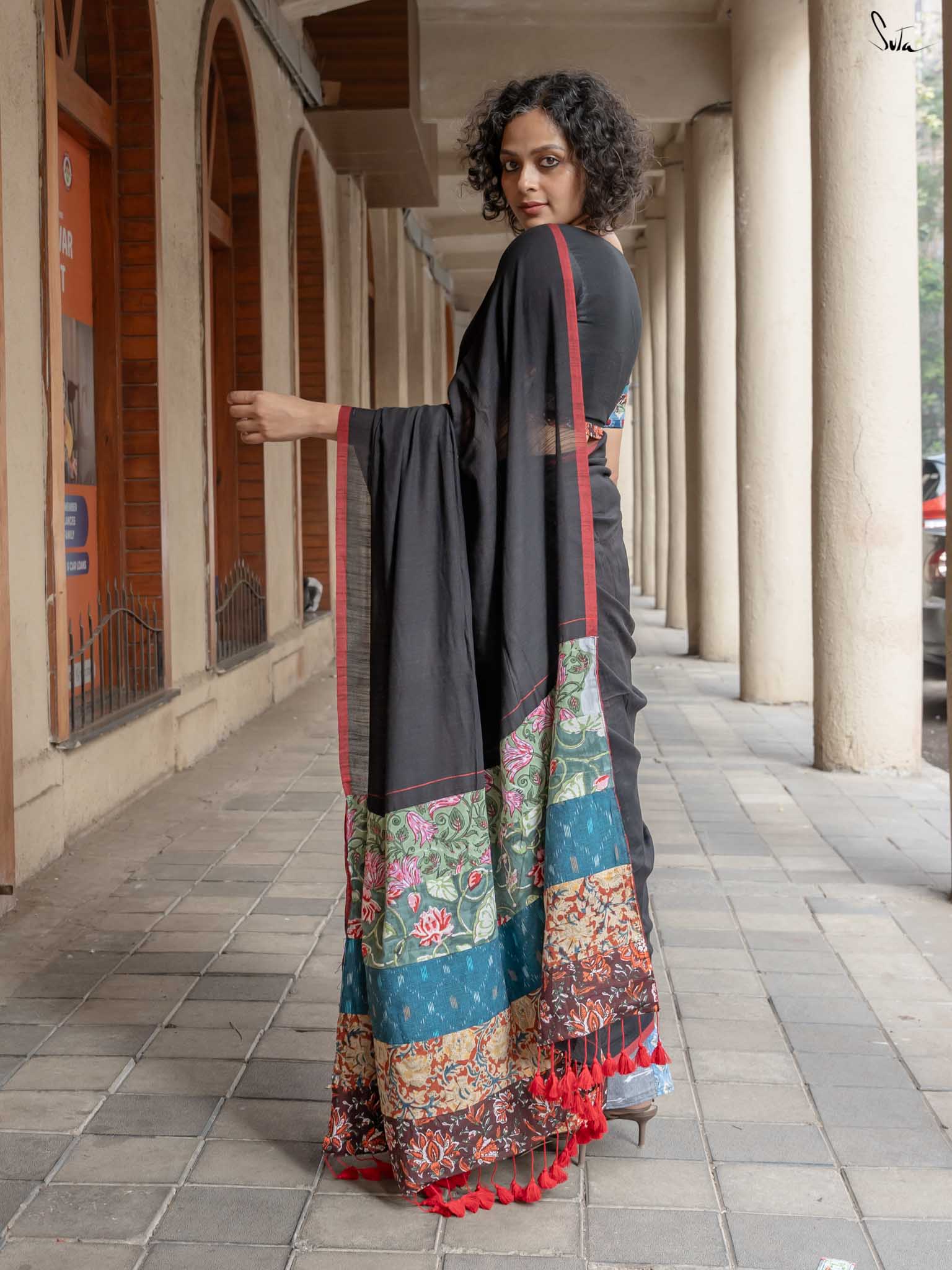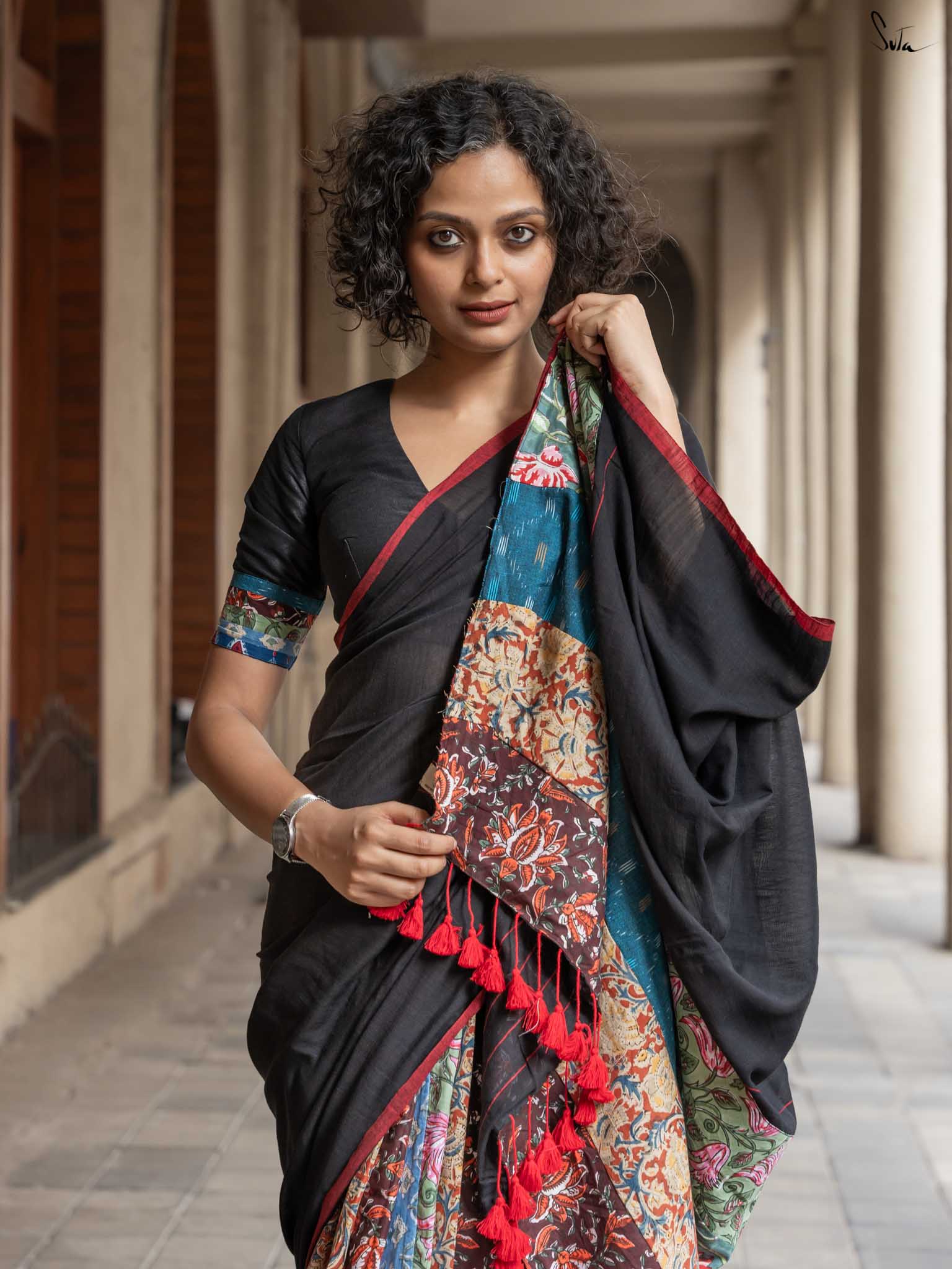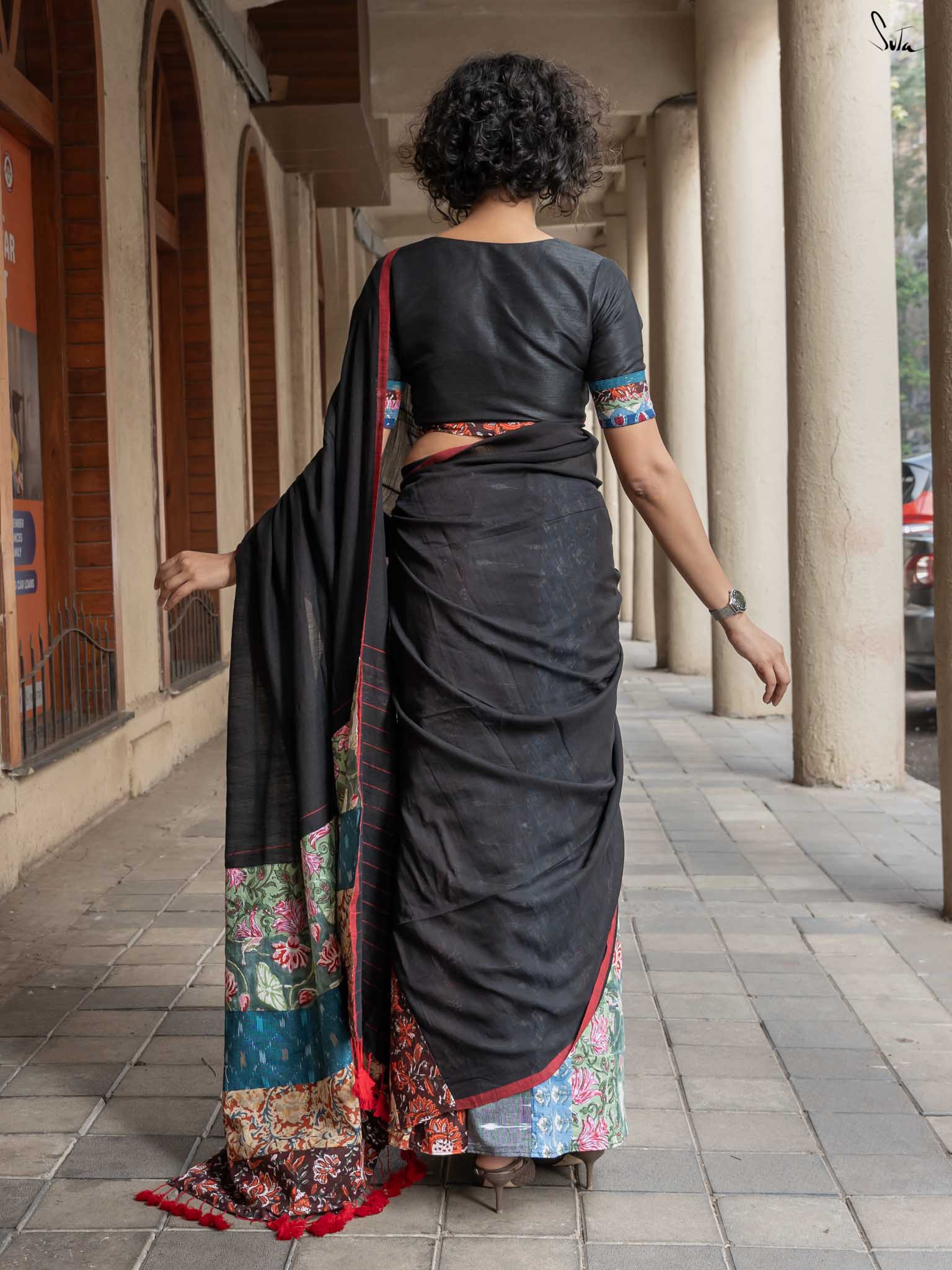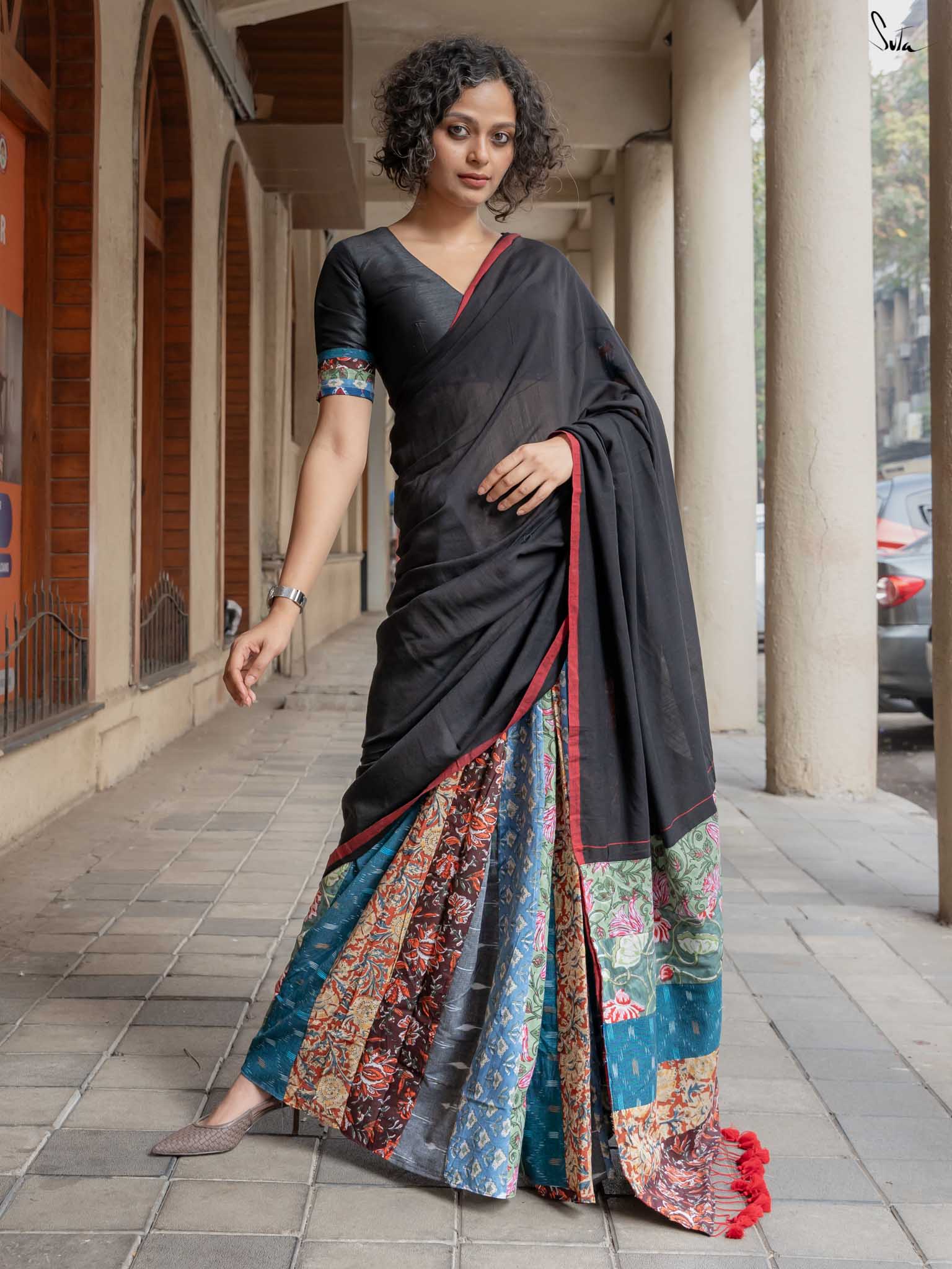 Ye Masala Box hai, aur ismein hai sab kuch! This black mul viscose slub saree shines with a pinch of colorful printed patches, making it confident as the woman who wears it. Just like Doree’s life full of surprises, this saree mixes elegance with a dash of spice. For the woman who’s not afraid to flaunt her fiery side, grab the Masala Box and let your style do all the talking!