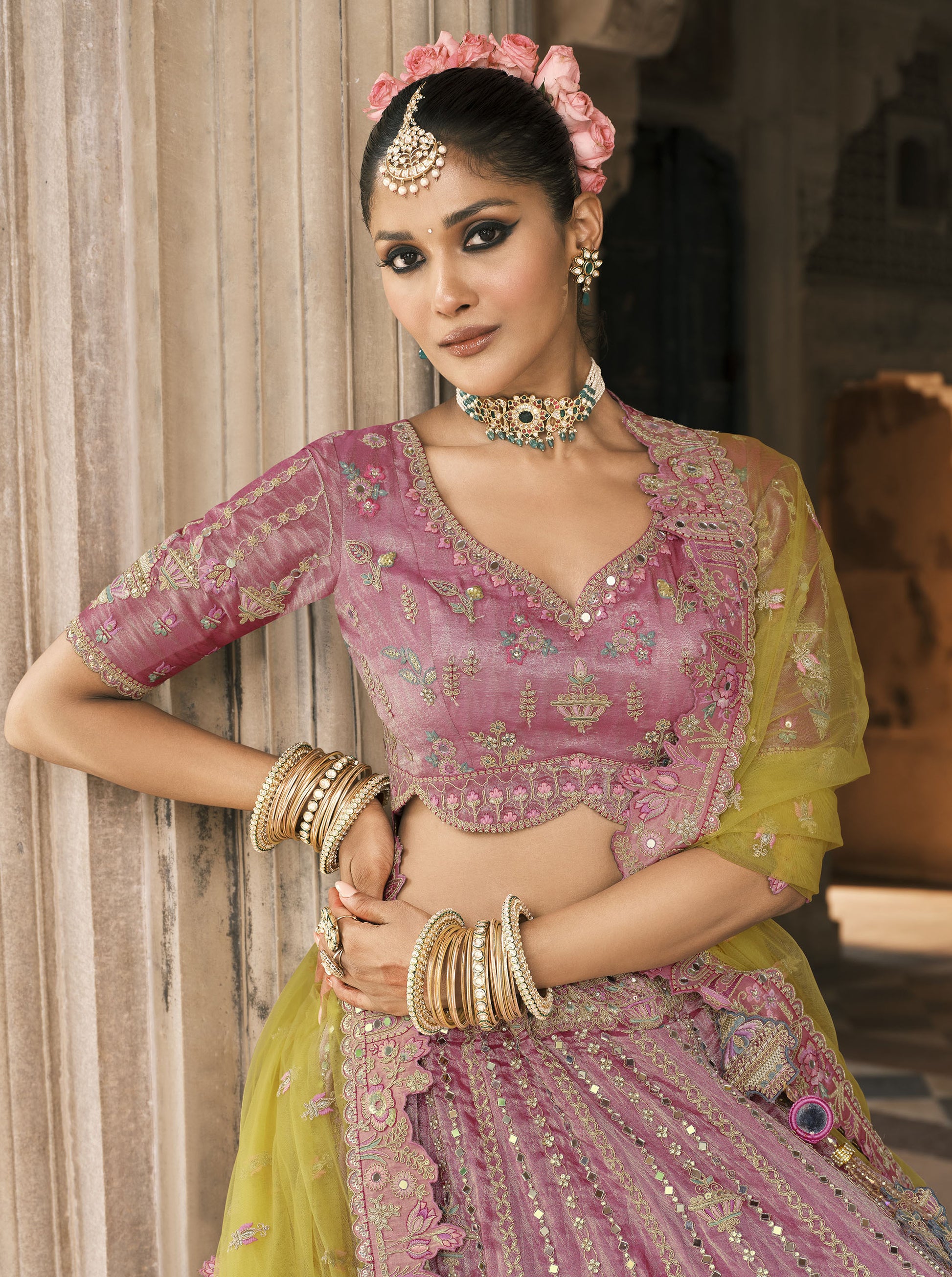 Mauve and Yellow Silk Heavy Mirror & Sequins Embroidered Bridal Lehenga