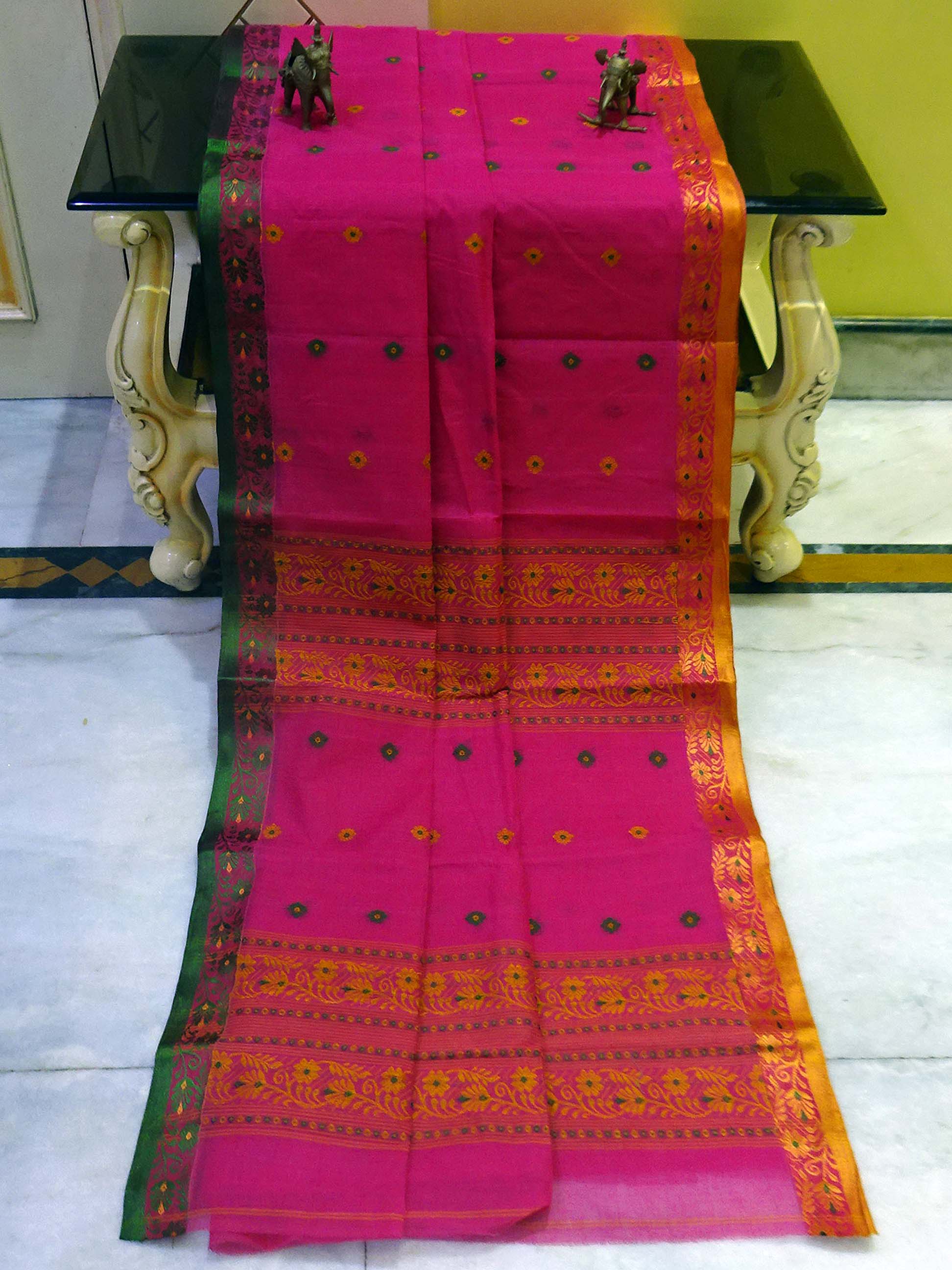 Medium Size Nakshi Border Bengal Handloom Cotton Saree in Hot Pink, Sunset Orange & Pine Green