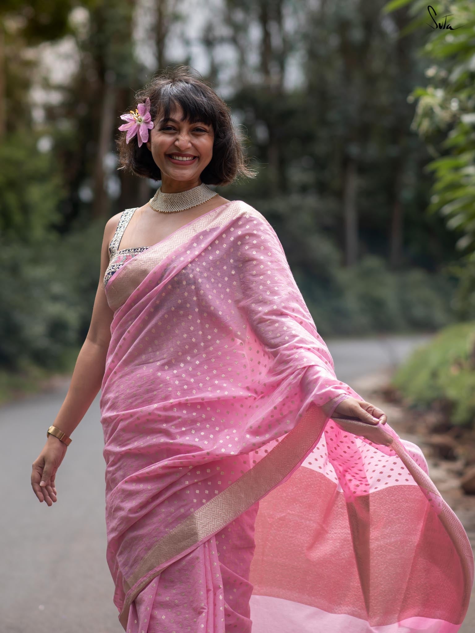 Drawing inspiration from the free-spirited, refreshing sea breezes, the 'Meethi Leher' saree playfully complements your bubbly nature. Woven from lush cotton polyester fabric and featuring an energetic baby pink base, drape yourself in love with the Meethi Leher saree.