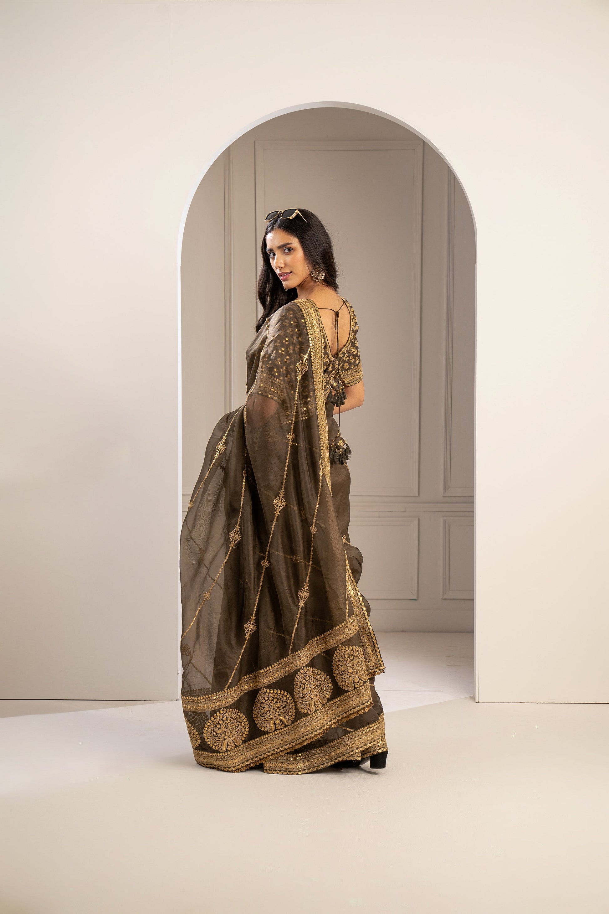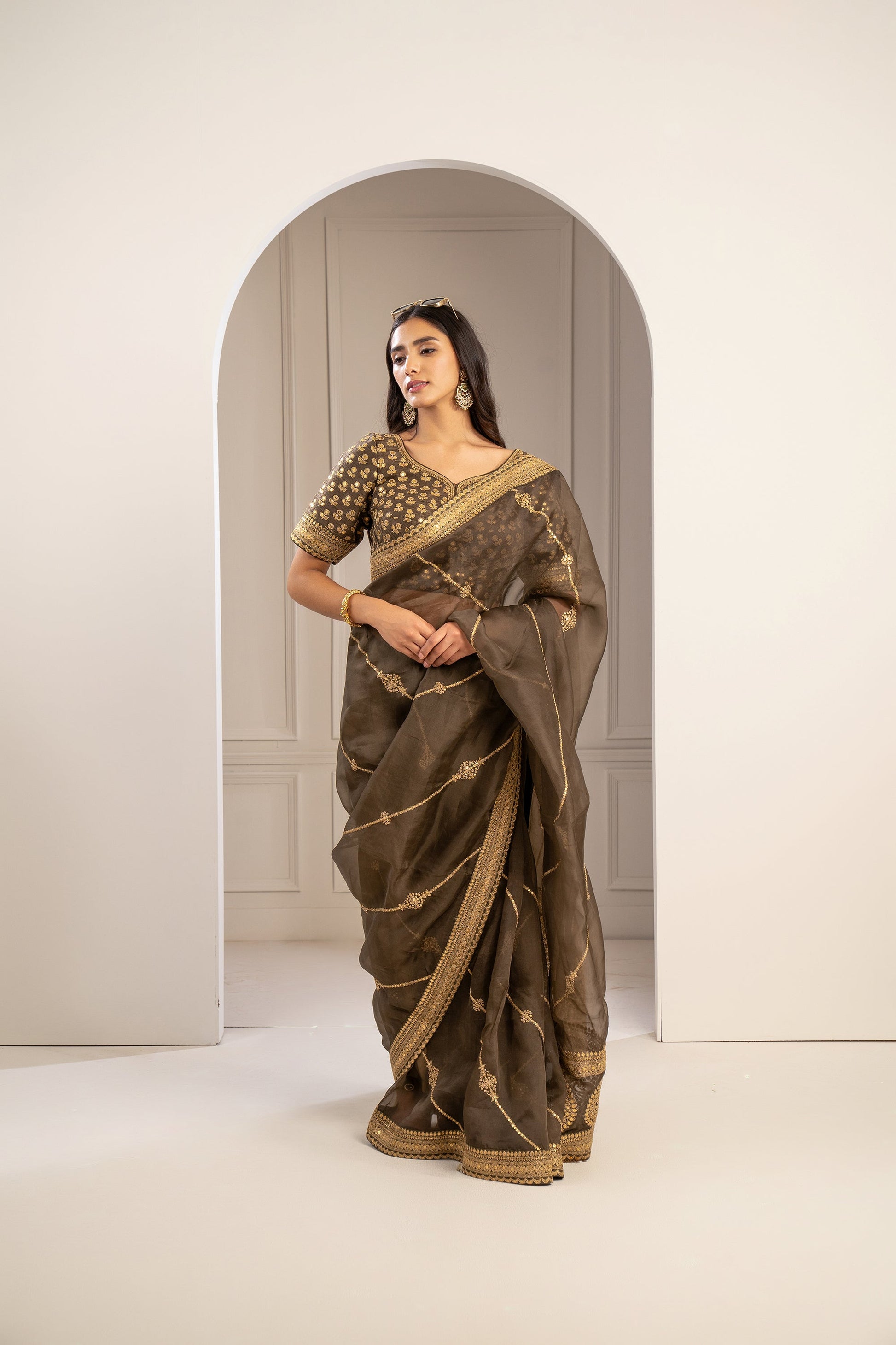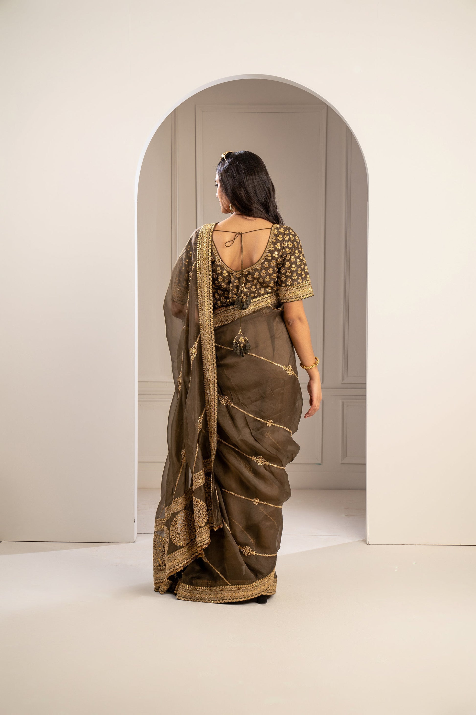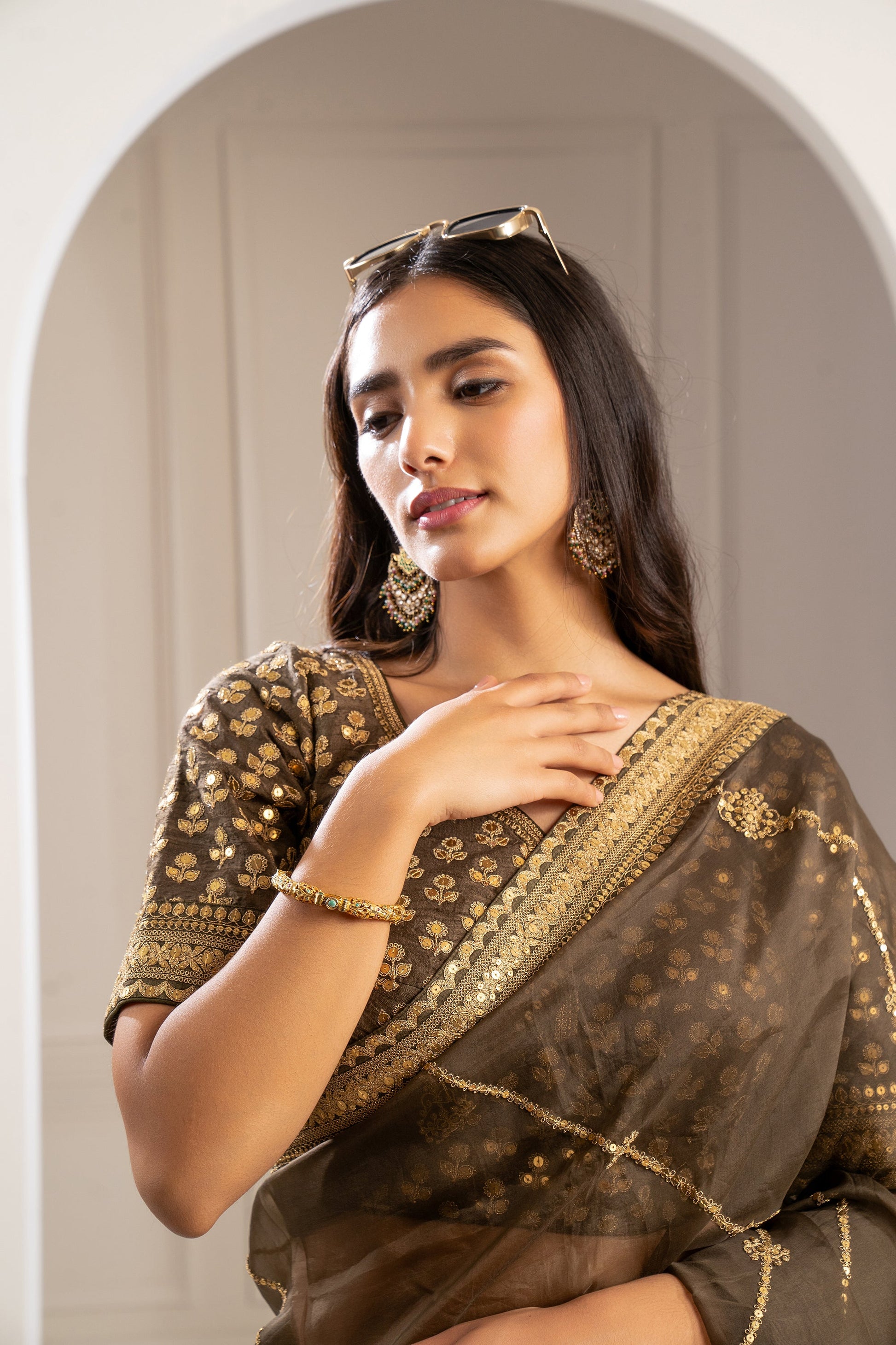 Mehendi Green organza saree with pita work and sequins. 2) Paired with matching padded blouse.