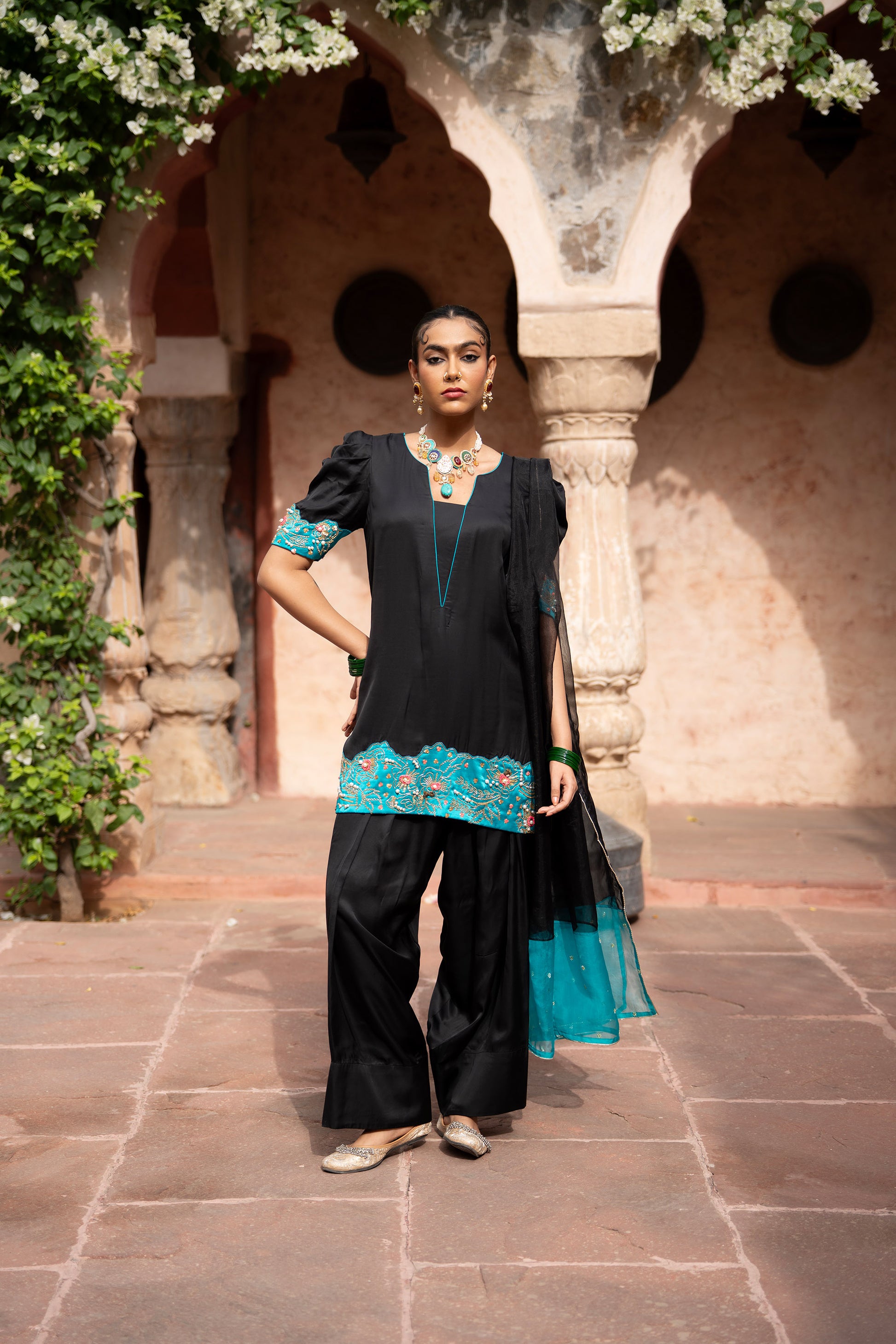 Graceful and striking, this Midnight Noir ensemble is crafted from imported satin, radiating refined elegance. The kurta features exquisite hand embroidery on the puff sleeves and hem, adding intricate texture and depth. The dual-tone finish brings a subtle contrast, enriching the overall aesthetic.