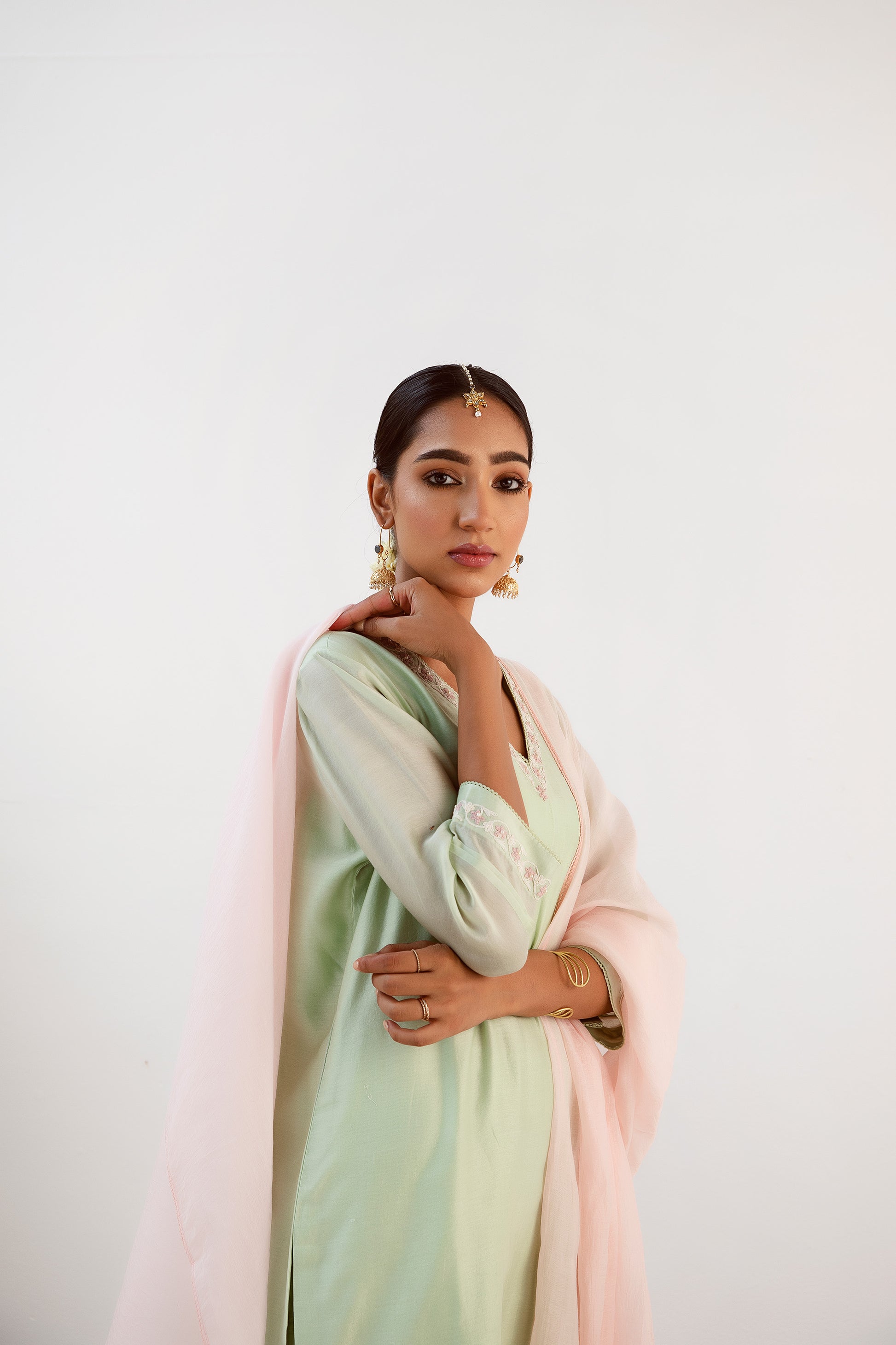 Featuring a mint green kurta in silk chanderi base with dori and pearl embroidery. It is paired with matching bemberg cotton pants and a blush pink dupatta.