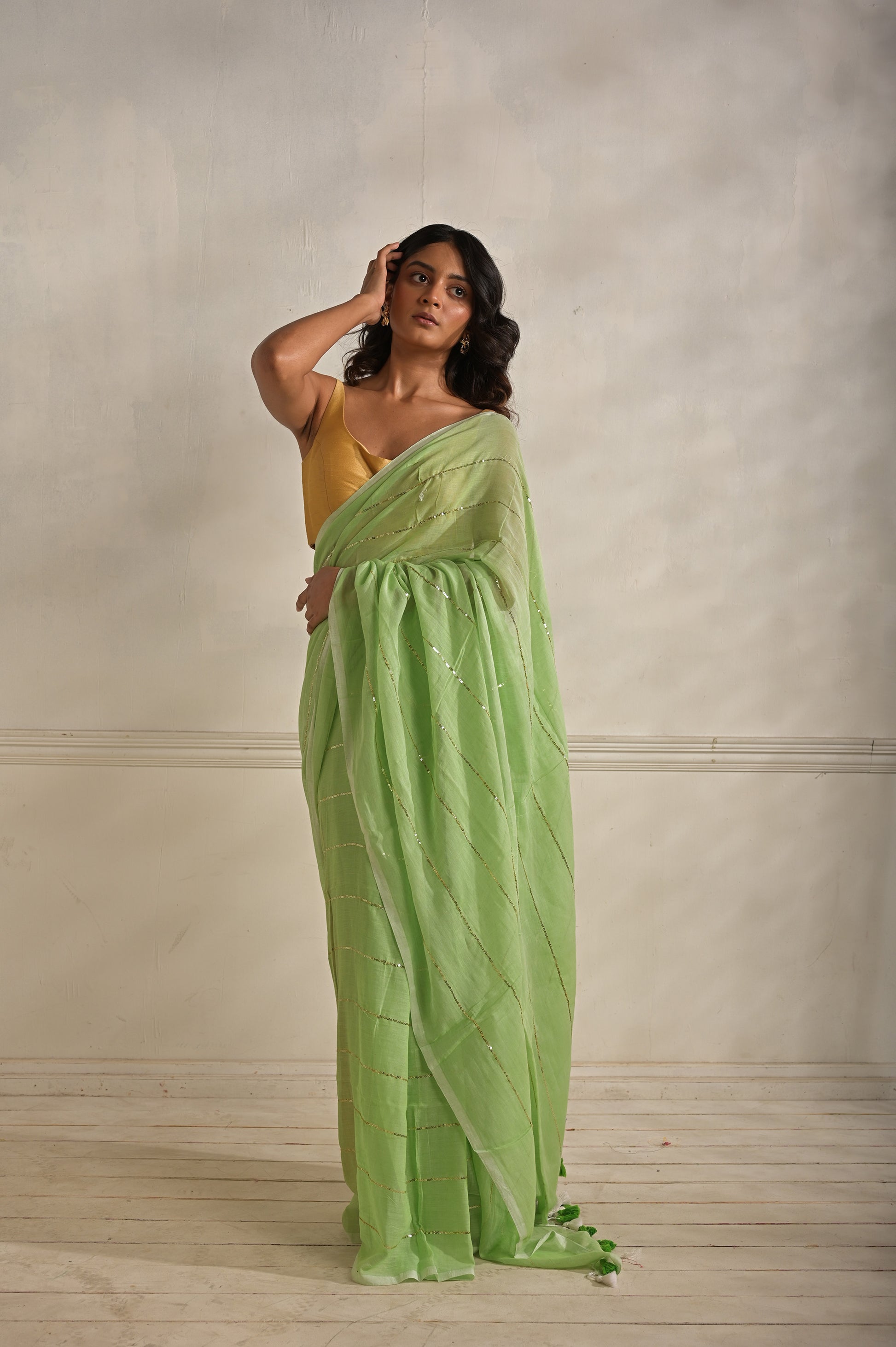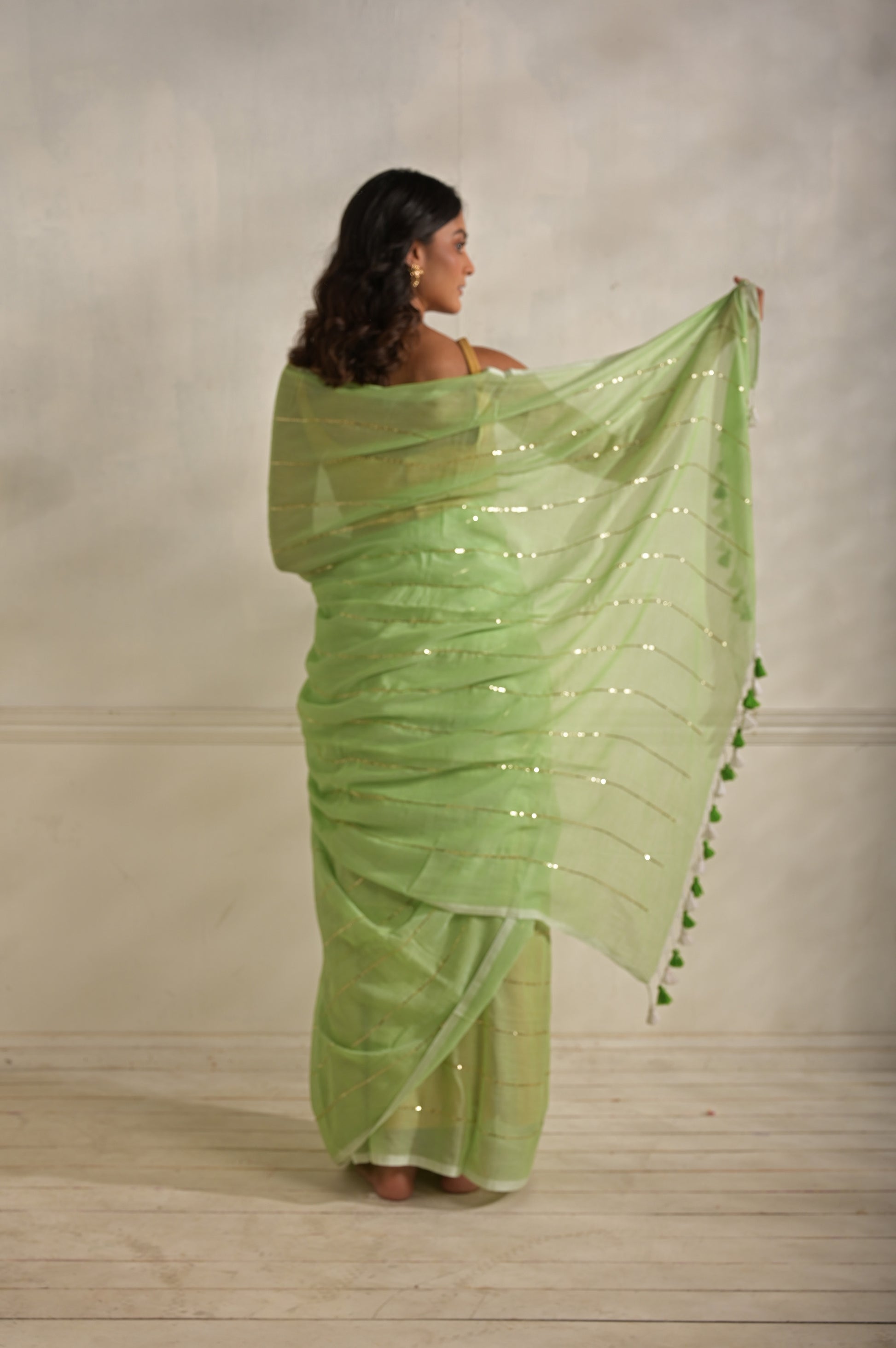 Miraya | Mint Green Handloom Mul Cotton saree with sequined lines