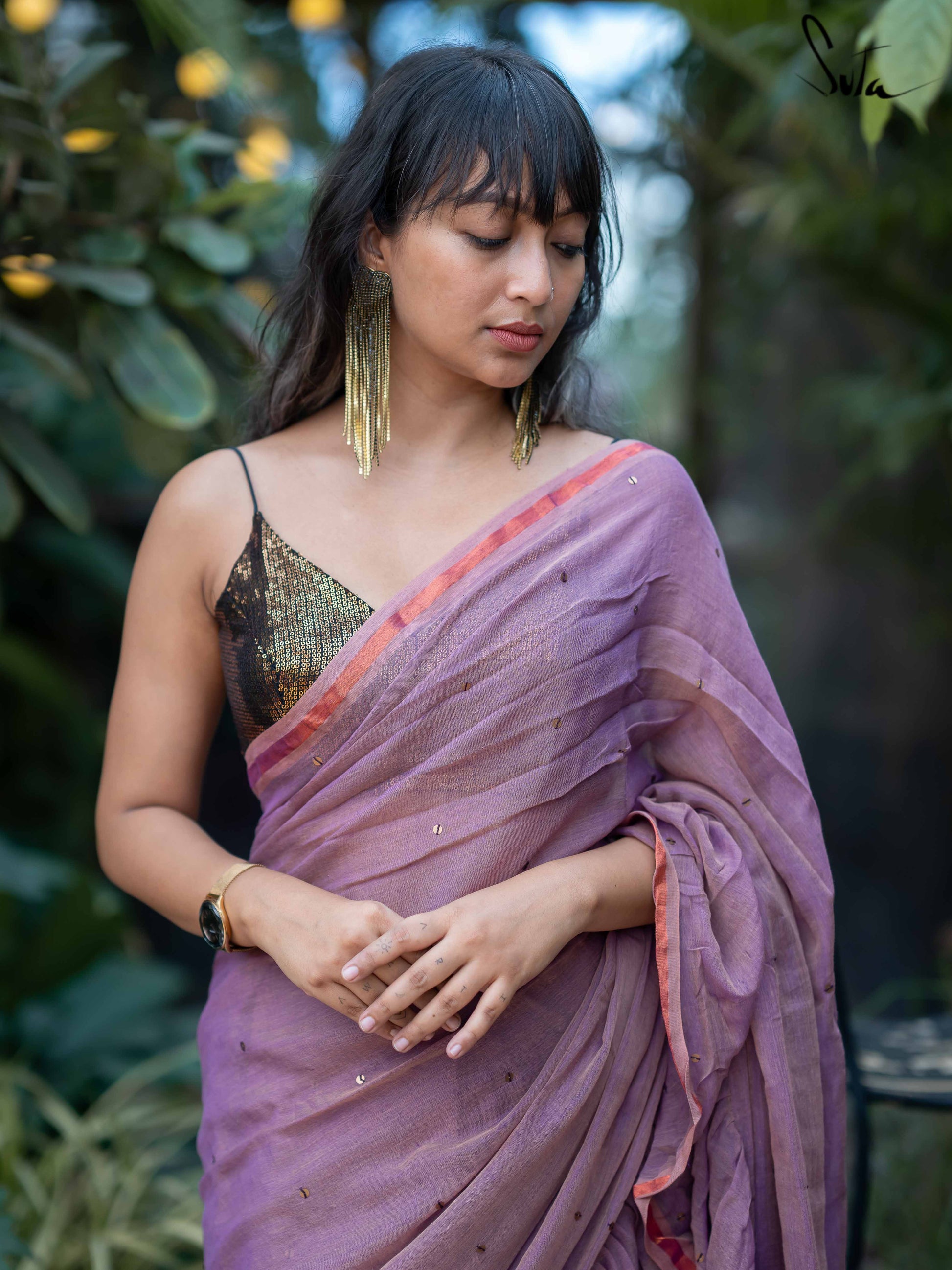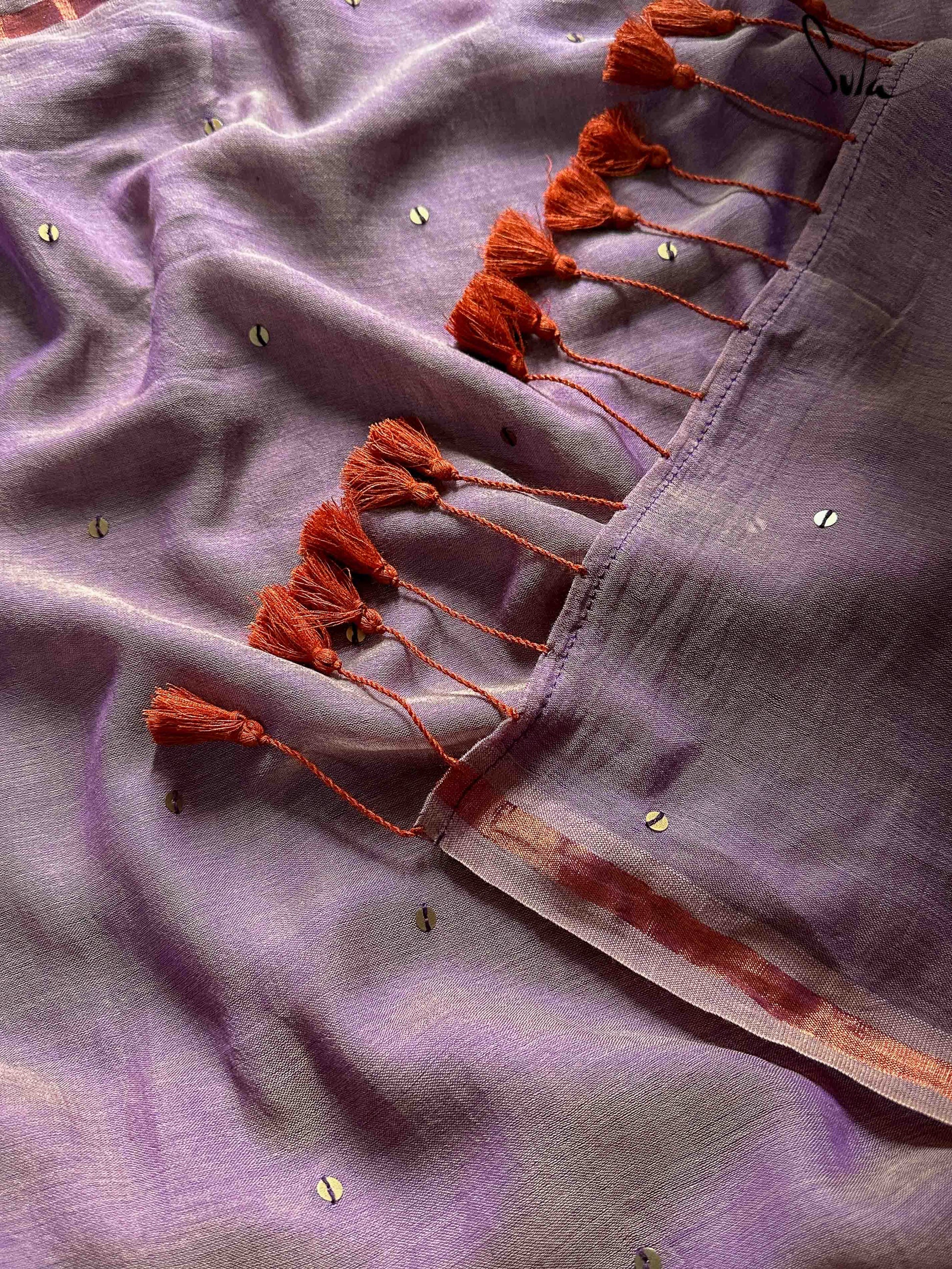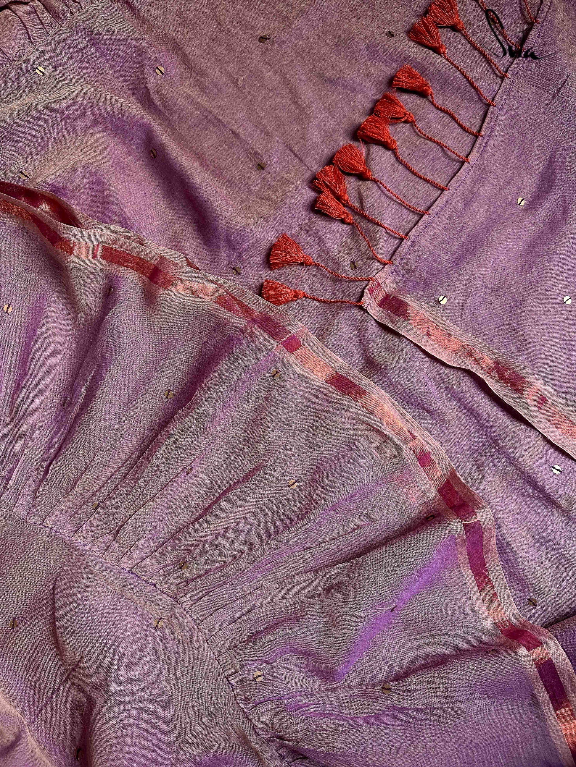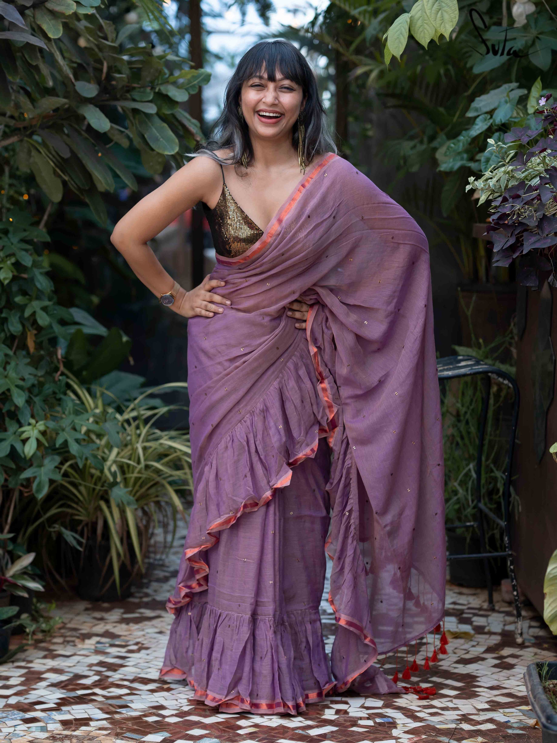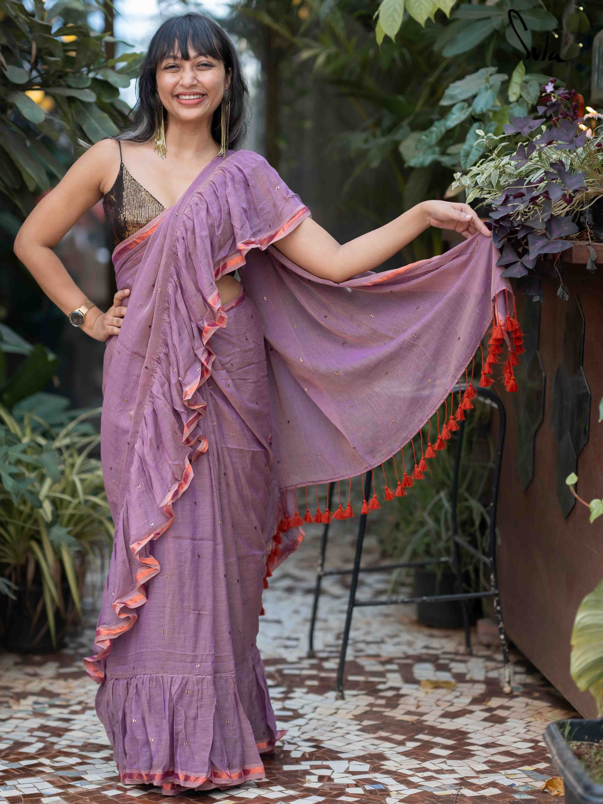 Face your feelings in this mesmerising lavender handwoven mul cotton saree with ruffles. The hand-sewn chumkis and golden border will light up your day.