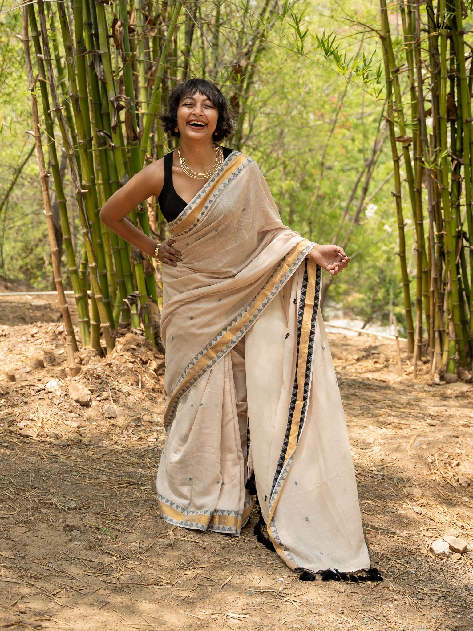 The Mogra Mist saree is an exquisite beige cotton slub piece featuring a delicate zari border and a charming small black temple border. This saree, adorned with vibrant black polka dots all over, has a quirky yet sophisticated charm that makes it ideal for both informal and festive occasions. Drape yourself in this saree and let its beauty bring a touch of floral serenity to your style!