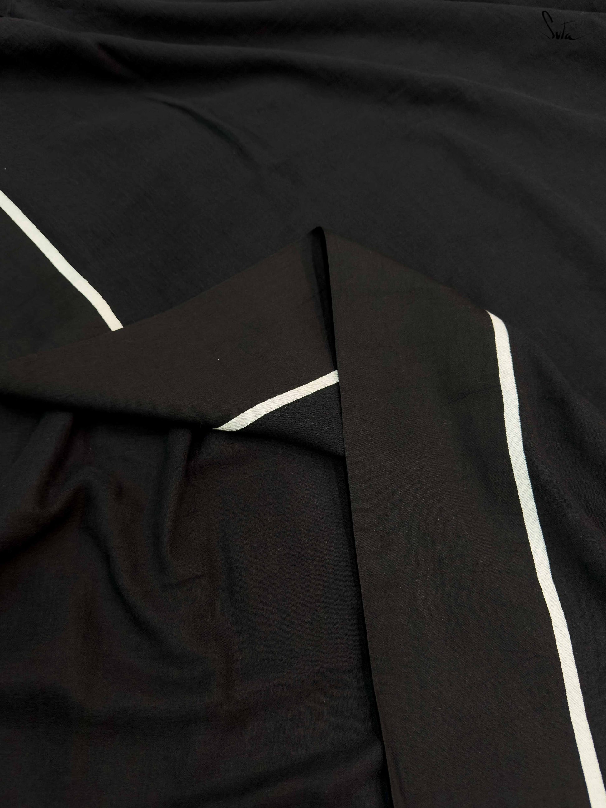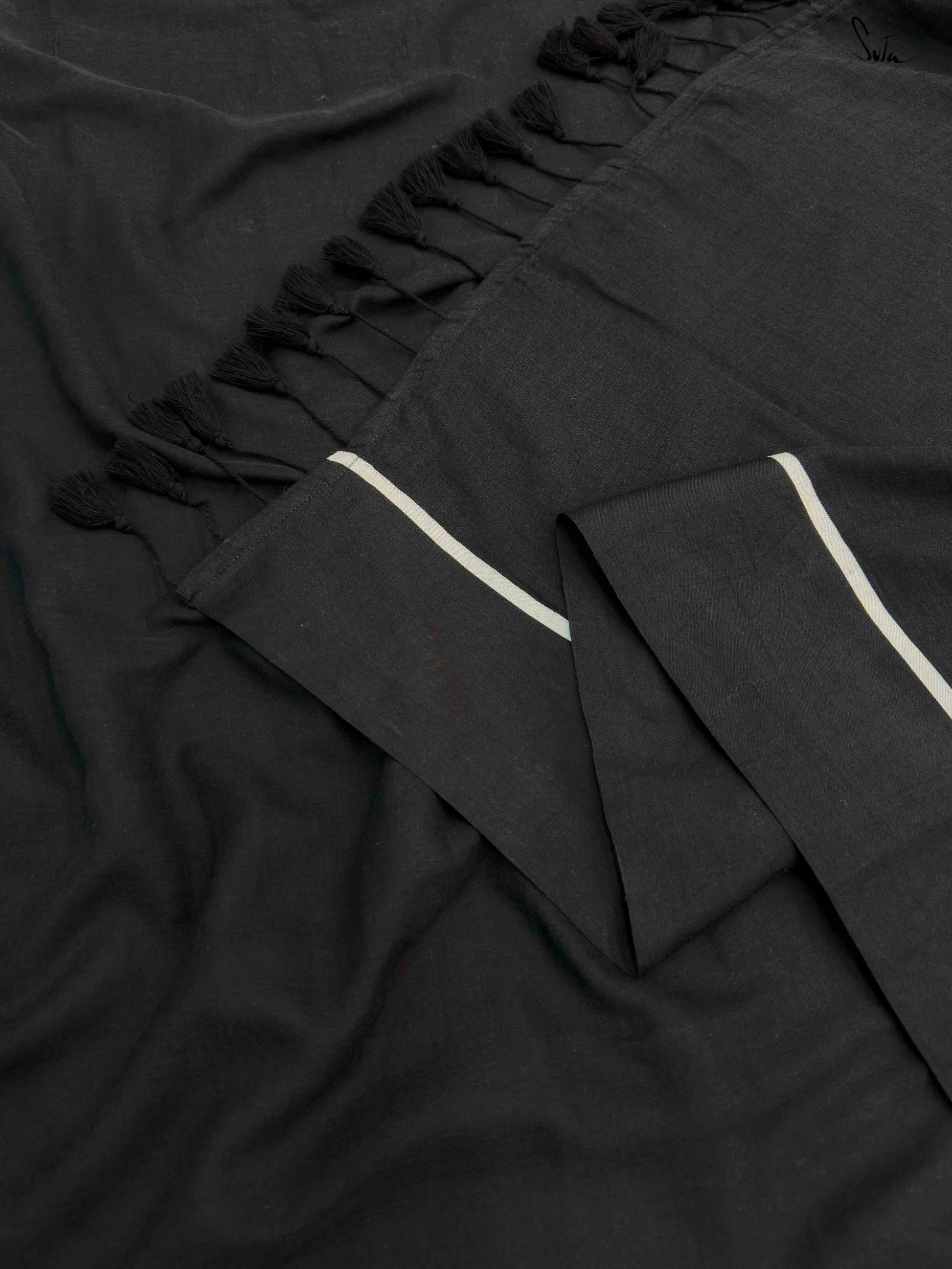 This basic black mul cotton weave with a white border will adorn you in smartness. Fanning your curiosity for an adventure as free-spirited as YOU, it will swathe you in heavenly softness.
