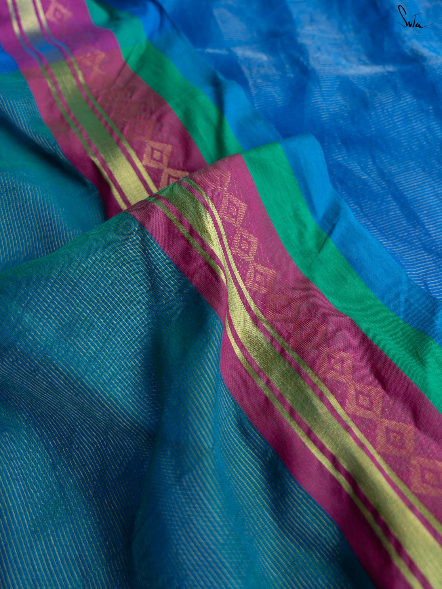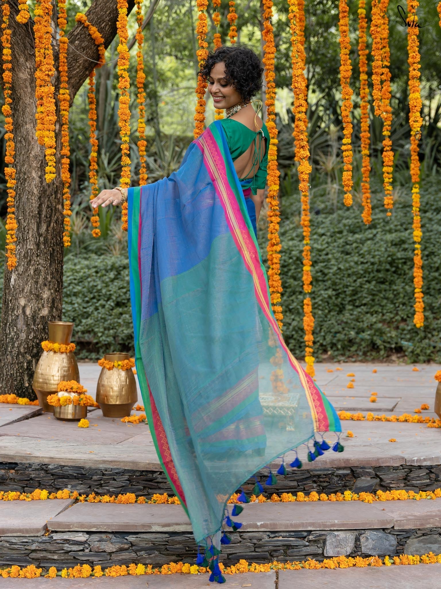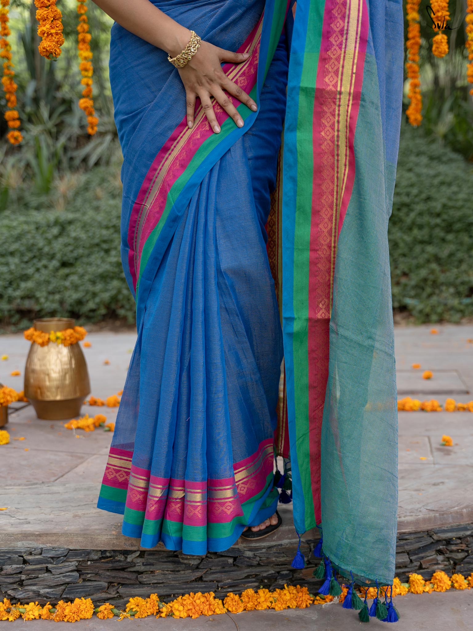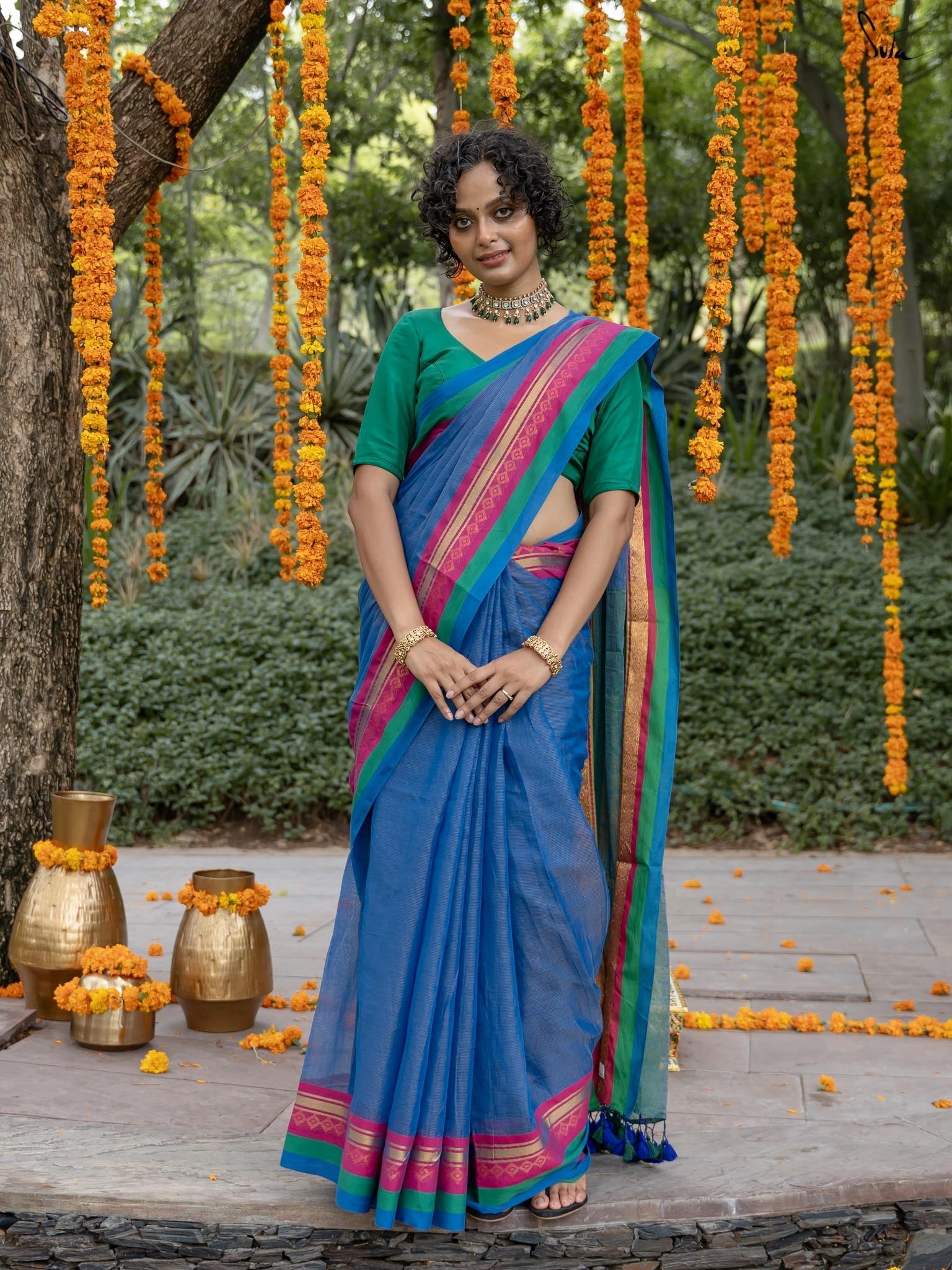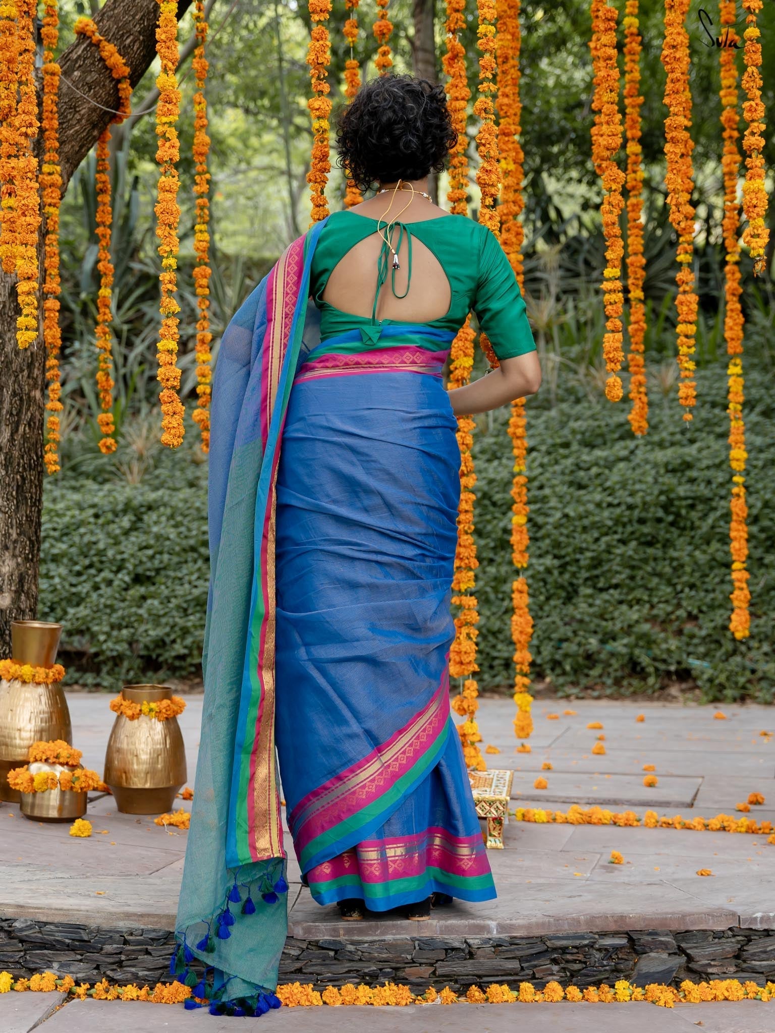Crafted from soft and breathable mul cotton, this ink blue saree is well and truly a celestial dance of style and comfort. The contrasting pallu and detailed border delightfully adorn the saree, and the zari lines running through the body adds a quirky charm to the saree. Pair it up with the 'Nisargi' blouse from Suta and dance into every festivities like a morni, draped in love!