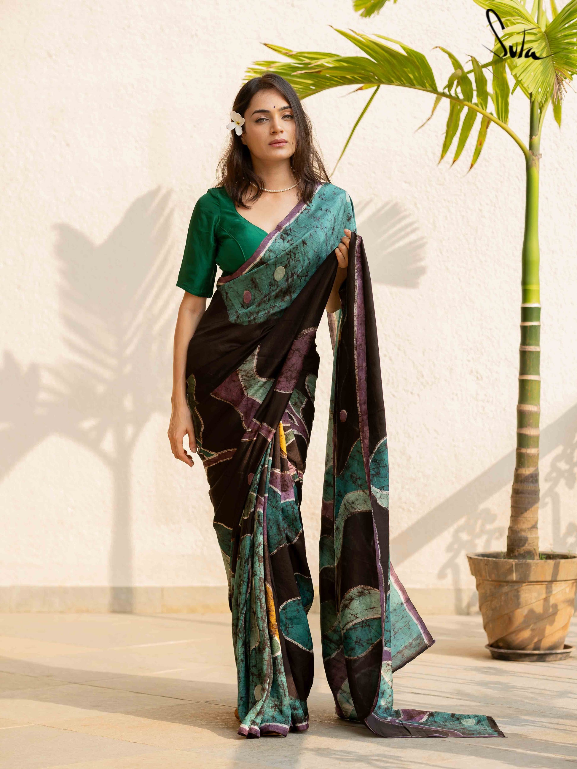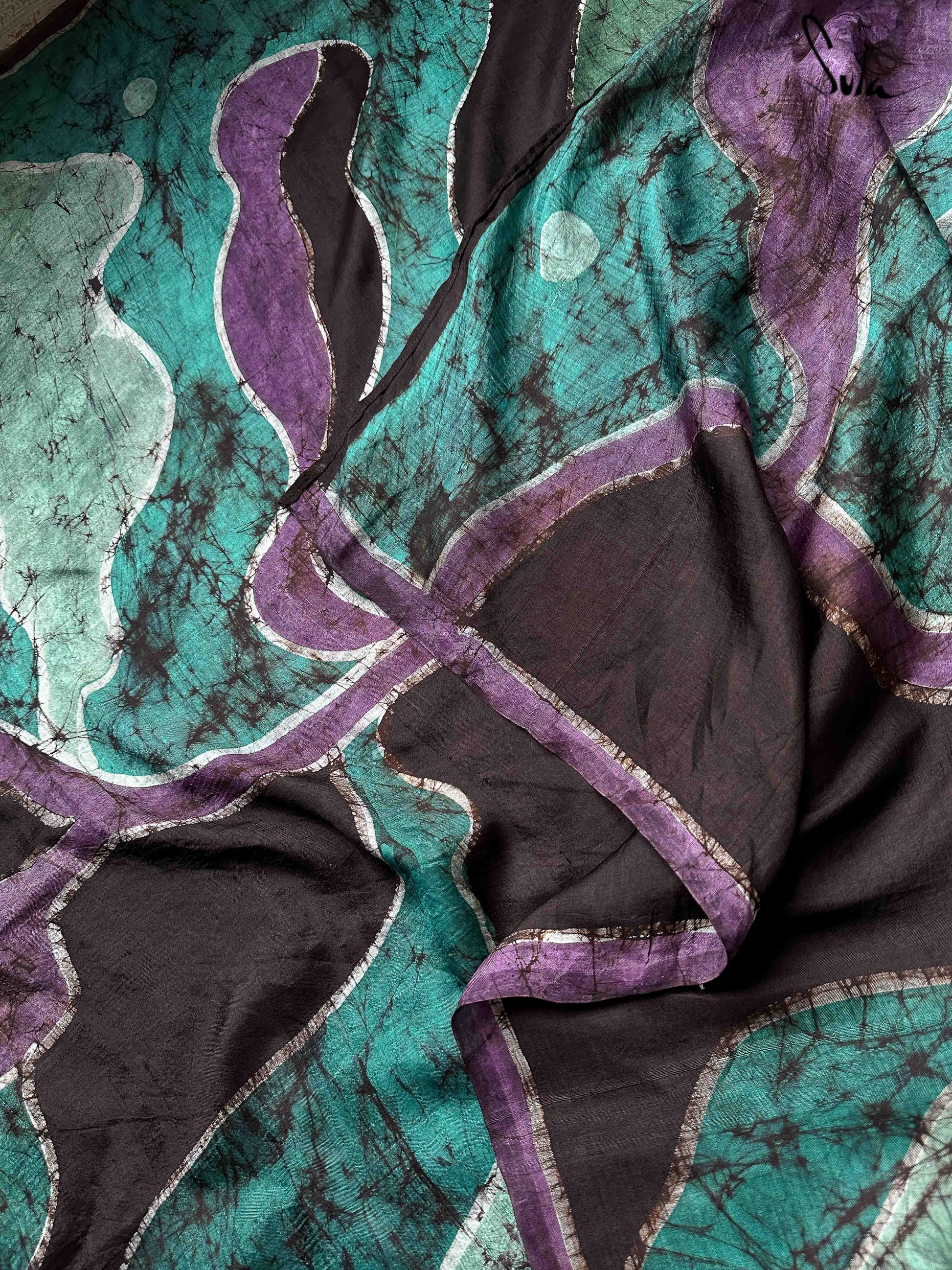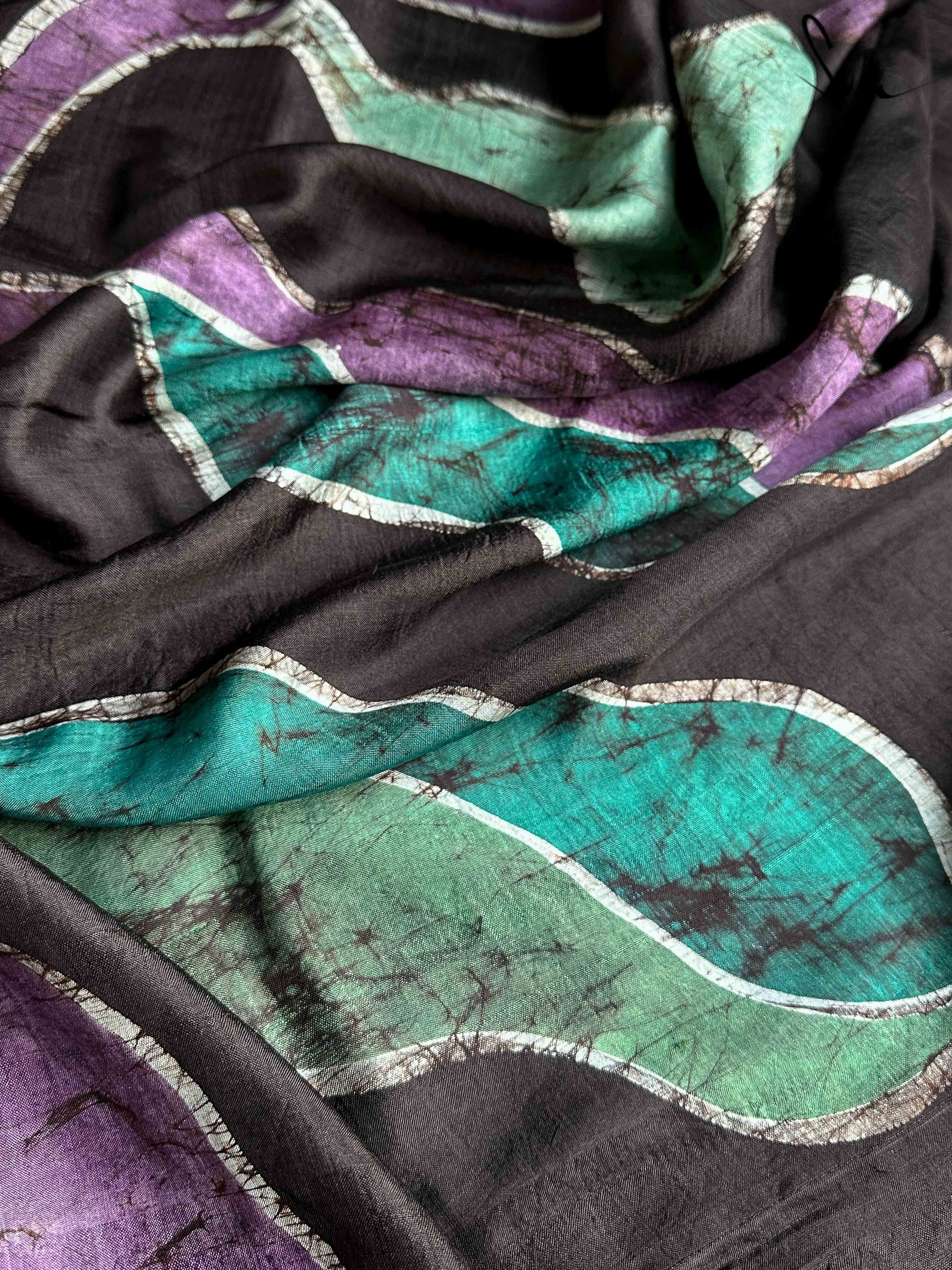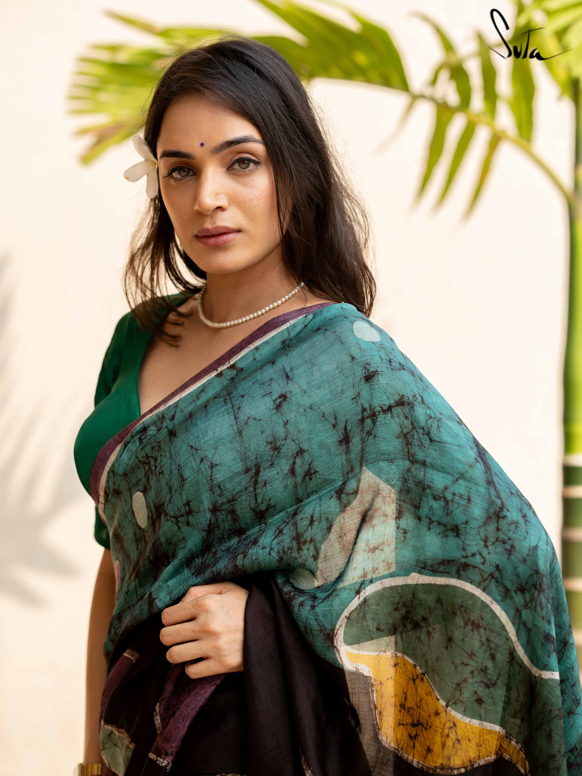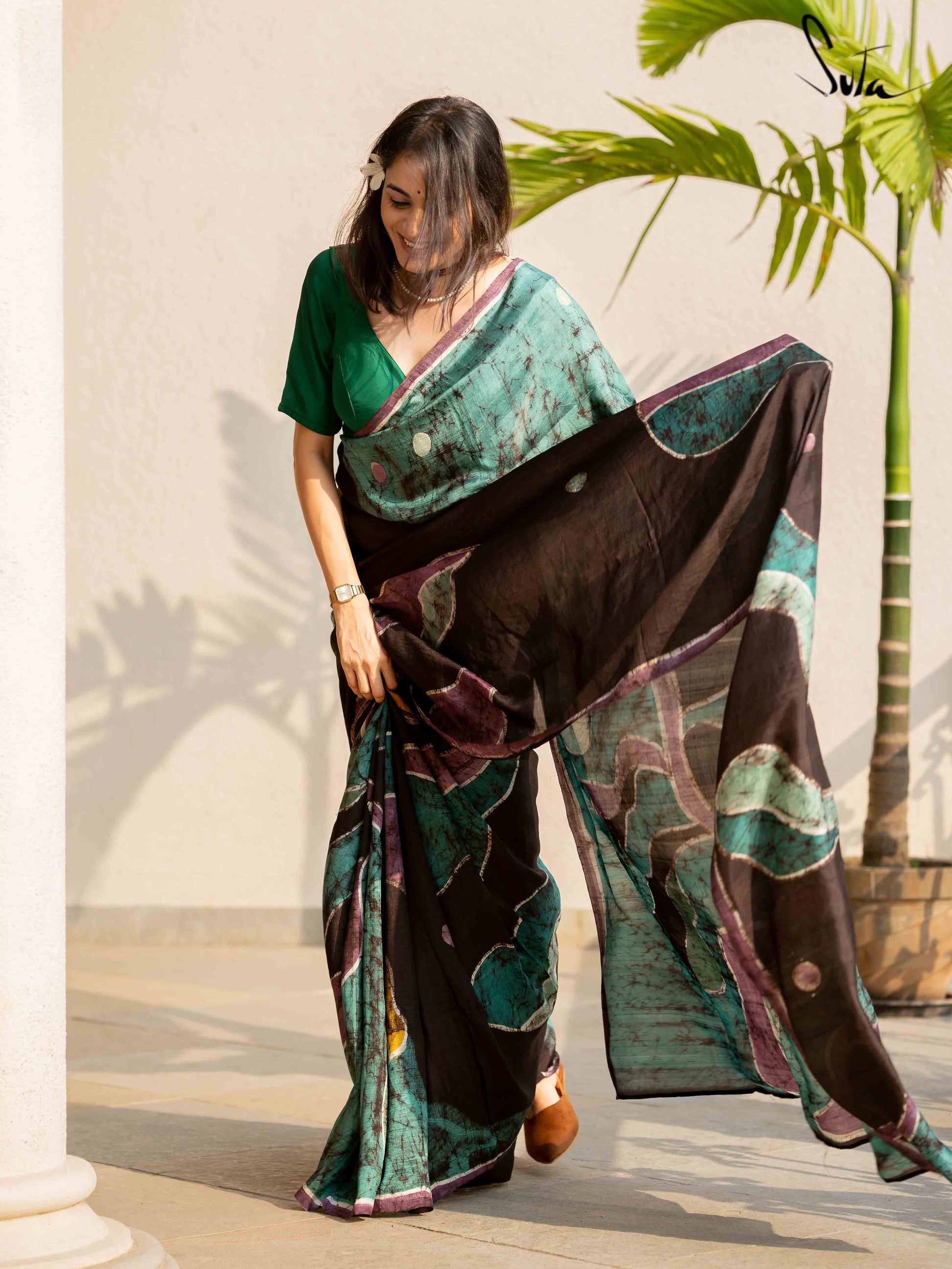 This is a gorgeous handcrafted batik saree in handloom mulberry silk with beautiful green and brown hues.
