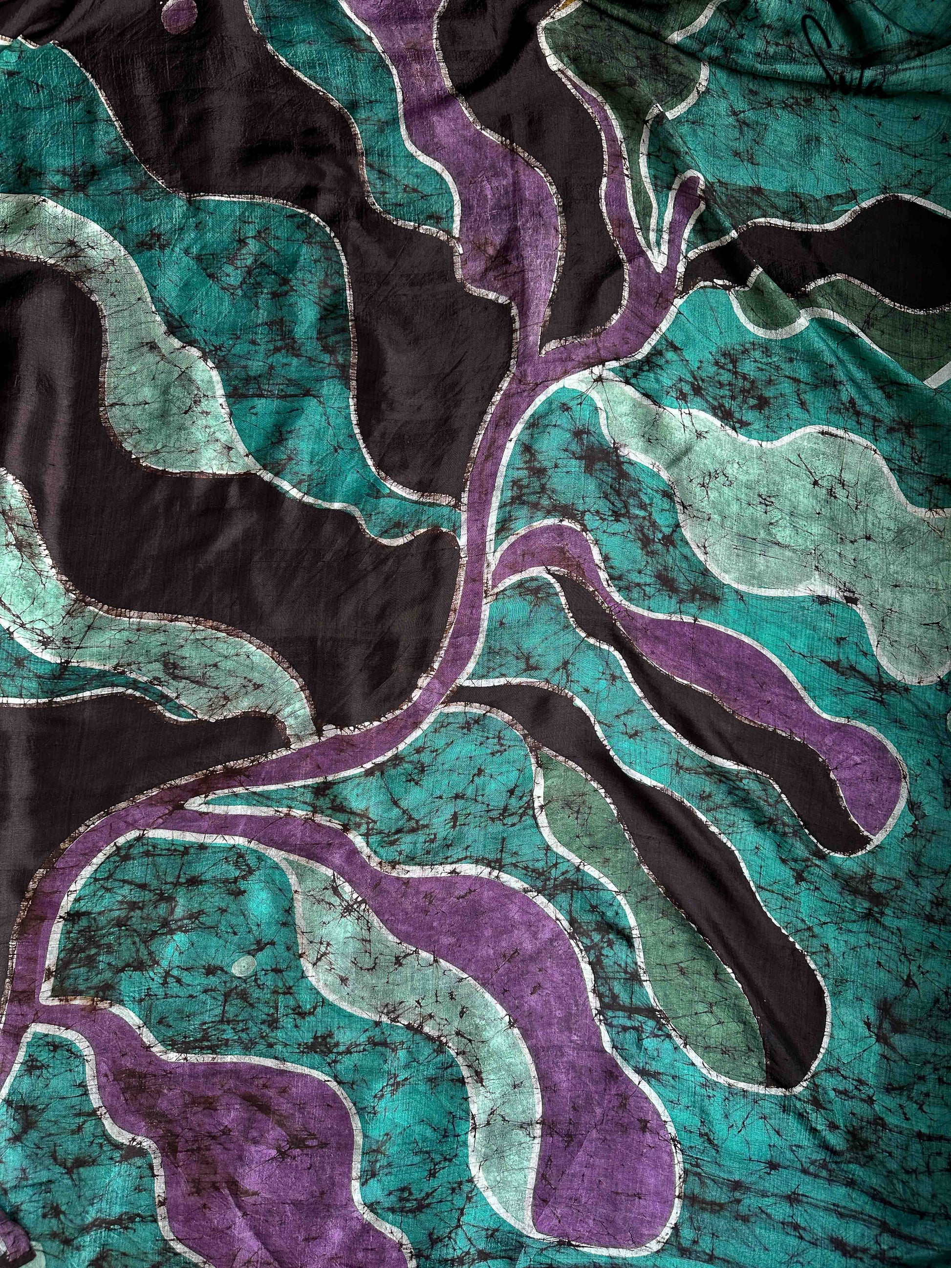 Batik is a wax-based resist-dying technique that is said to have originated in Java, Indonesia. To make a batik, hot wax is applied to selected areas of the design to create blocks. The cloth is then dipped in dye. The parts of the design covered in wax resist the dye and retain their original colour. This process is repeated several times to create elaborate and vibrant designs.