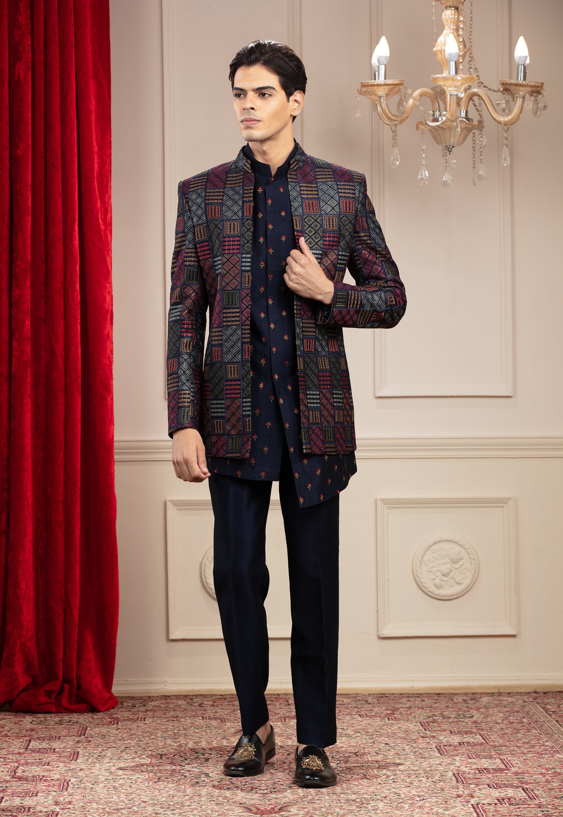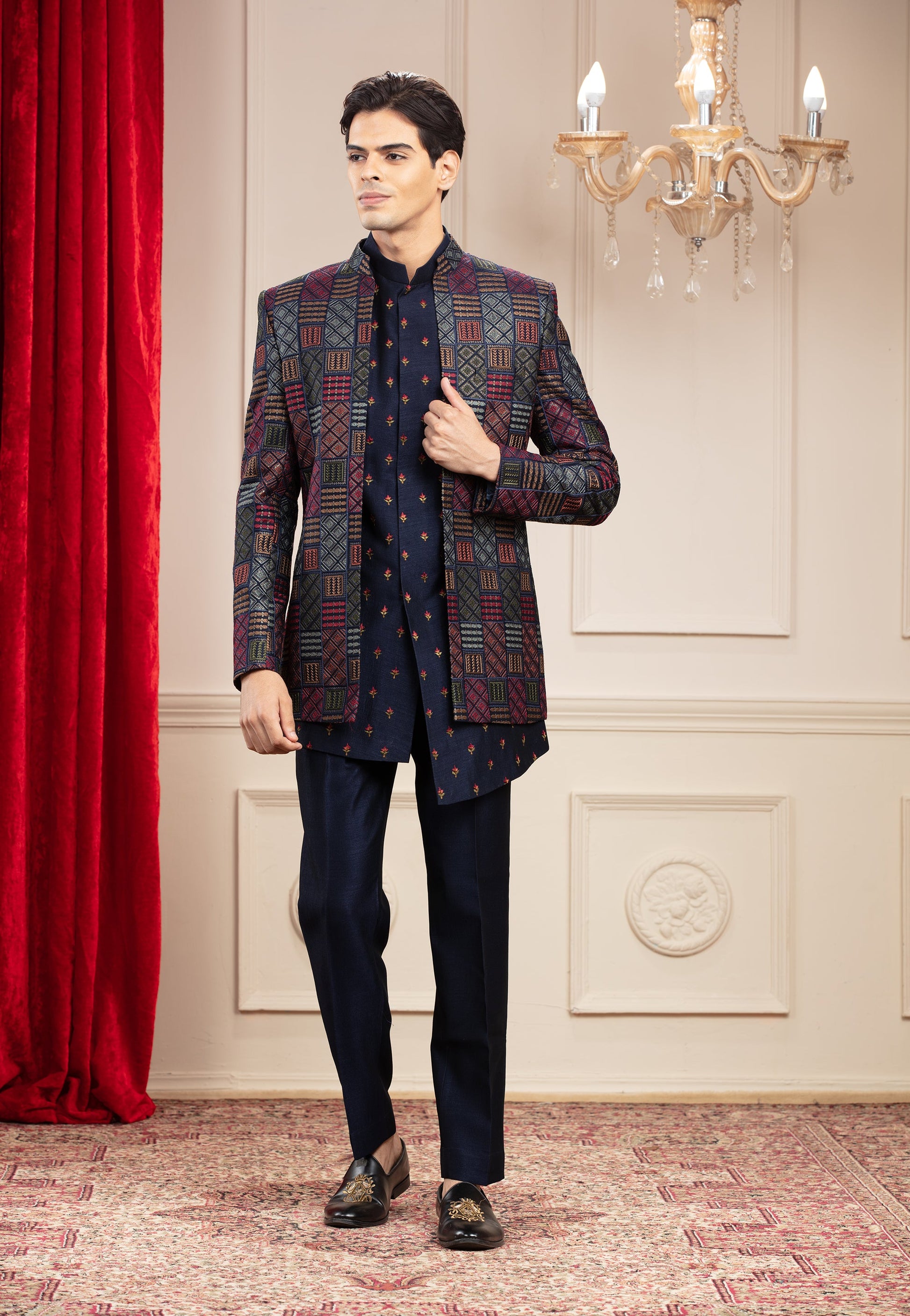 Explore modern elegance with our blue, resham kurta-pajama set and multicolour jacket, all from the Blue City, Jodhpur itself. We guarantee, you won't find another like this one.