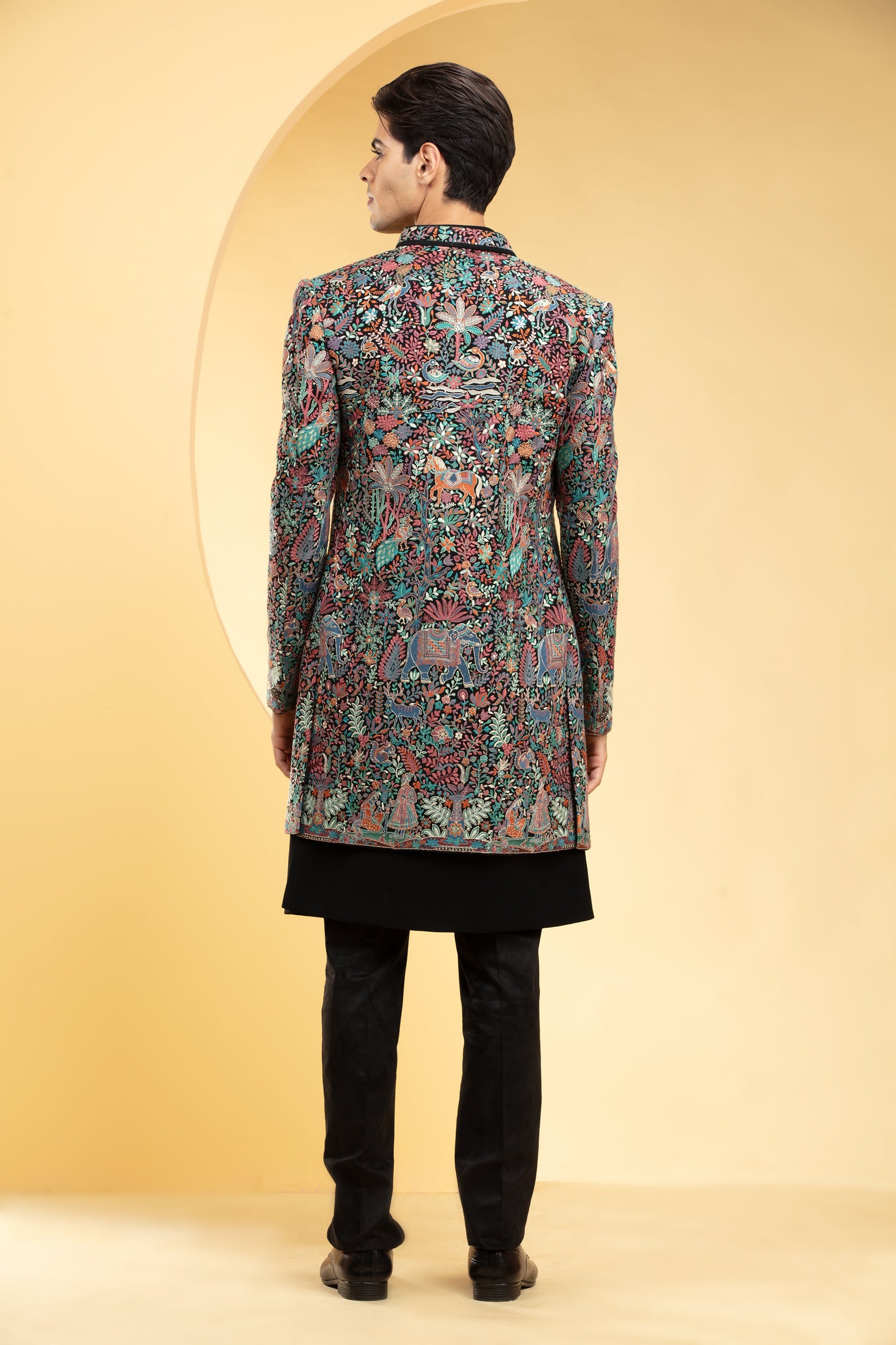 Multicolour Open Indo Western Set with multicolour hand work and metal buttons