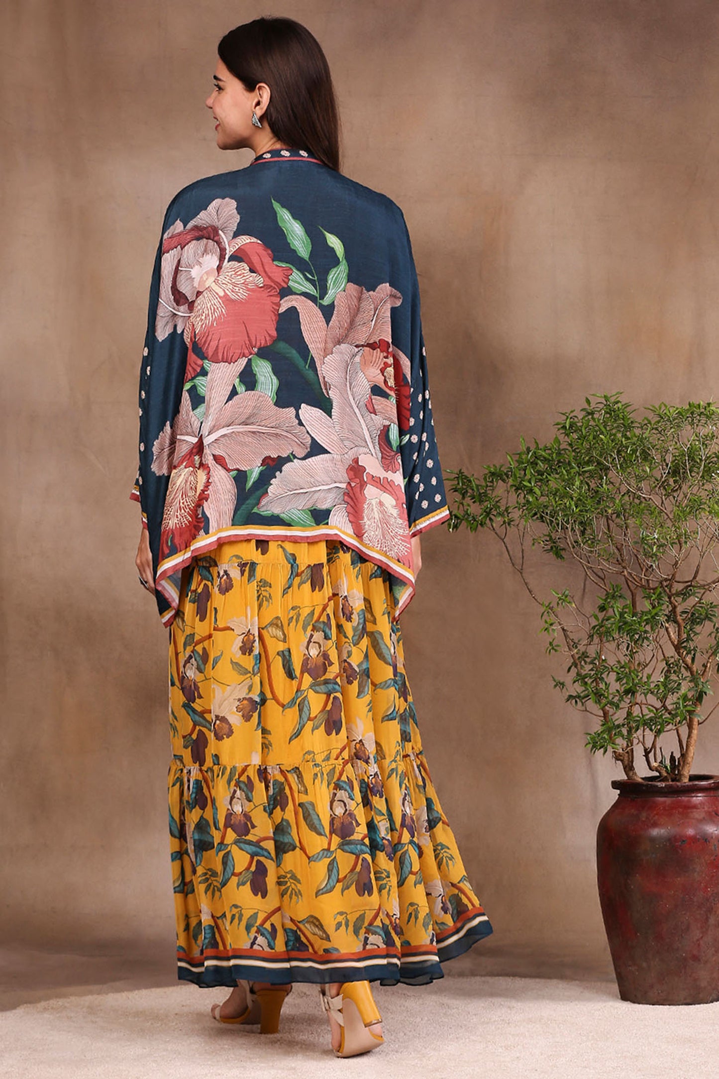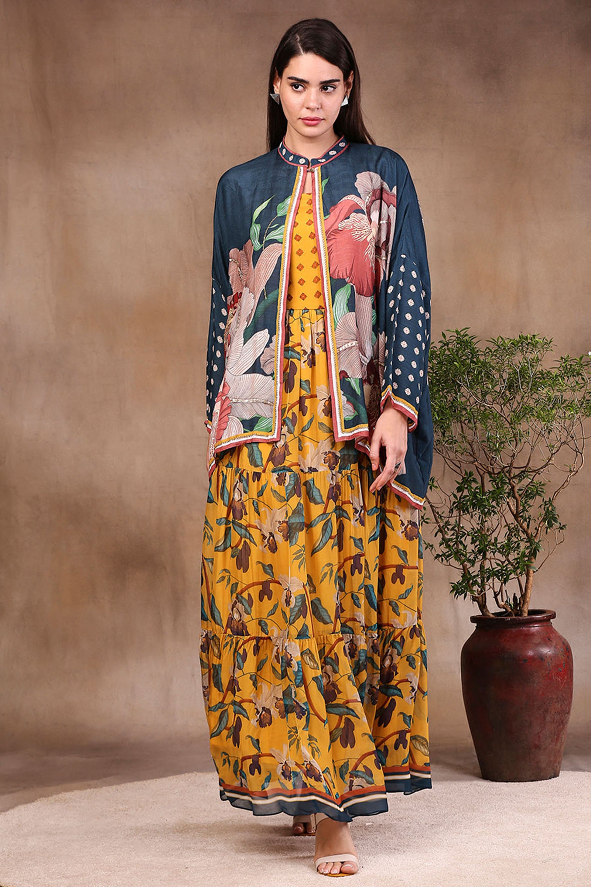 Mustard and bottle green Orchid Bloom Printed Long Dress With Jacket