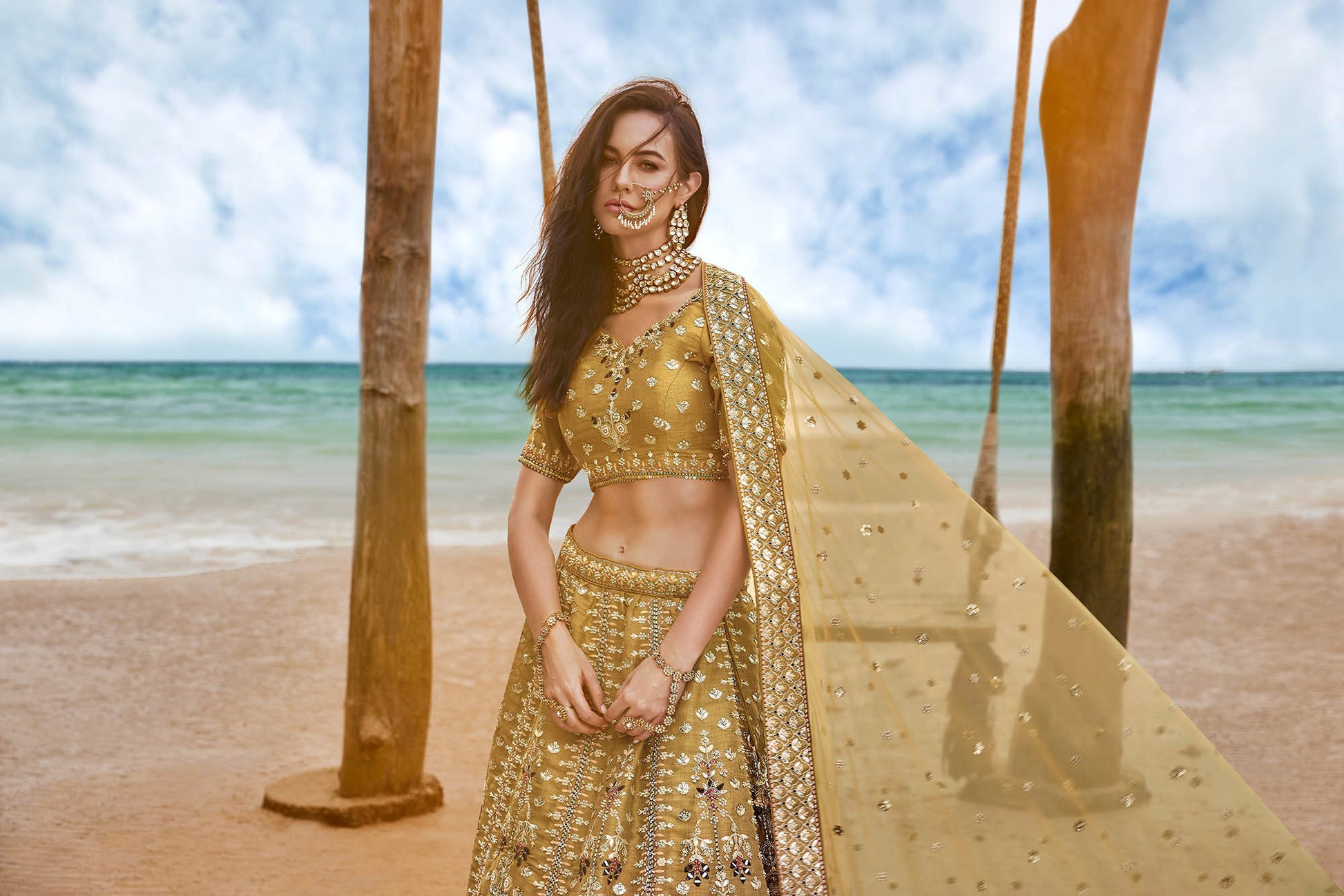 Mustard Bridal Net Sequins, Moti, Mirror and thread embroidery Lehenga