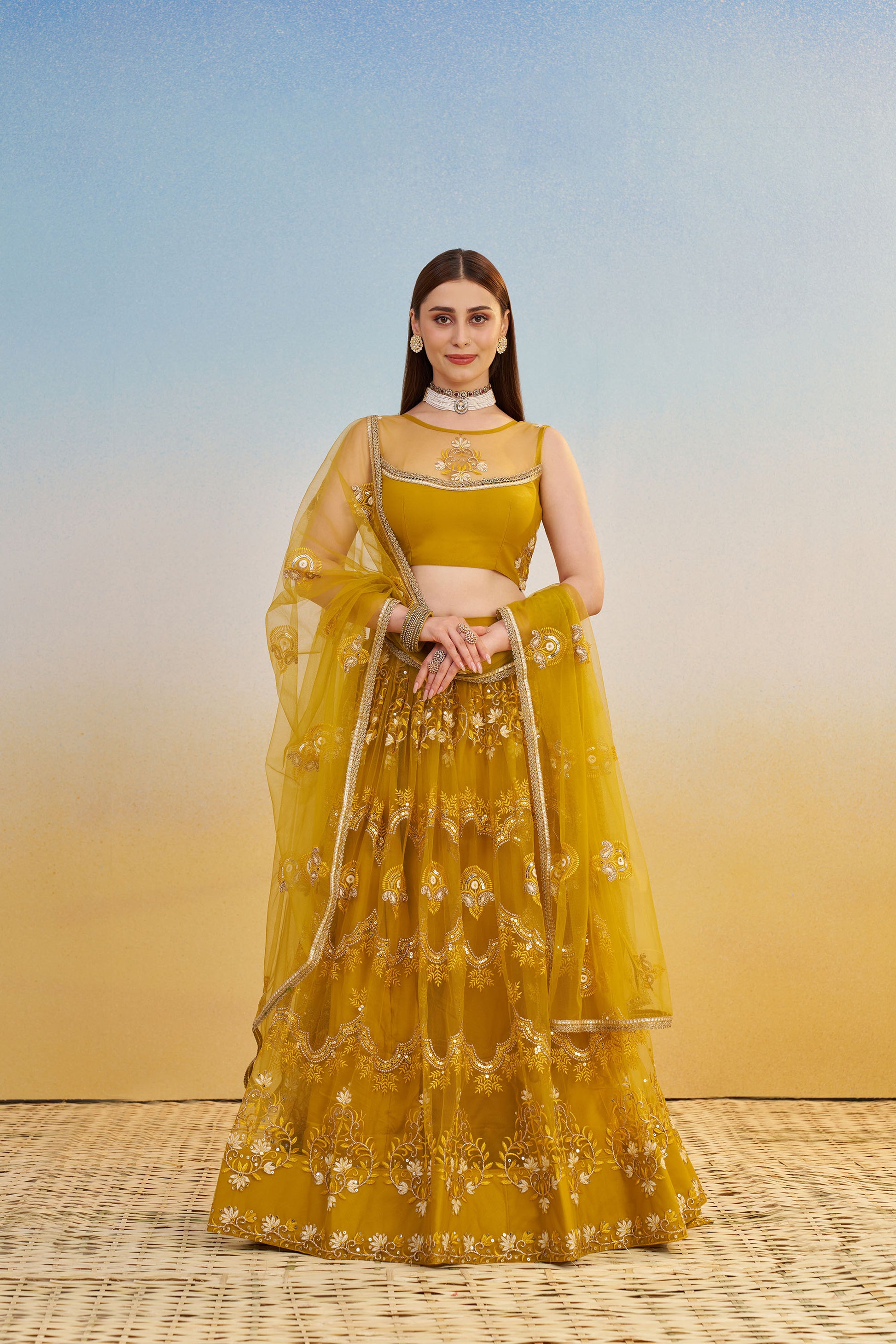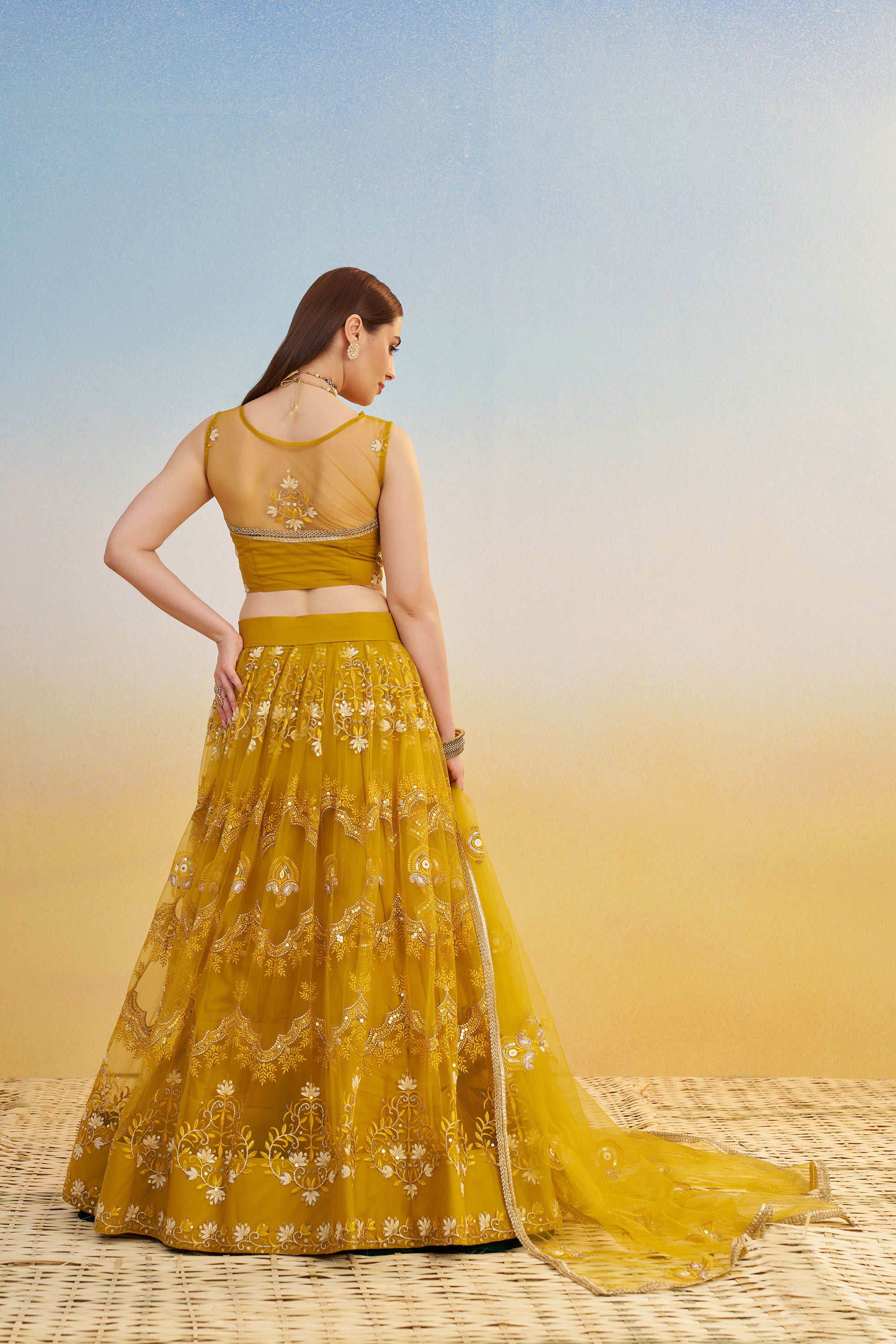 Mustard Yellow Butterfly Net Cotton Thread & Sequin Work Haldi Lehenga