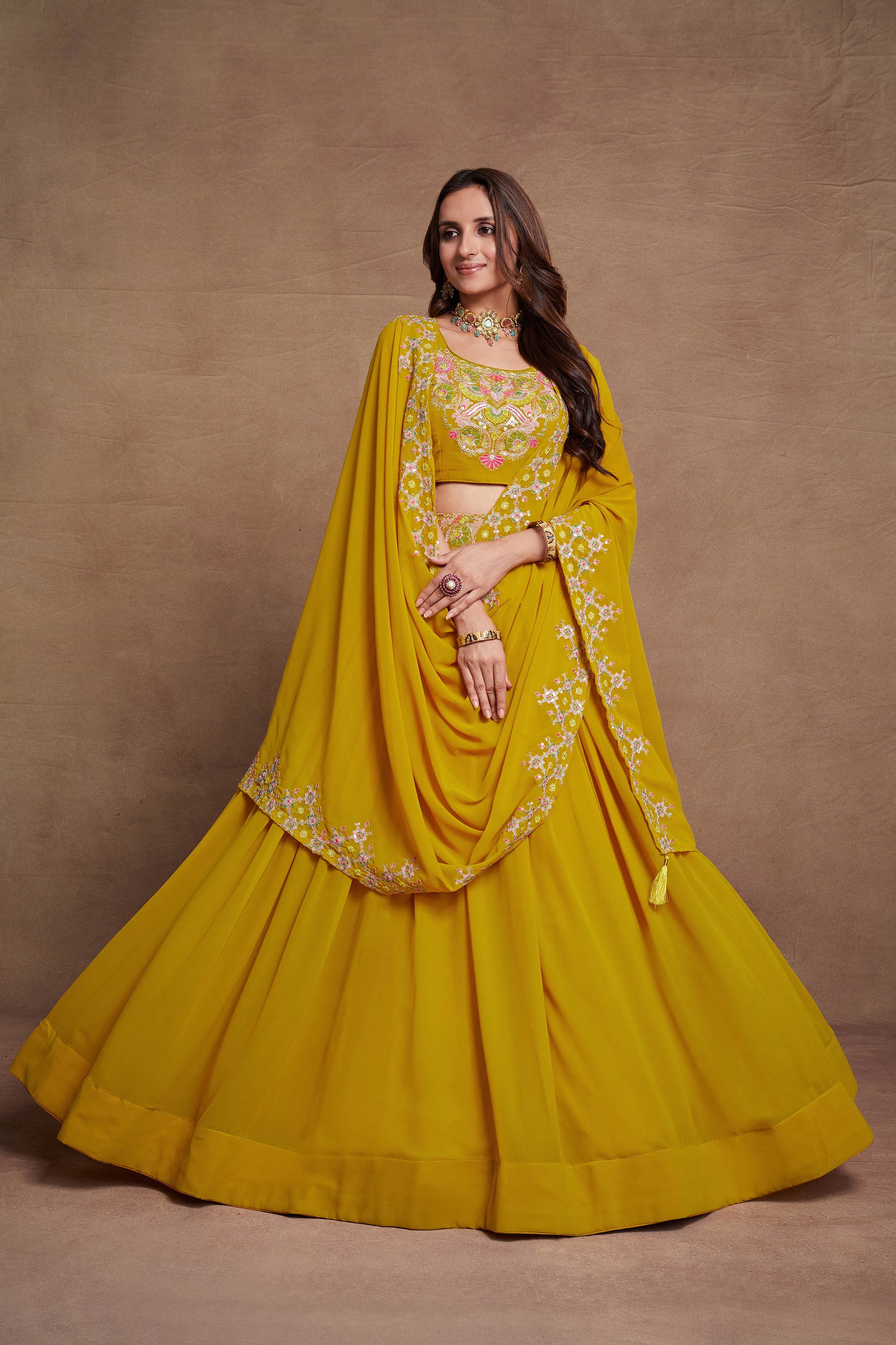 Mustard Yellow Georgette Thread Embroidery Lehenga
