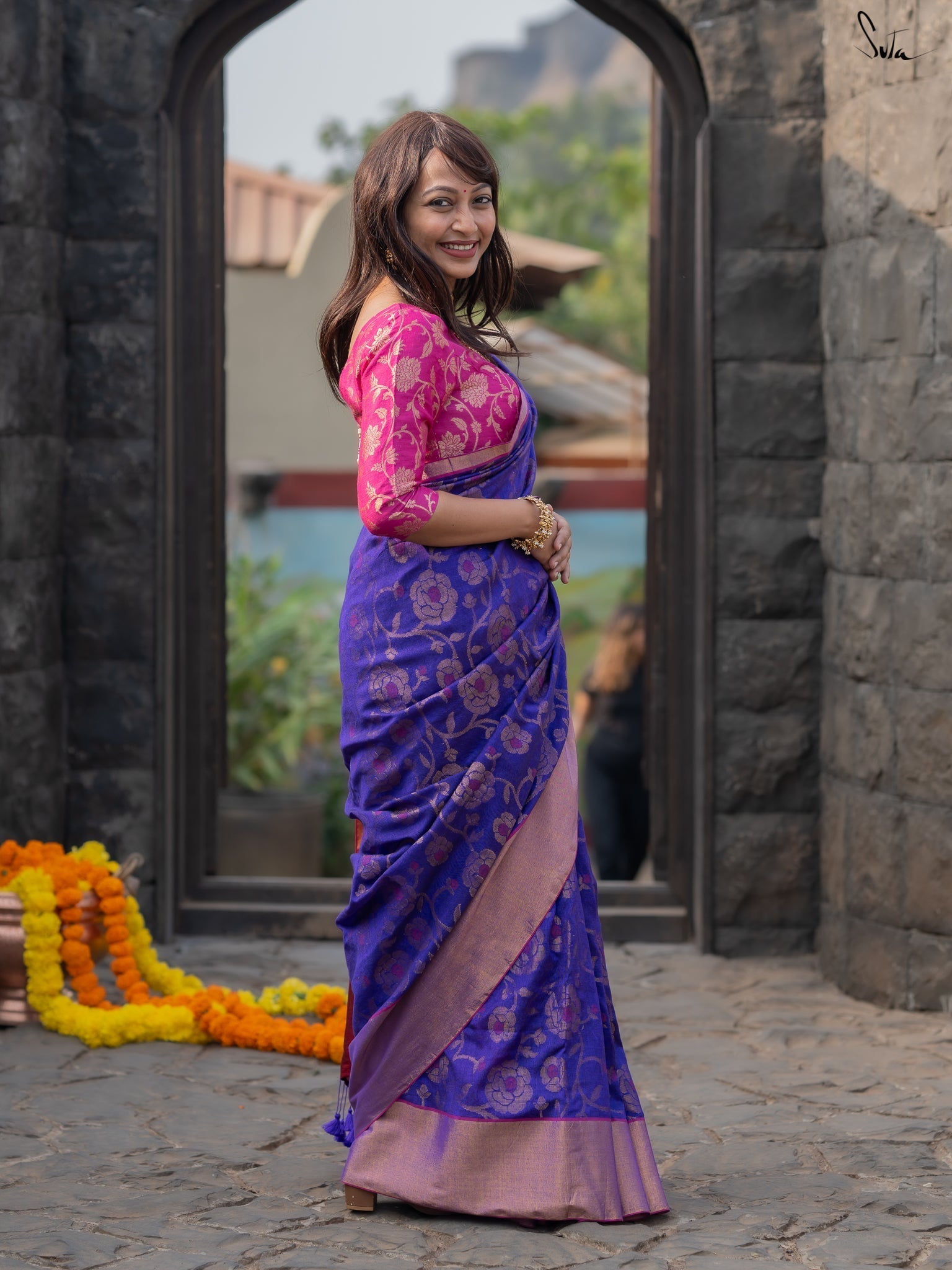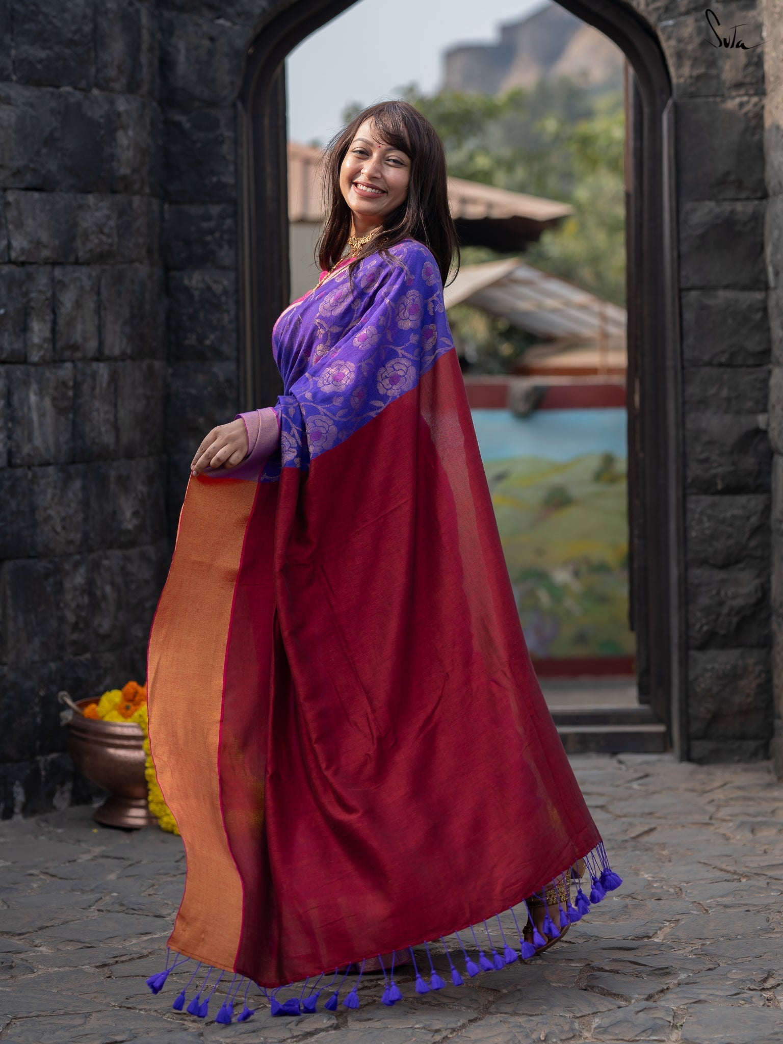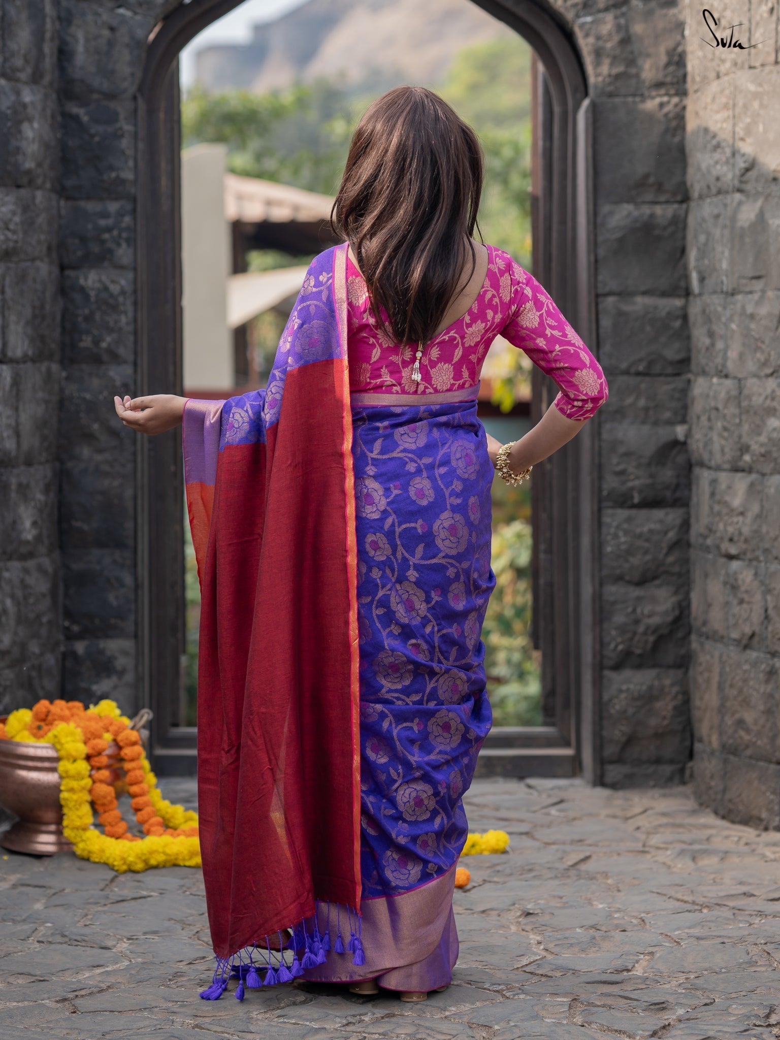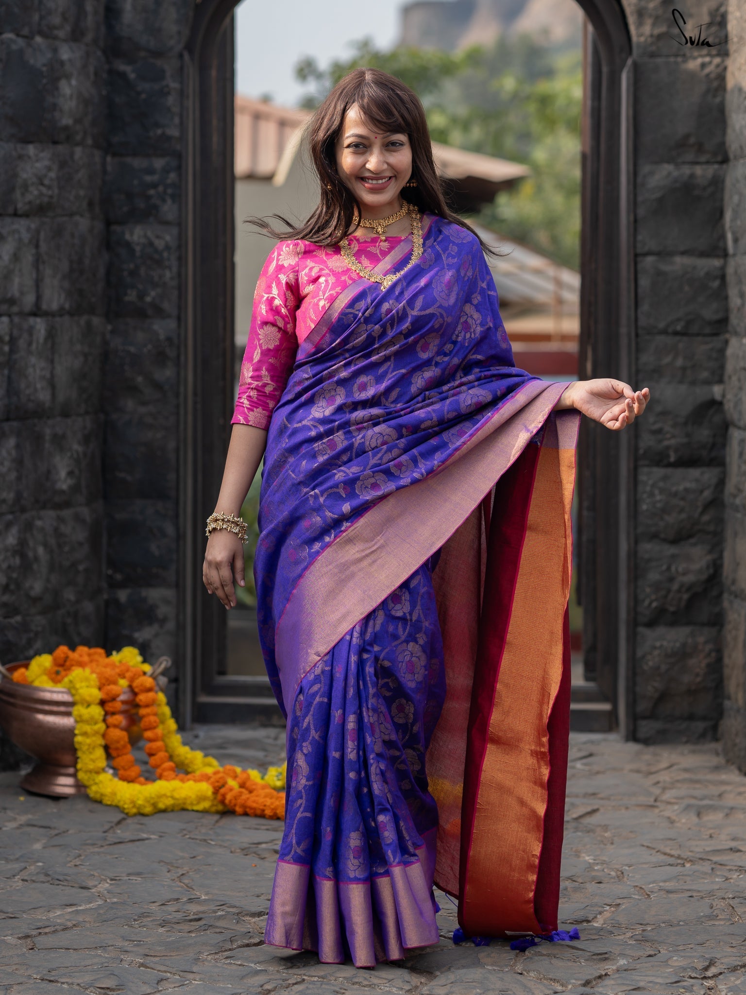 Expect to turn heads in this statement saree just the way you do it in your statement nathani. This purple and pink piece will make you stand out from the crowd.