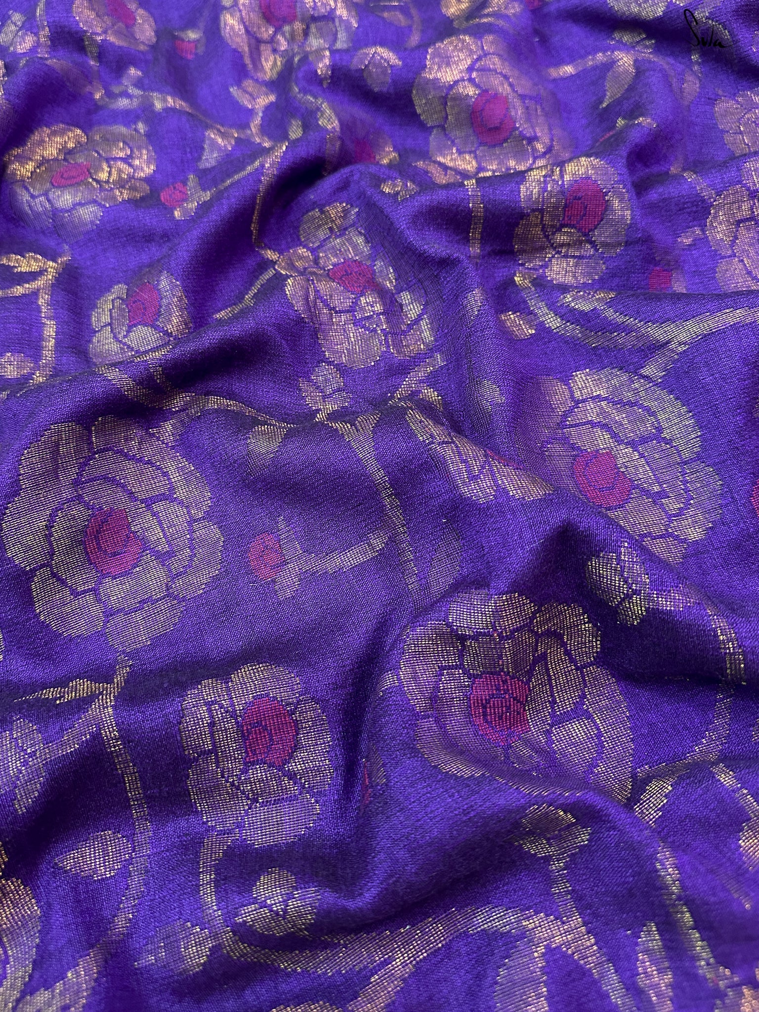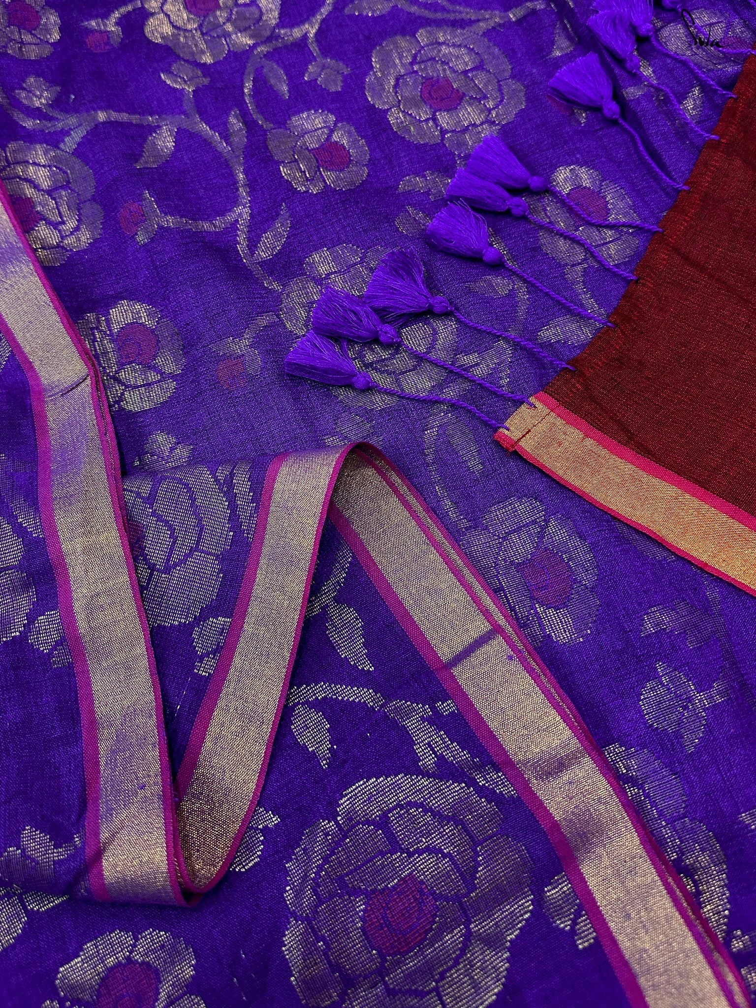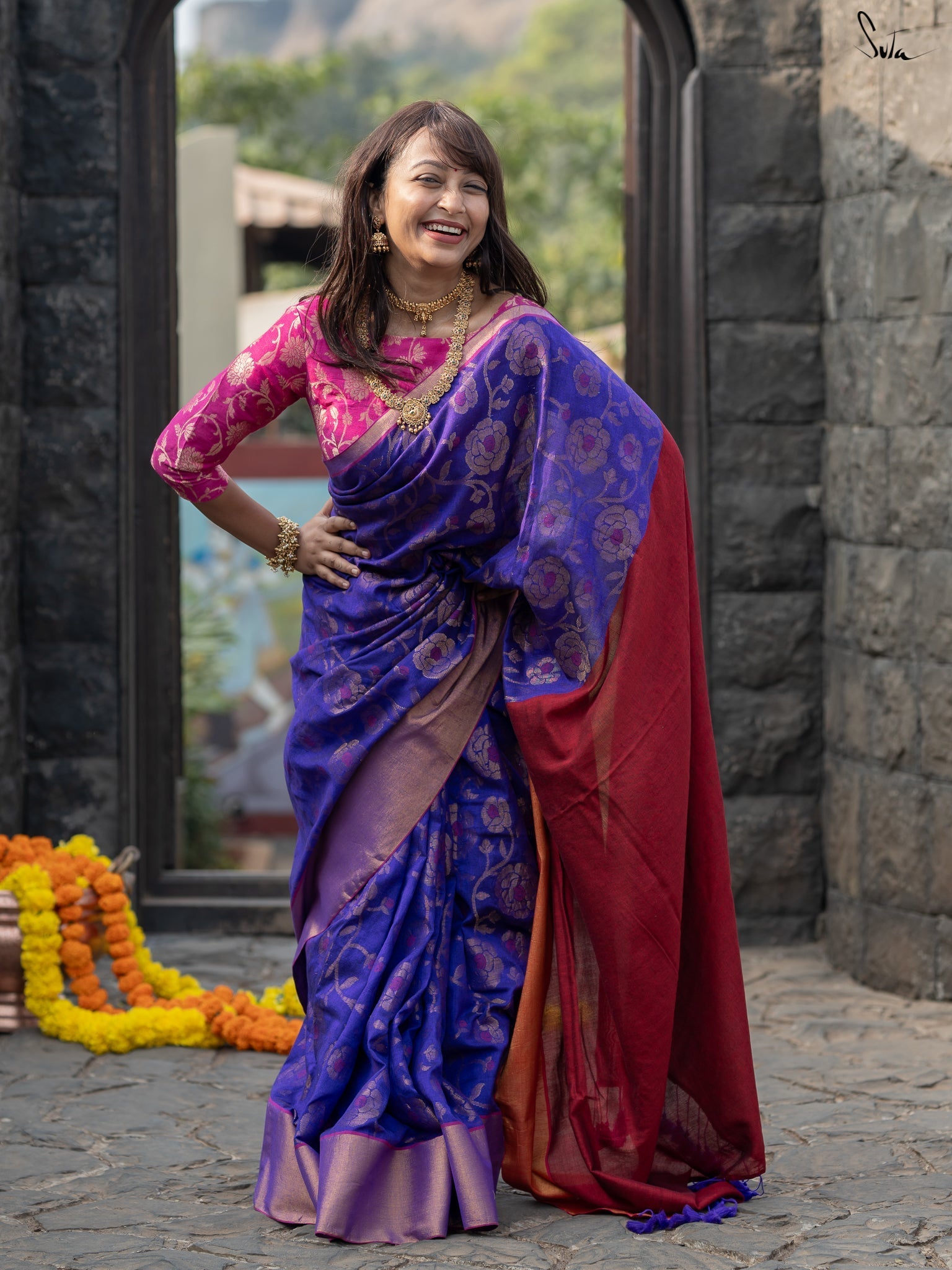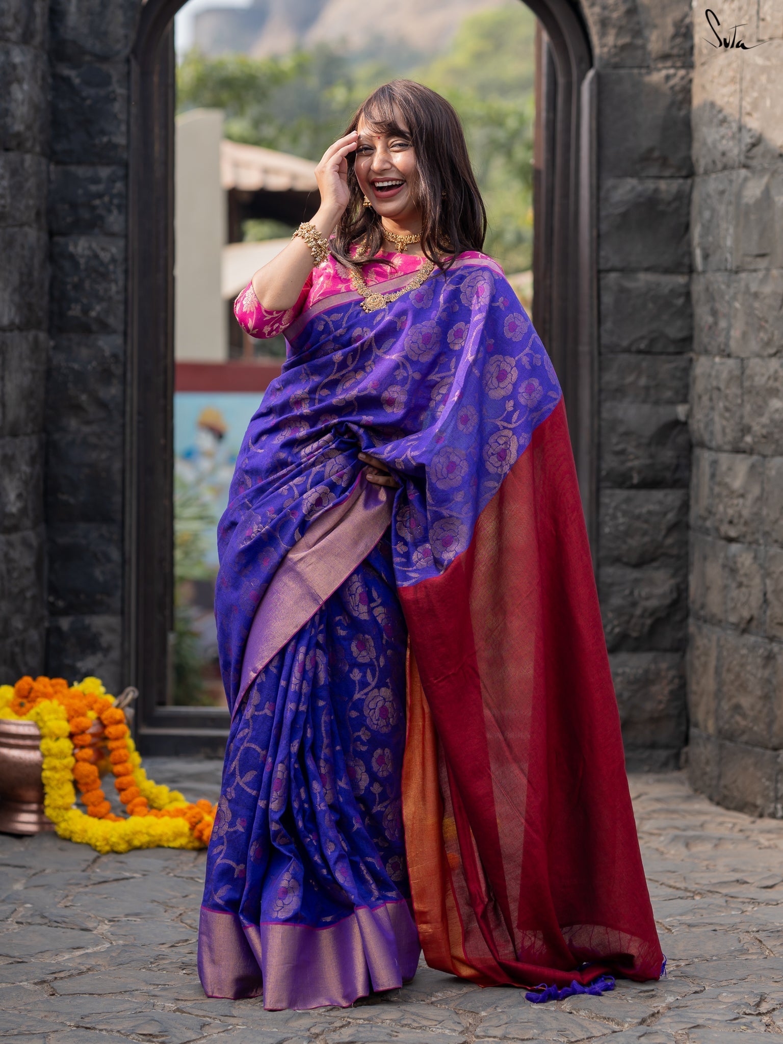 Expect to turn heads in this statement saree just the way you do it in your statement nathani. This purple and pink piece will make you stand out from the crowd.