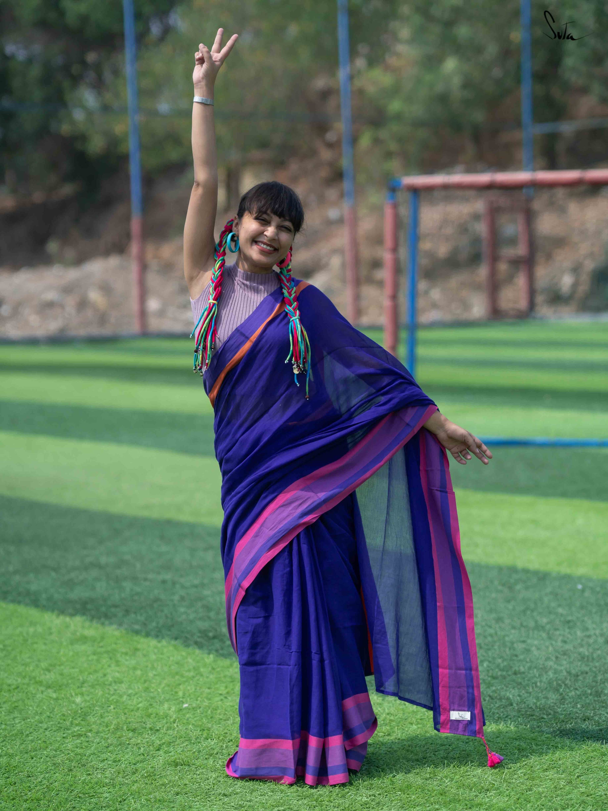 Sutas made-in-heaven mul cotton will befriend your skin in a wink. The buttery soft fabric is known for its delicate beauty. Its fine weave lends a fluid texture to the fabric, which makes draping just so easy. This breezy summer-friendly beauty has been brought to life with contrast borders, the thickness of which have been achieved with a unique interplay of warp and weft.