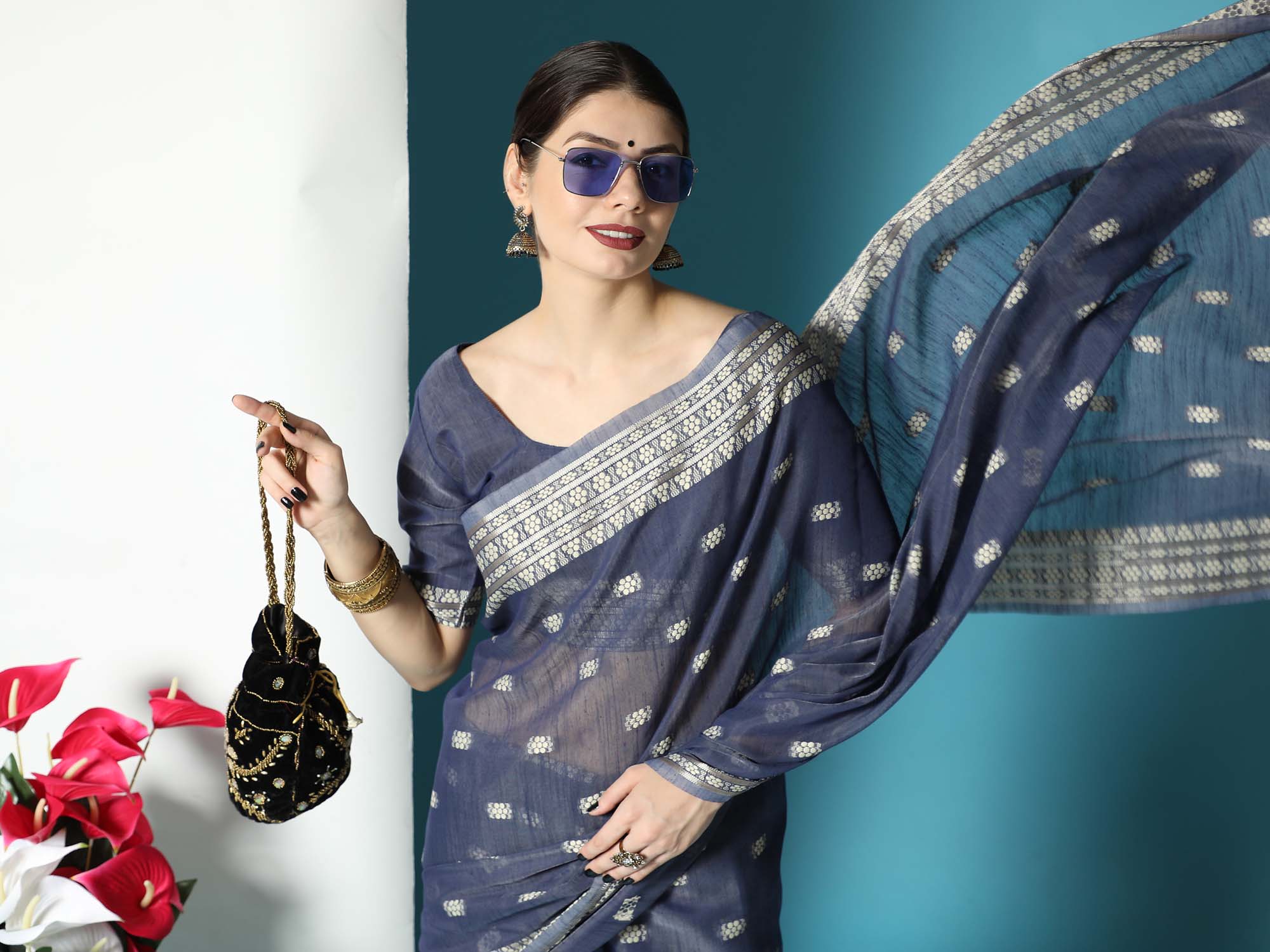 Navy Blue Chikankari Woven Lucknowi Cotton Saree