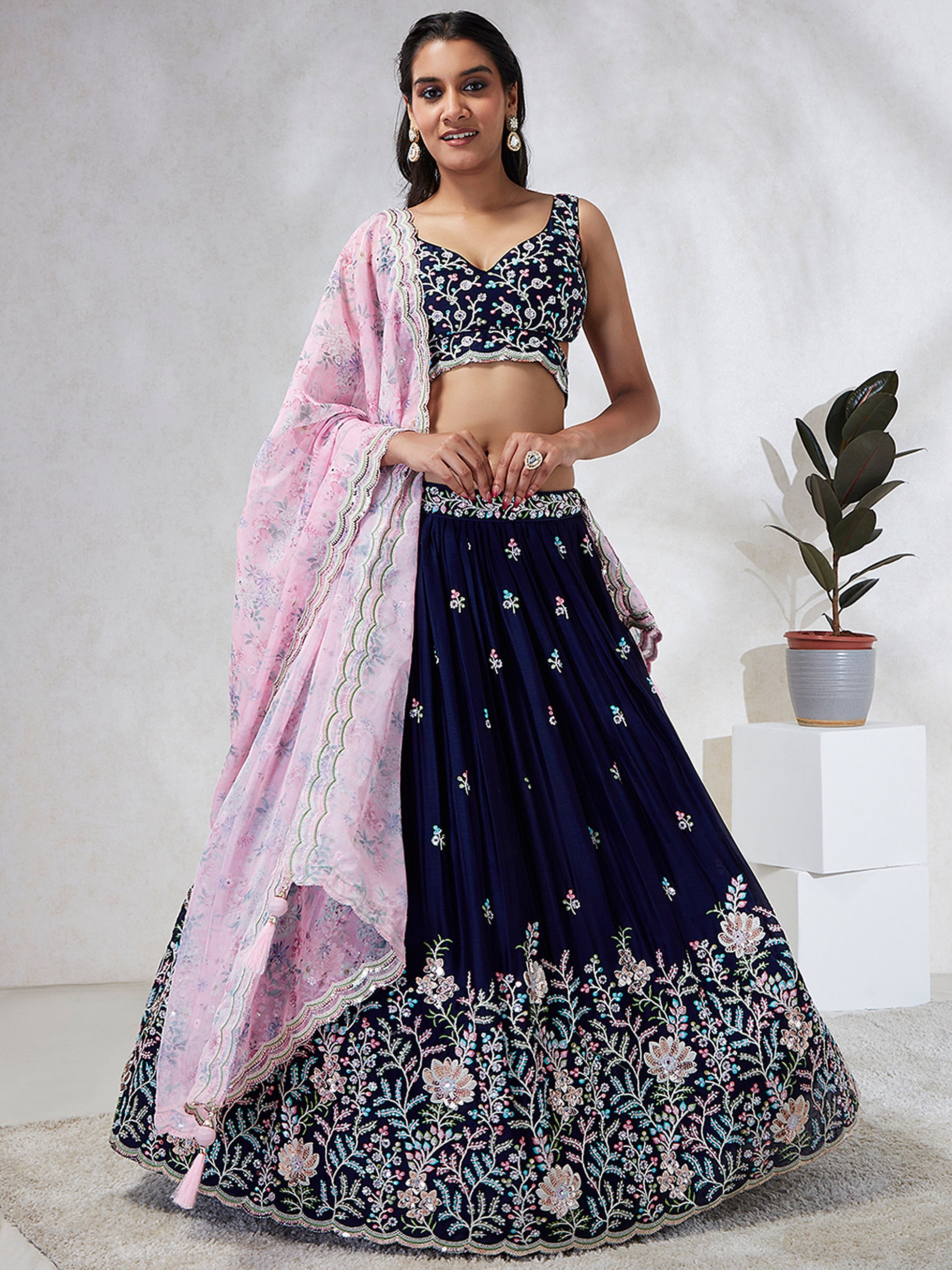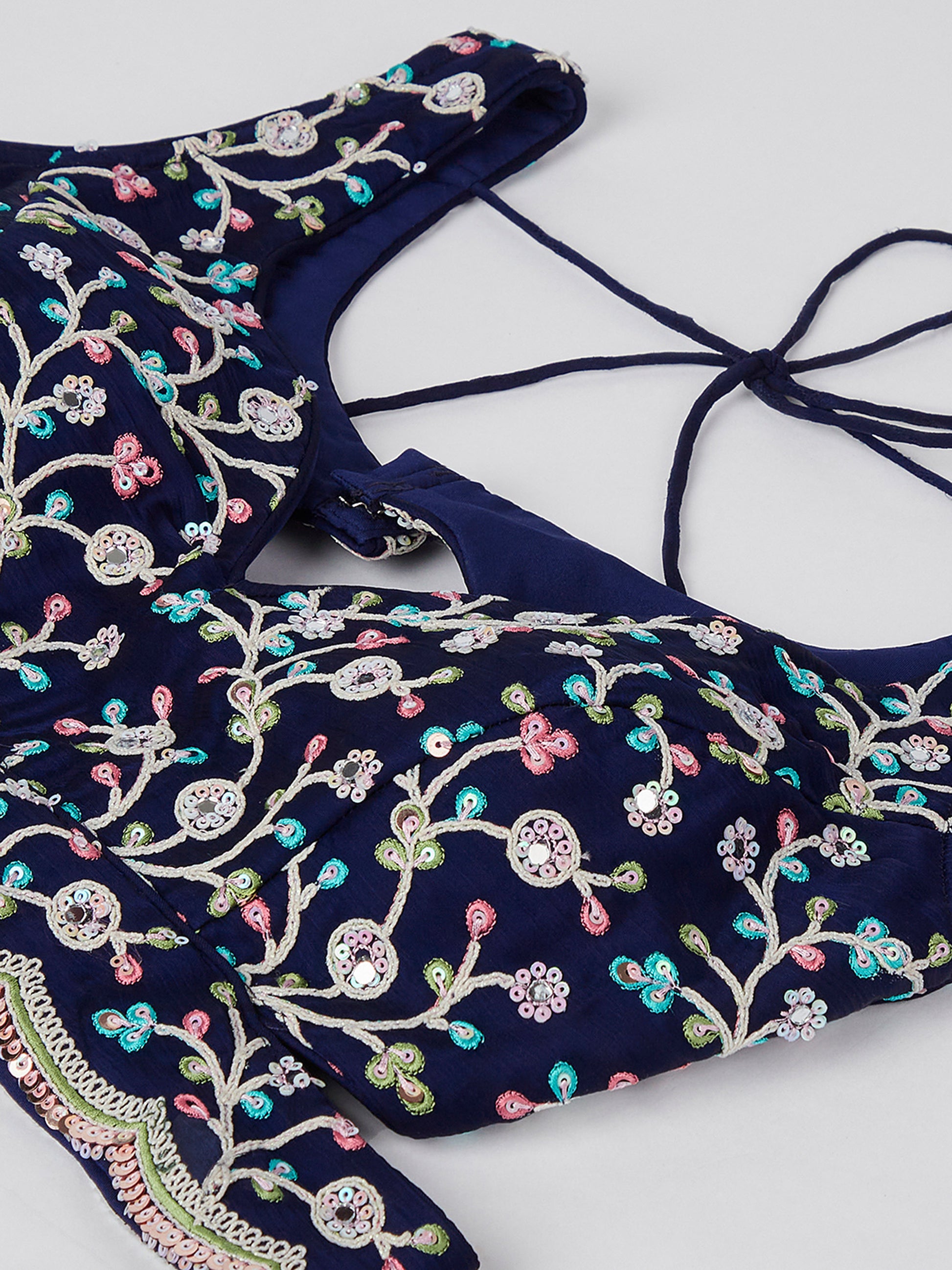 Navy Blue Georgette Sequins, Mirror and thread embroidery Lehenga