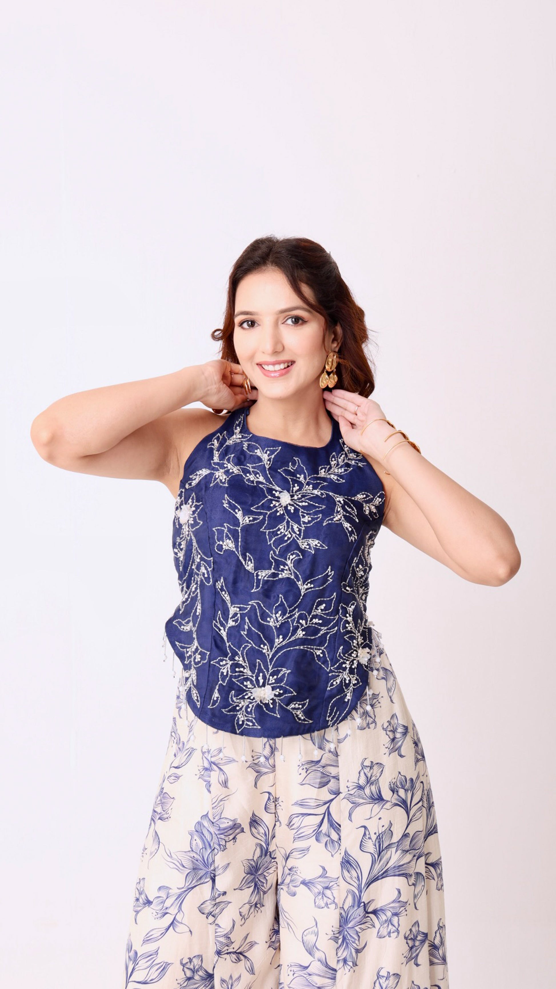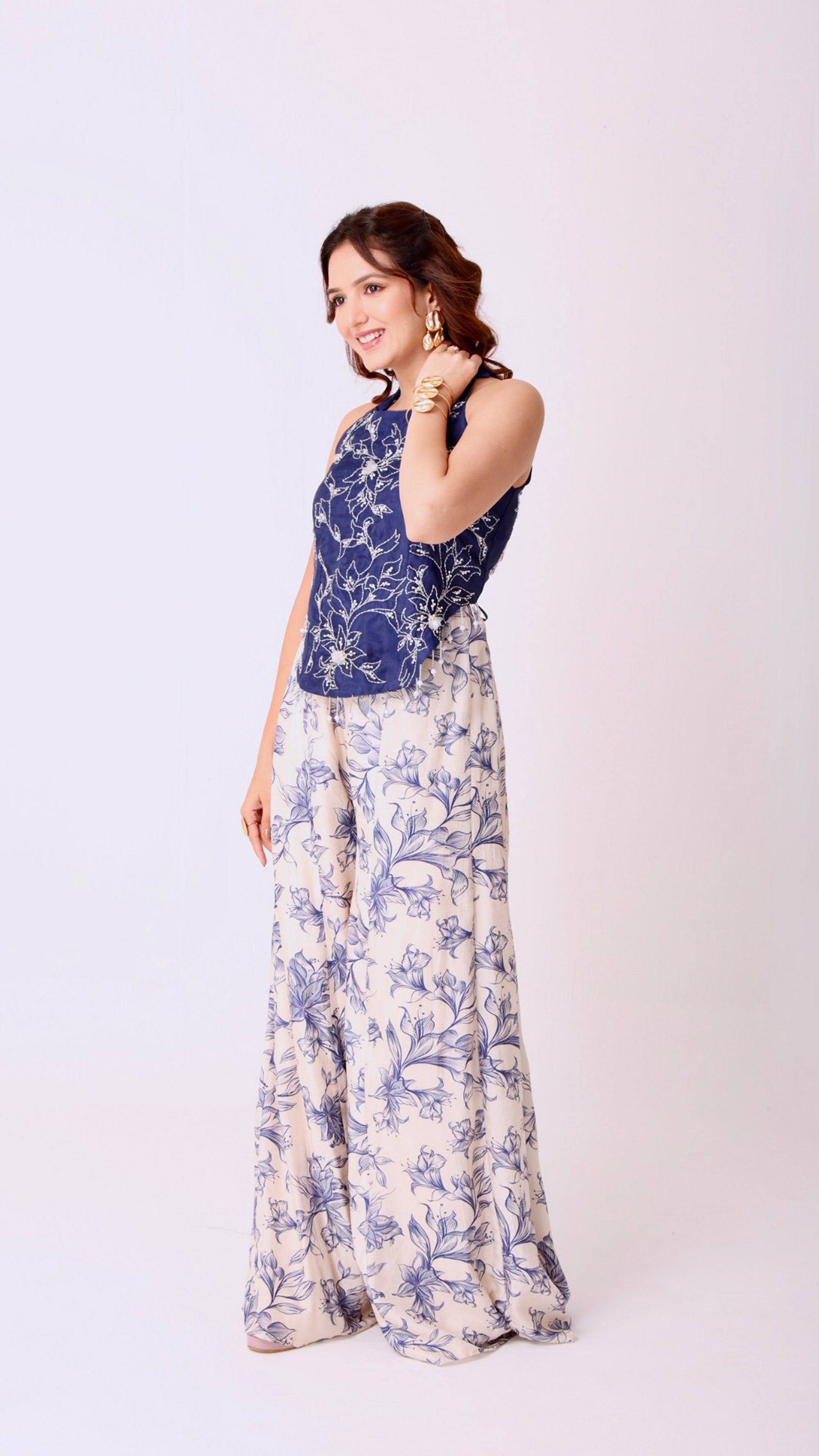Navy organza hand-embroidered halter top with flowy ivory floral kali pants