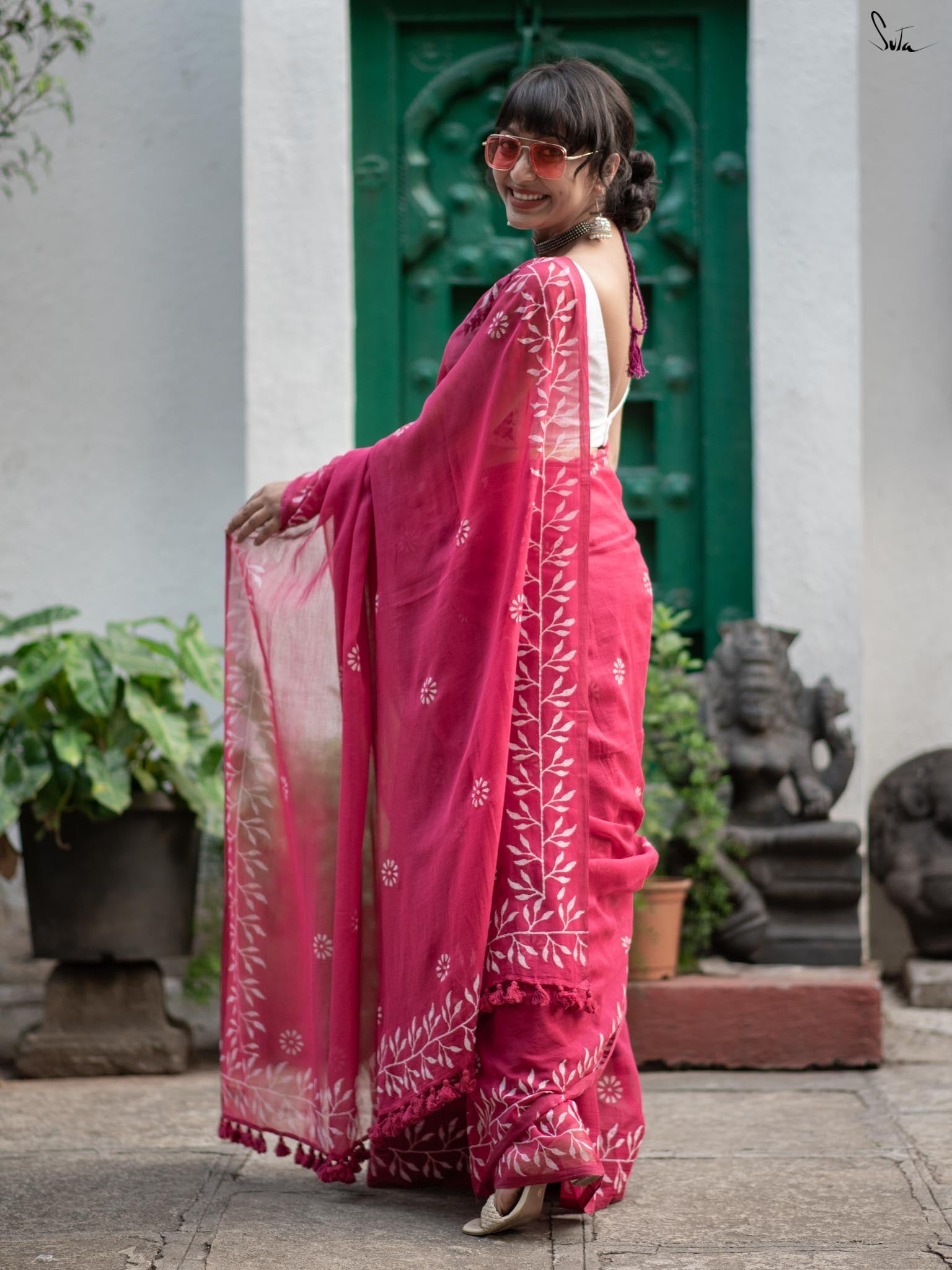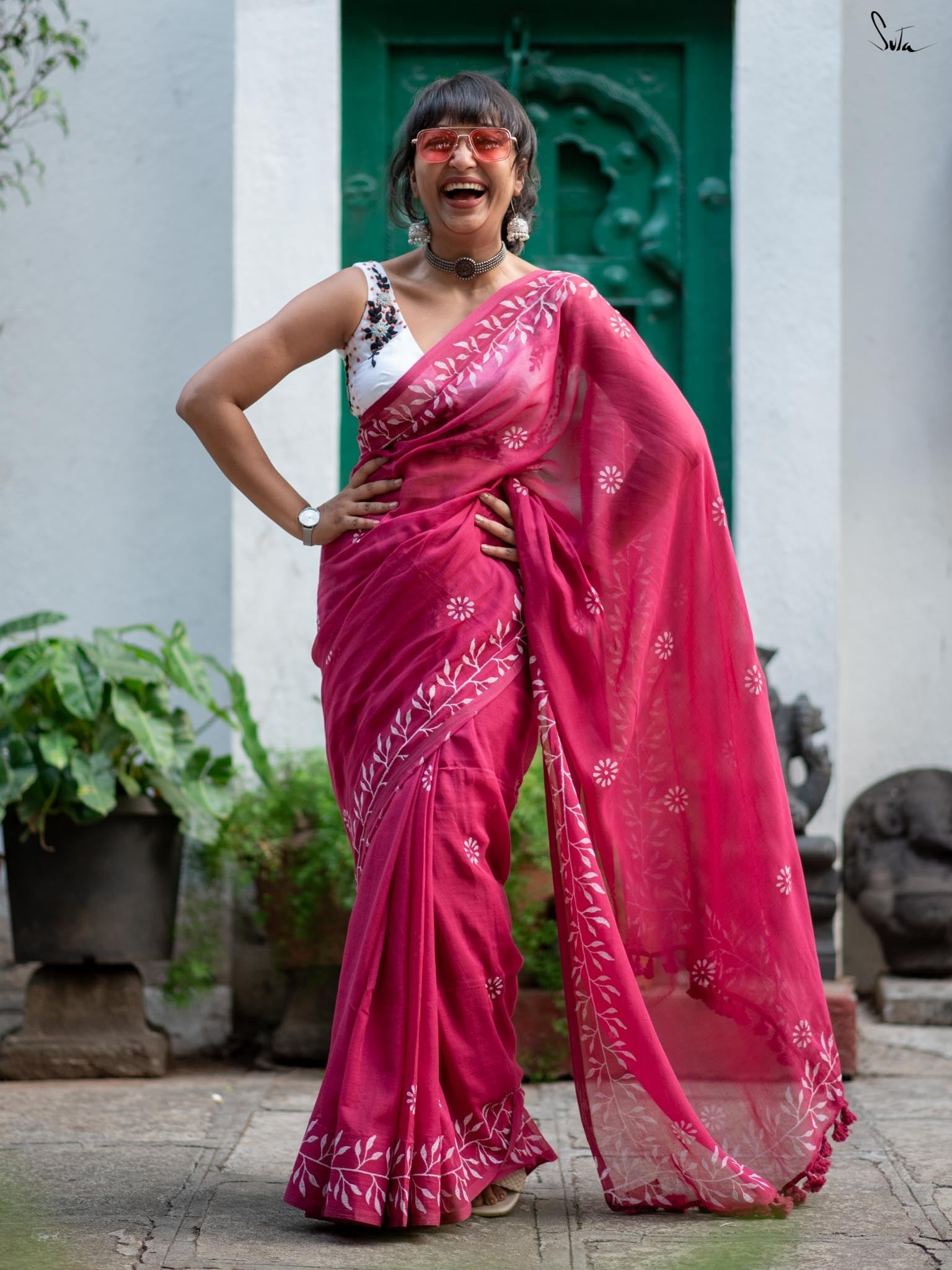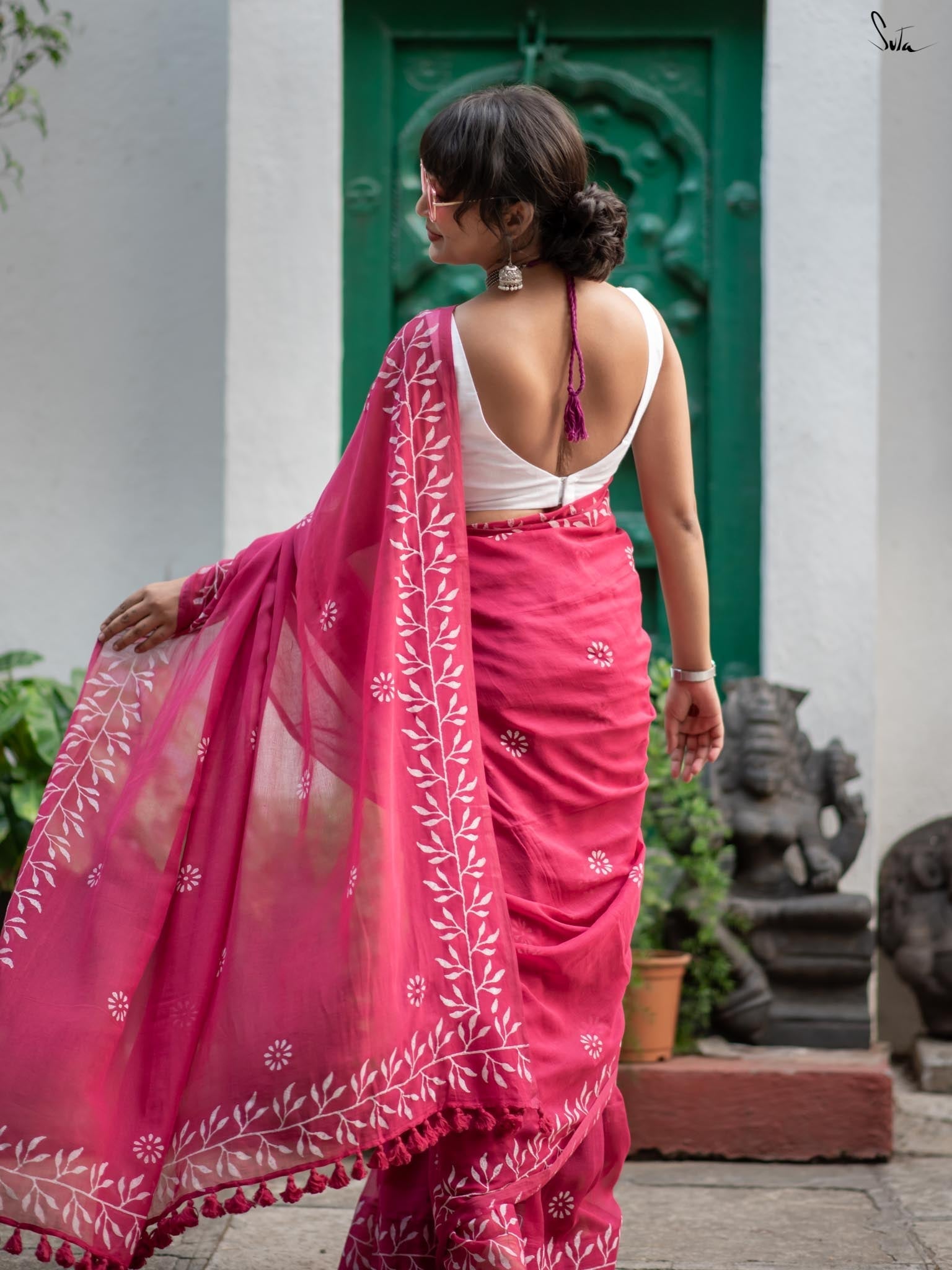 Nebula Night wraps you in sheer magic. This gorgeous pink and white saree, crafted from soft, breathable mul cotton, features stunning floral prints that are sure to steal the spotlight. Perfect for any occasion where you want to make a statement, Nebula Night lets you spread love and capture hearts with every step.