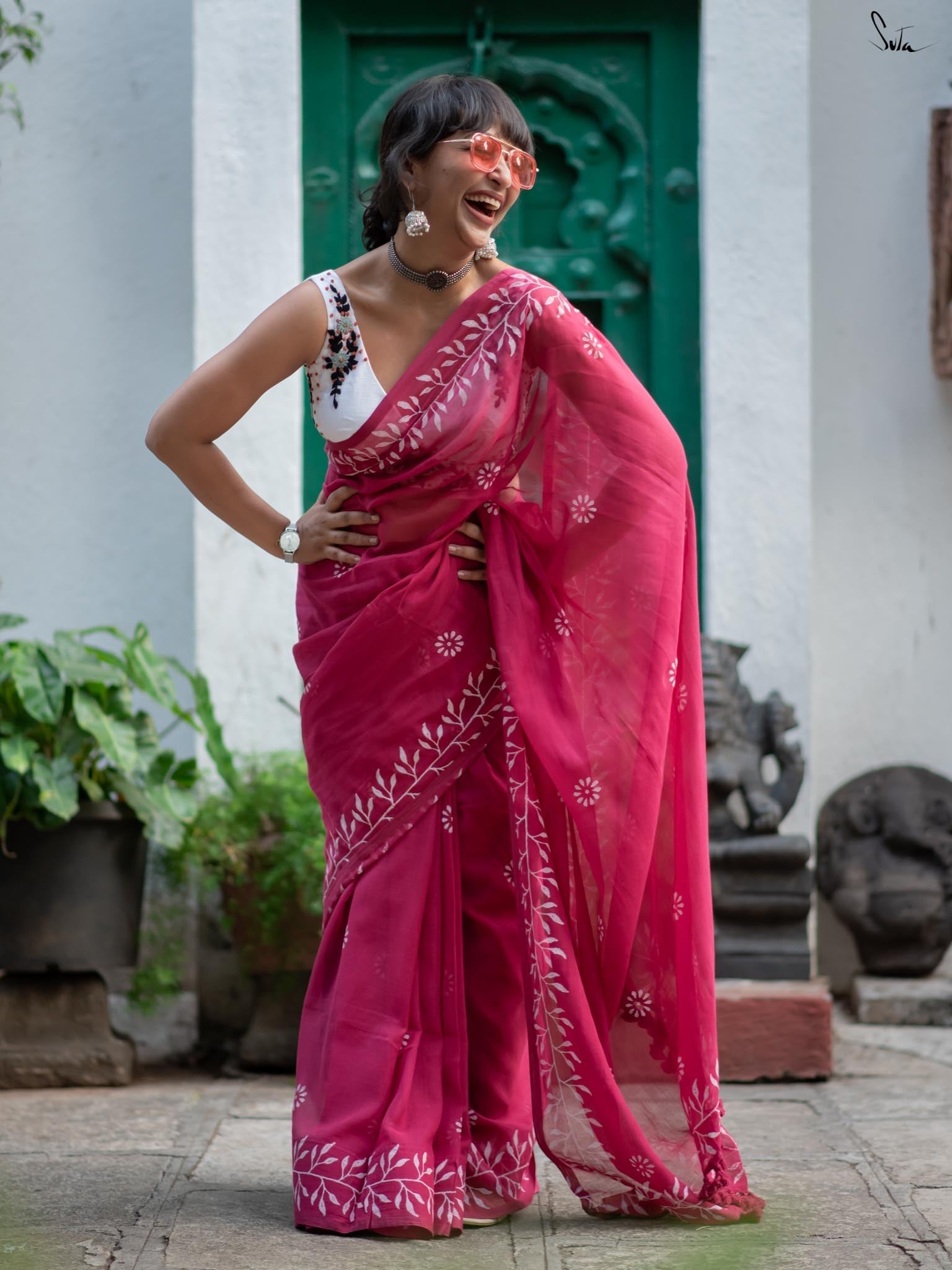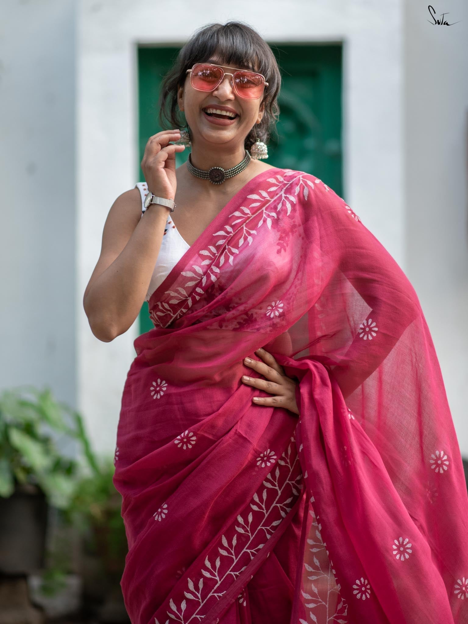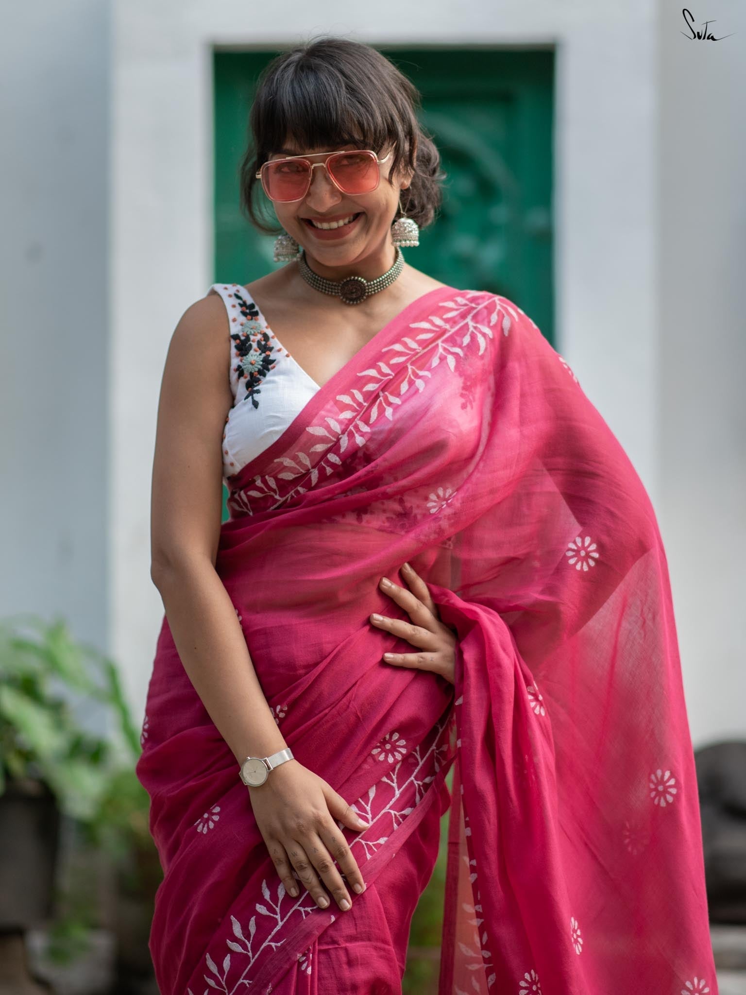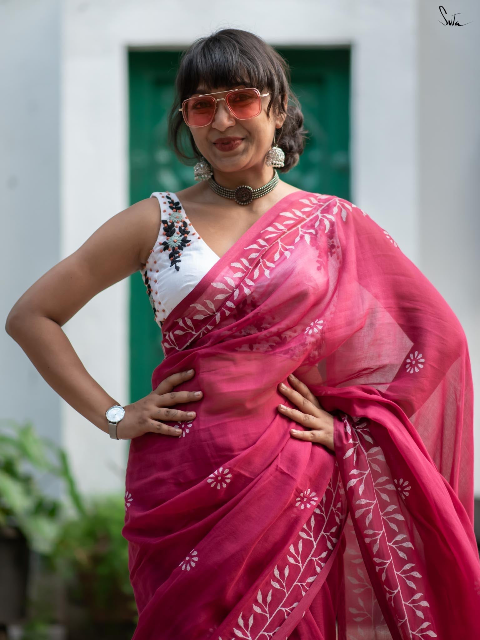 Nebula Night wraps you in sheer magic. This gorgeous pink and white saree, crafted from soft, breathable mul cotton, features stunning floral prints that are sure to steal the spotlight. Perfect for any occasion where you want to make a statement, Nebula Night lets you spread love and capture hearts with every step.