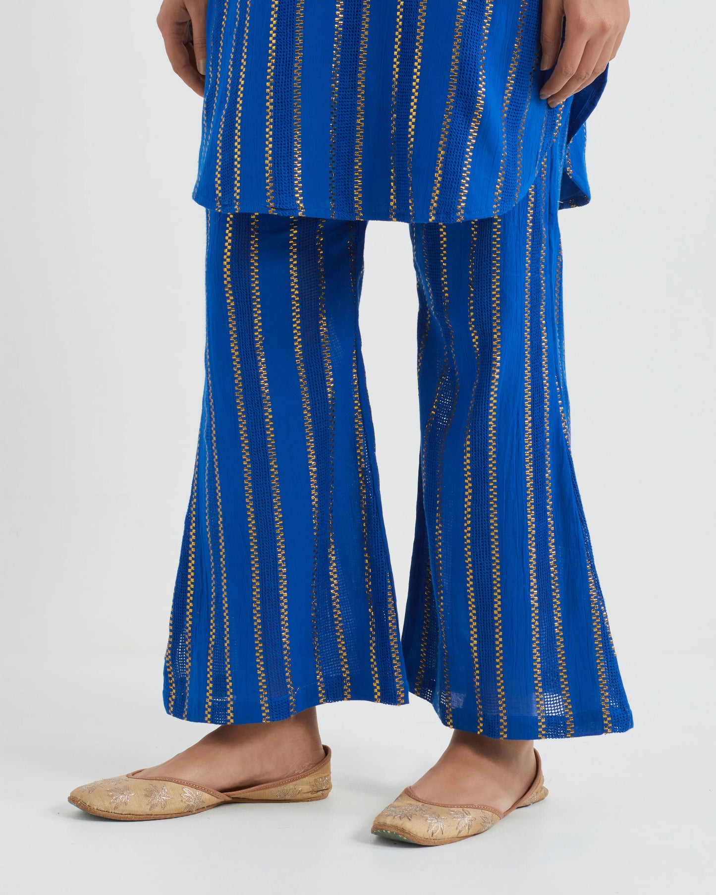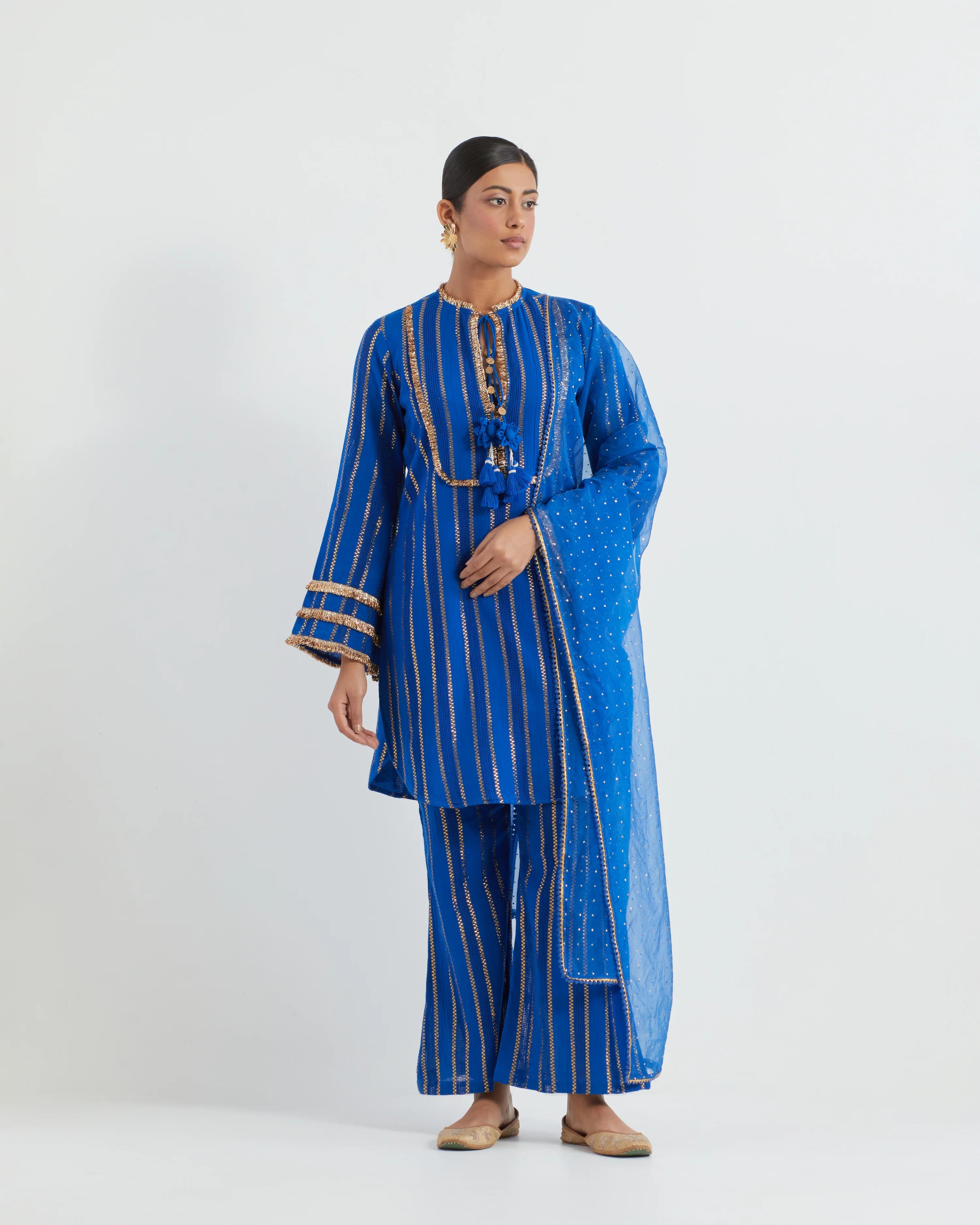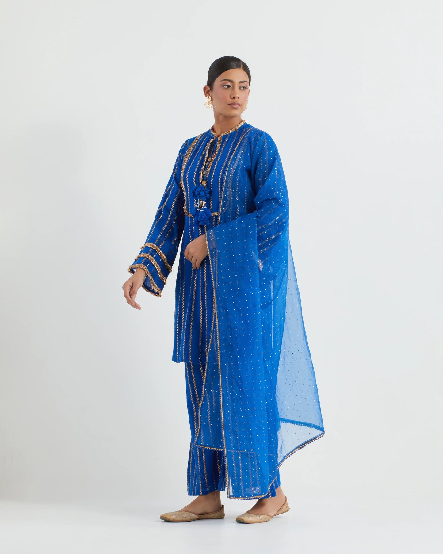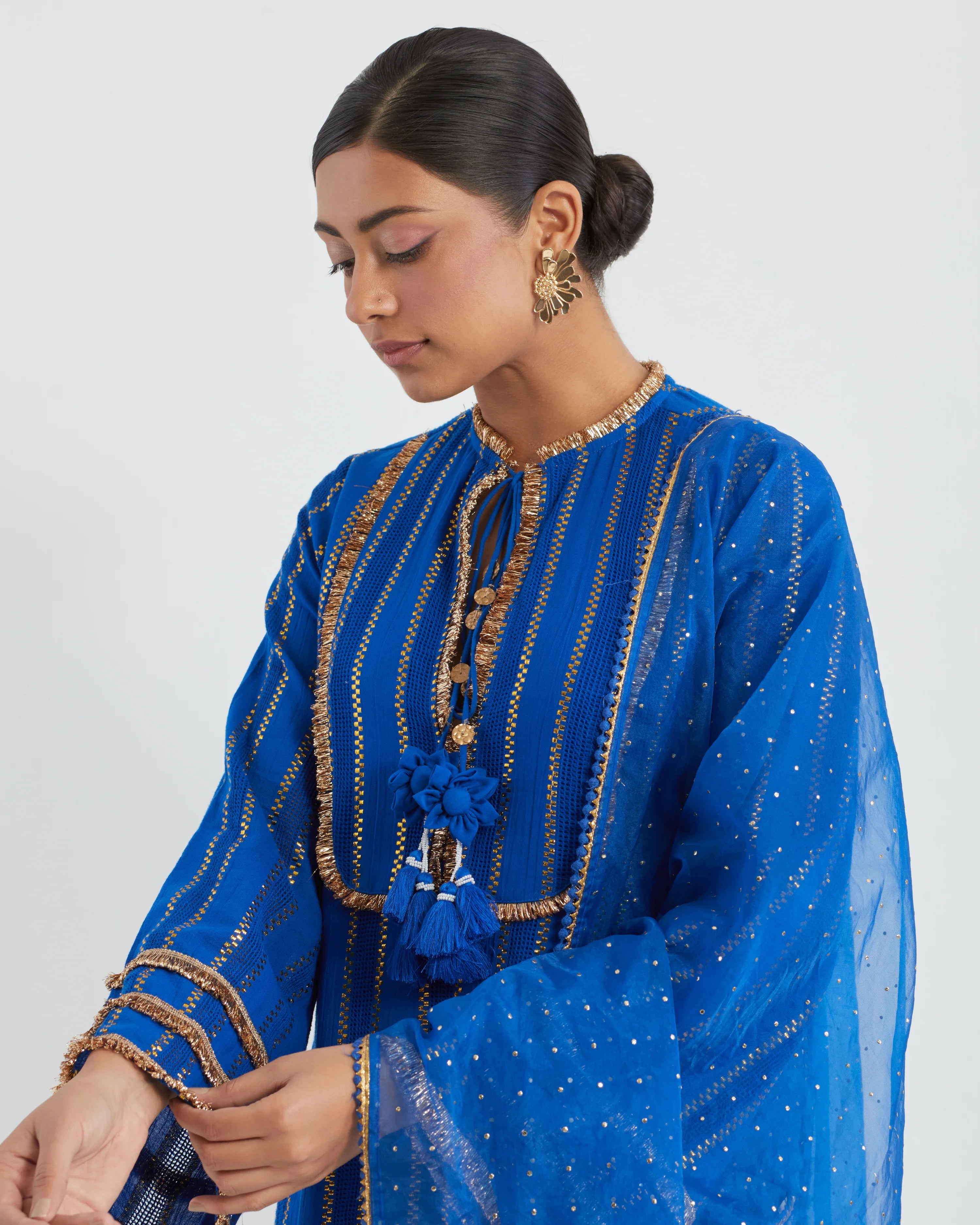 A pure silk Chanderi Anarkali with hand embroidery at neck and gotta lace detailing on sleeves and hemline. It comes with cotton pant with printed patch border at bottom, Dupatta is in silk Chanderi digital print with gotta border.