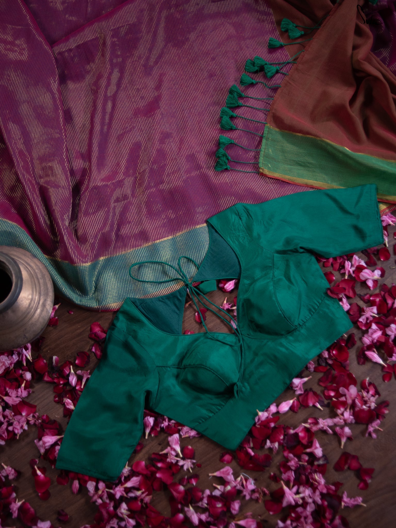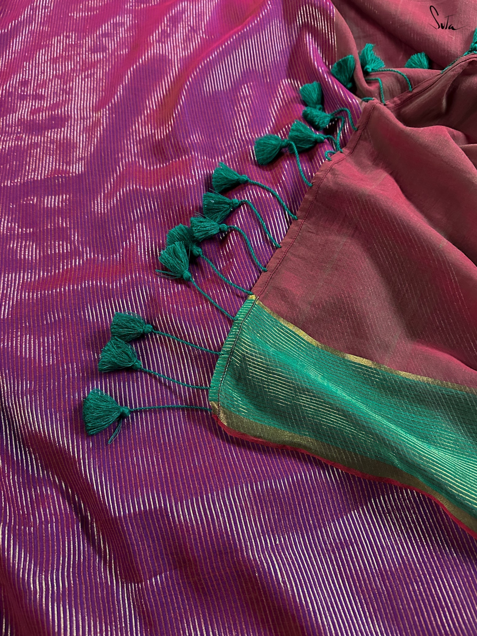 Exude grace in this gorgeous magenta-hued saree thats made of light-as-air mul-mul cotton and infused with shimmering zari.