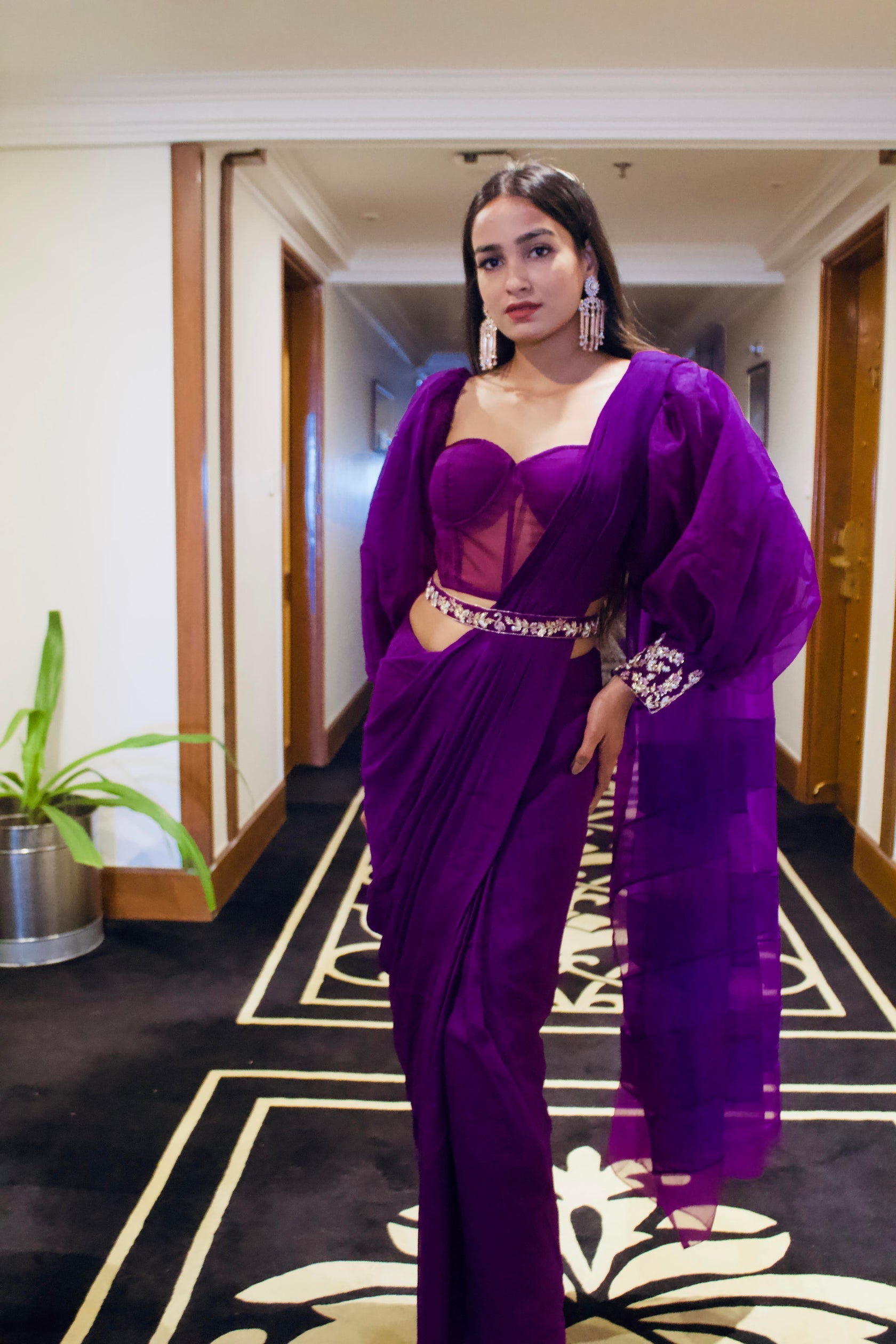 Georgette crepe pre-drape saree. Paired with corset blouse, features bishop sleeves with embroidered cuff and detachable belt