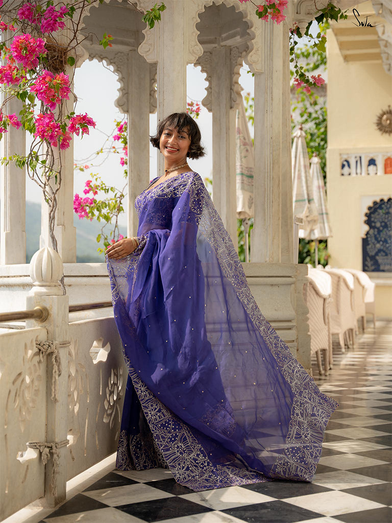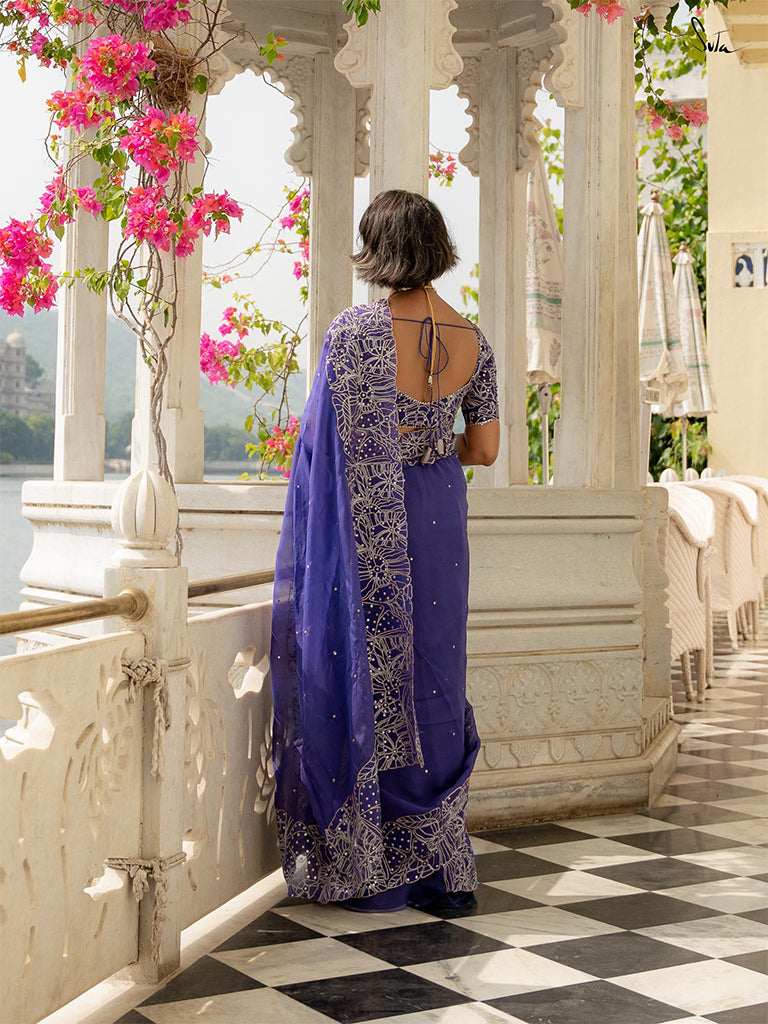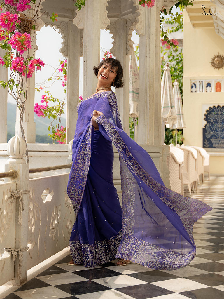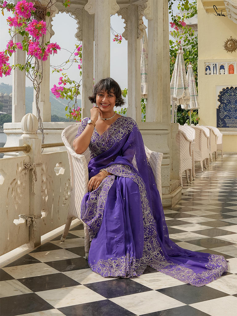 This violet saree is crafted from the viscose organza fabric with intricate silver zari embroidery, creating a fractal of butterflies and flowers. Sequins dancing all over the saree, is the optimal final touch.