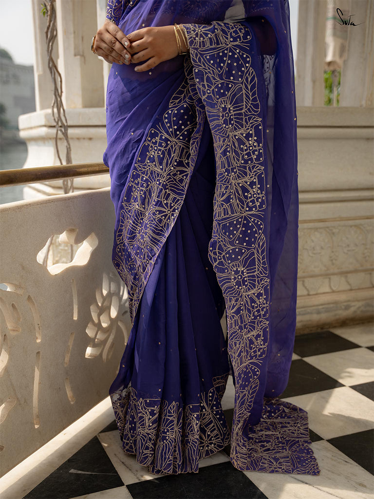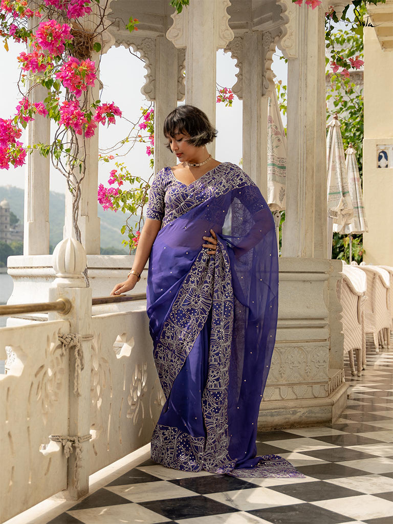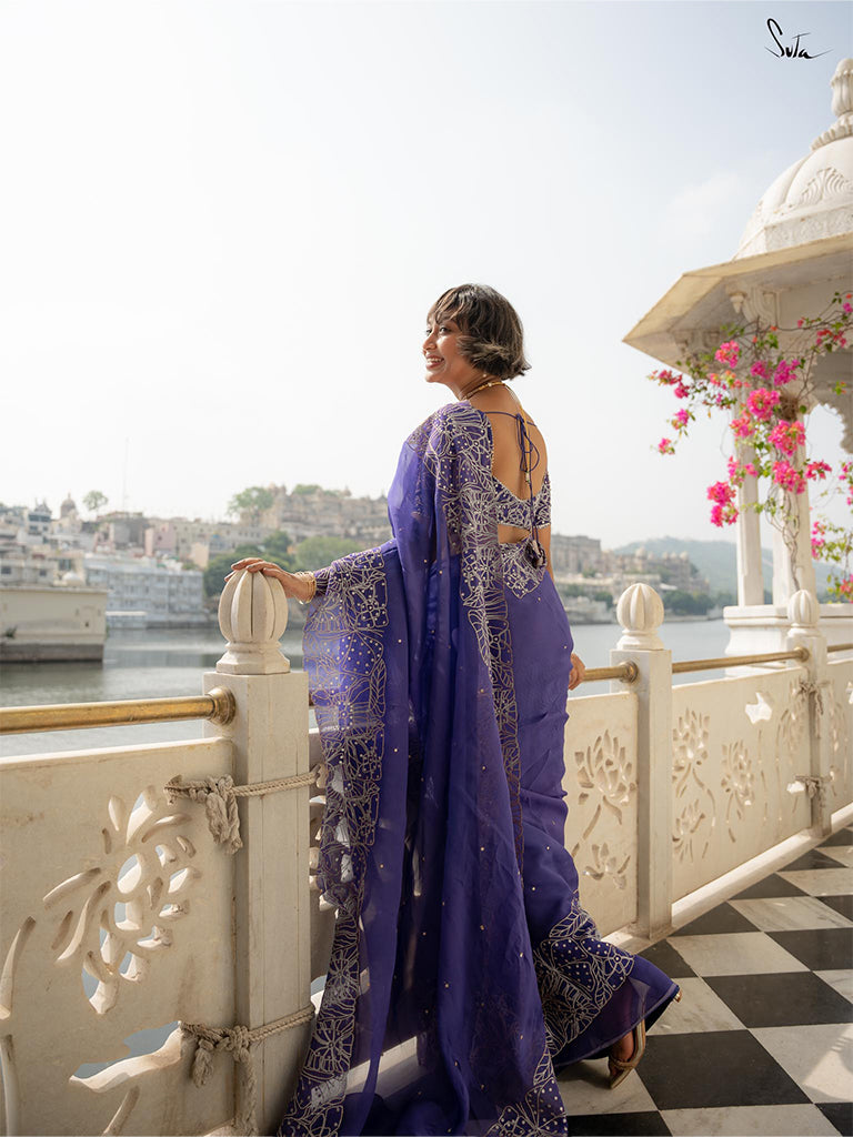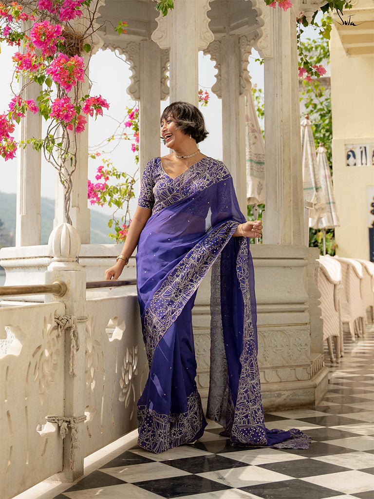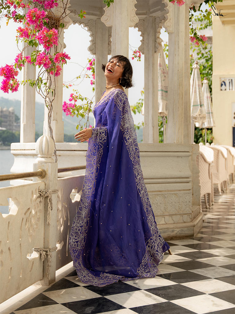 This violet saree is crafted from the viscose organza fabric with intricate silver zari embroidery, creating a fractal of butterflies and flowers. Sequins dancing all over the saree, is the optimal final touch.