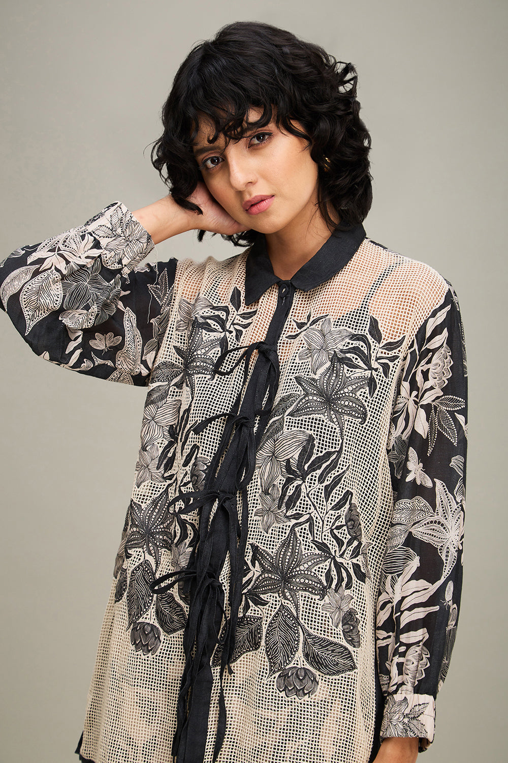 Emboridery & Embellishments: Off-white Ahyana Appliqued Shirt with Front Drawstrings, Paired with Printed Pants.