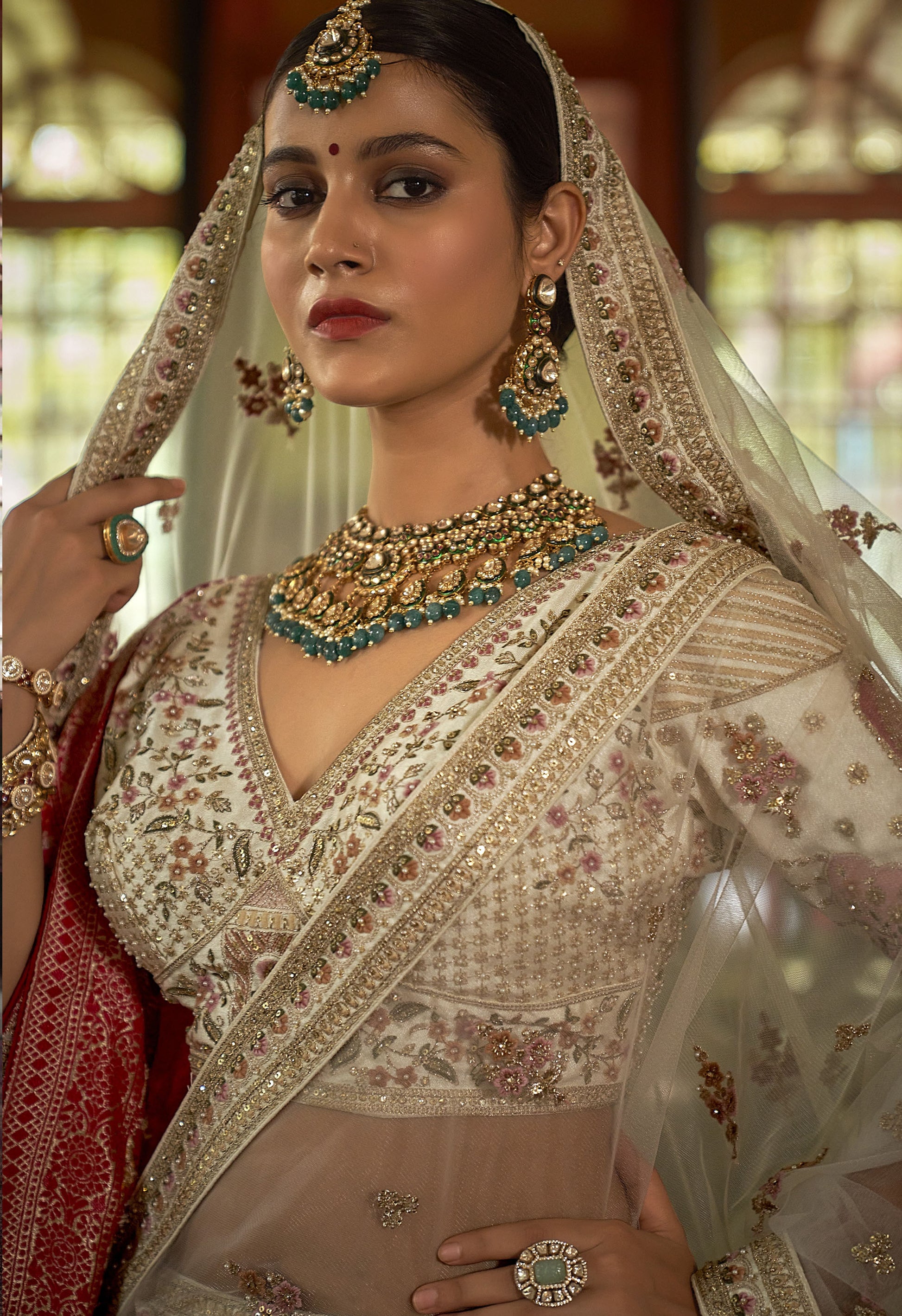 Off White Banarasi Silk Zari, Sequins and Pearl Embroidery Wedding Lehenga