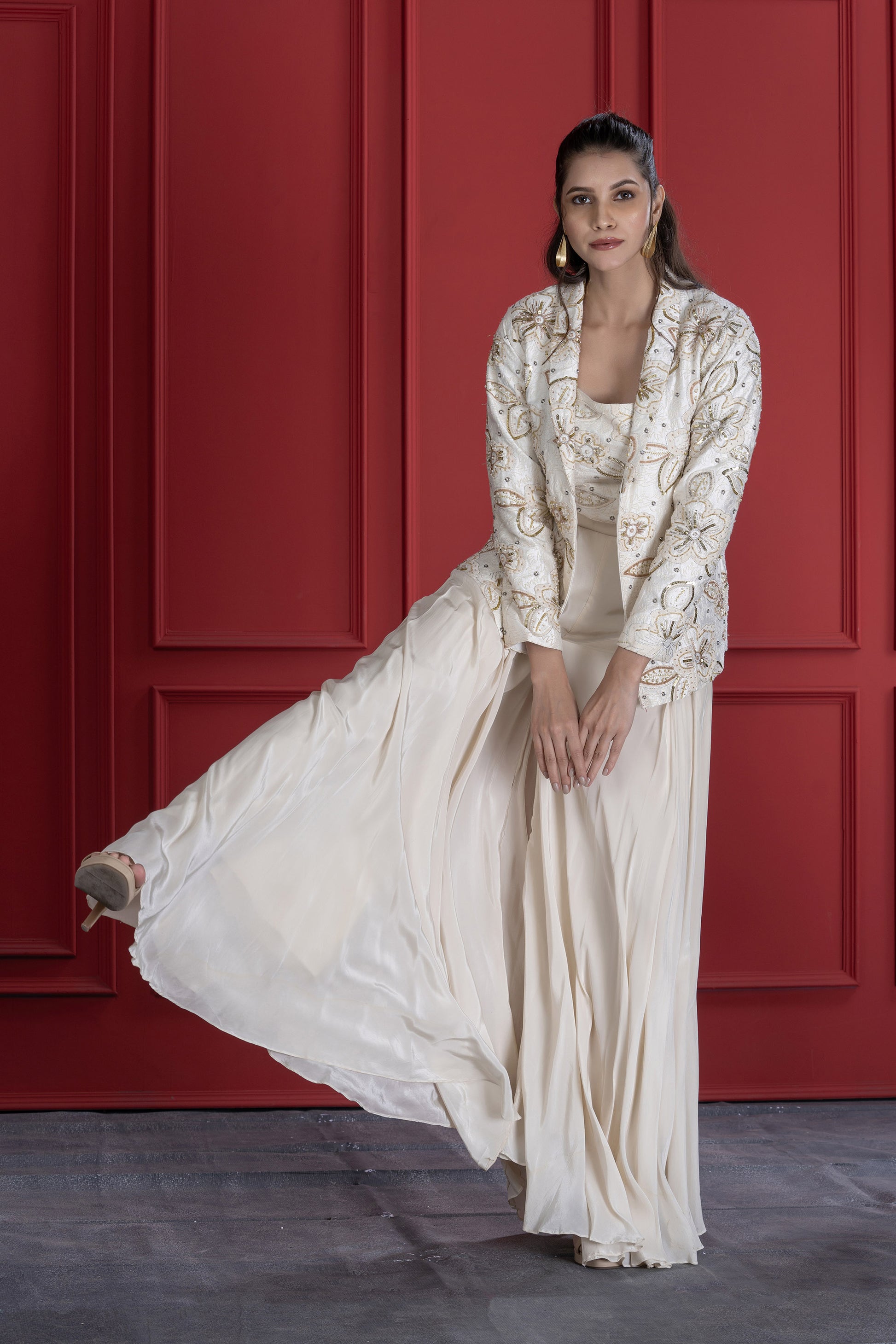Textured spaghetti with Blazer with added handwork embellishments and a plain pleated palazzo