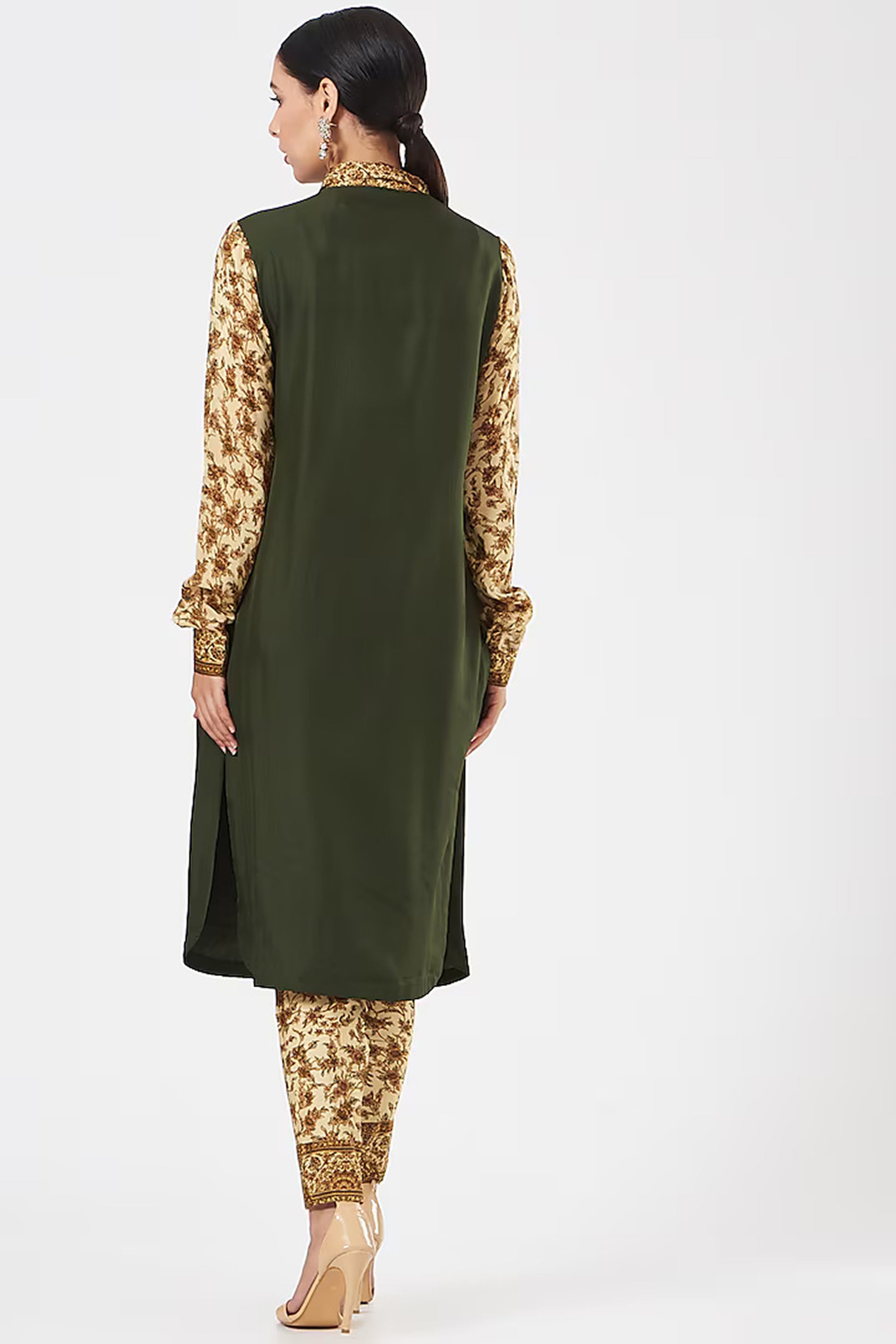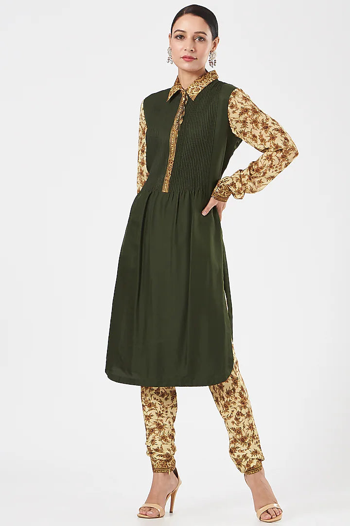 Featuring an olive green pleated shirt in silk base with print. It is paired with contrasting beige churidar pants.