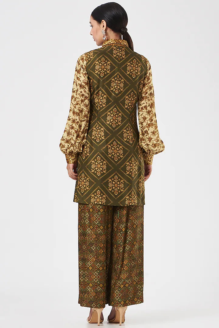 Featuring an olive green tunic in silk base with print. It is paired with contrasting beige pants.