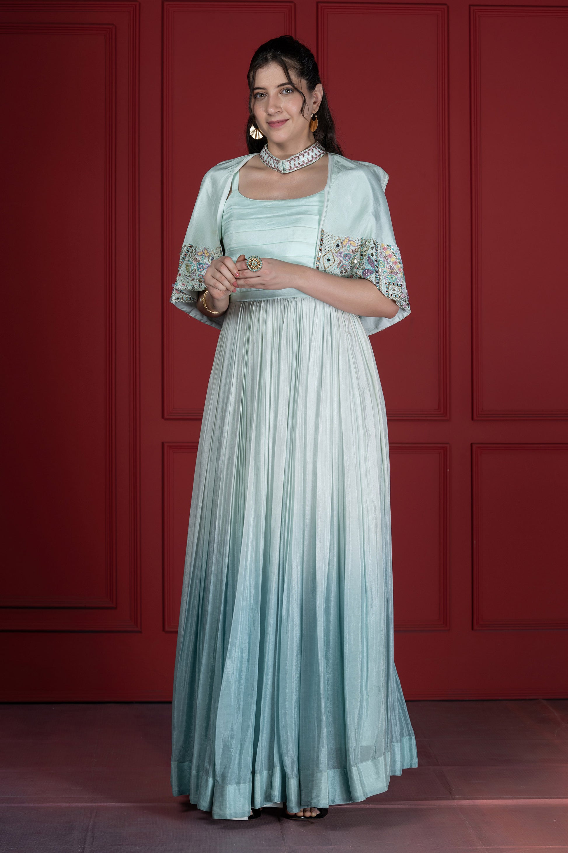 Flowy, ombré gown in a soft aqua shade that transitions into lighter tones at the hem. The gown is paired with a delicately embellished bolero-style jacket, with intricate beadwork on the flared sleeves adding a touch of glamour.