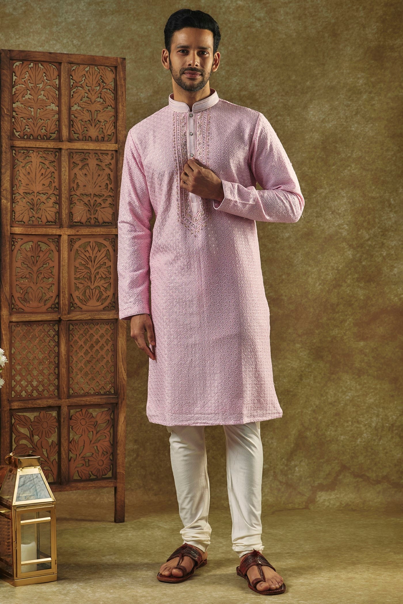 Onion Pink Silk kurta pajama set with resham embroidered neck