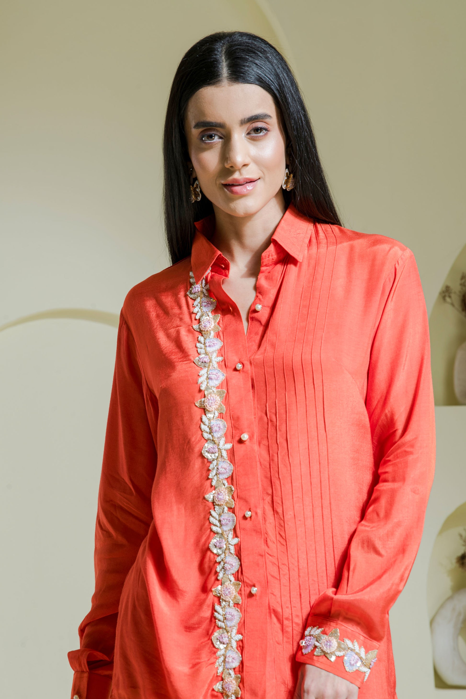 Opt for this beautiful co-ord set for your fancy outings.Delicate hand embroidered floral pattern,pin tucks and pearl buttons make this shirt a master piece you just cant miss.It is paired with plain straight pants.