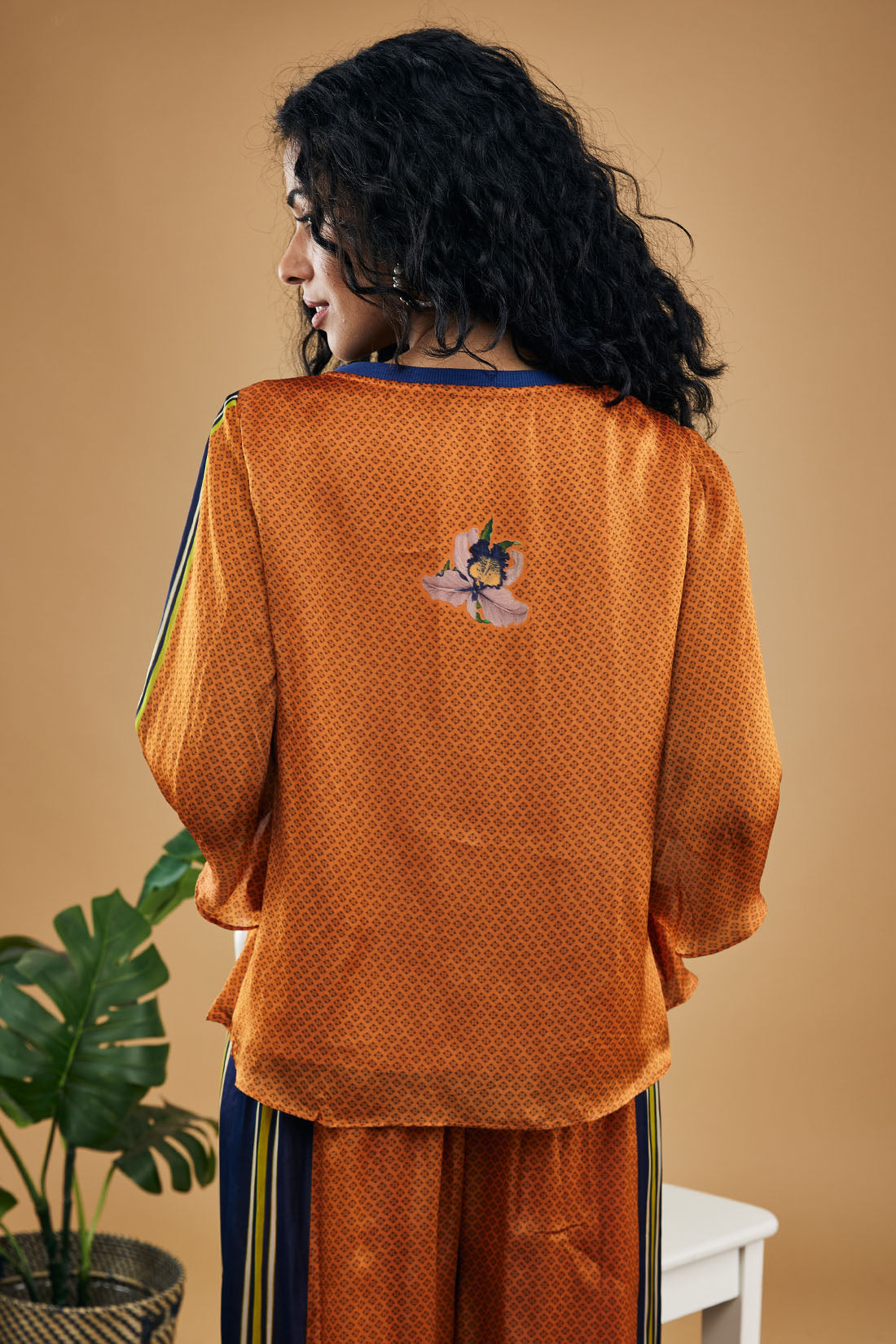 Orange Orchid Bloom Printed T-Shirt And Flared Pants Cotton Silk.