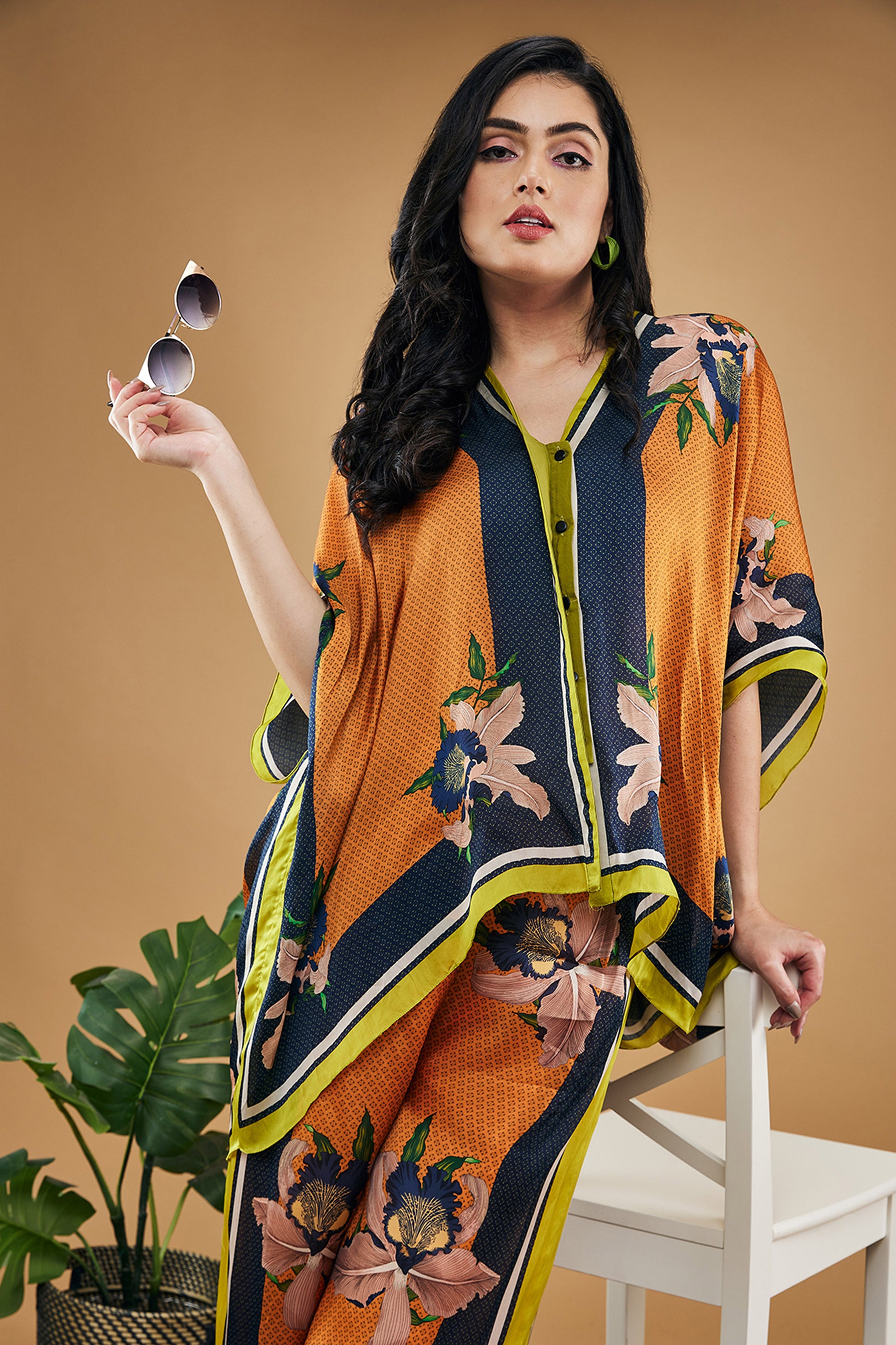 Orange Orchid Bloom Printed Kimono Shirt With Pants