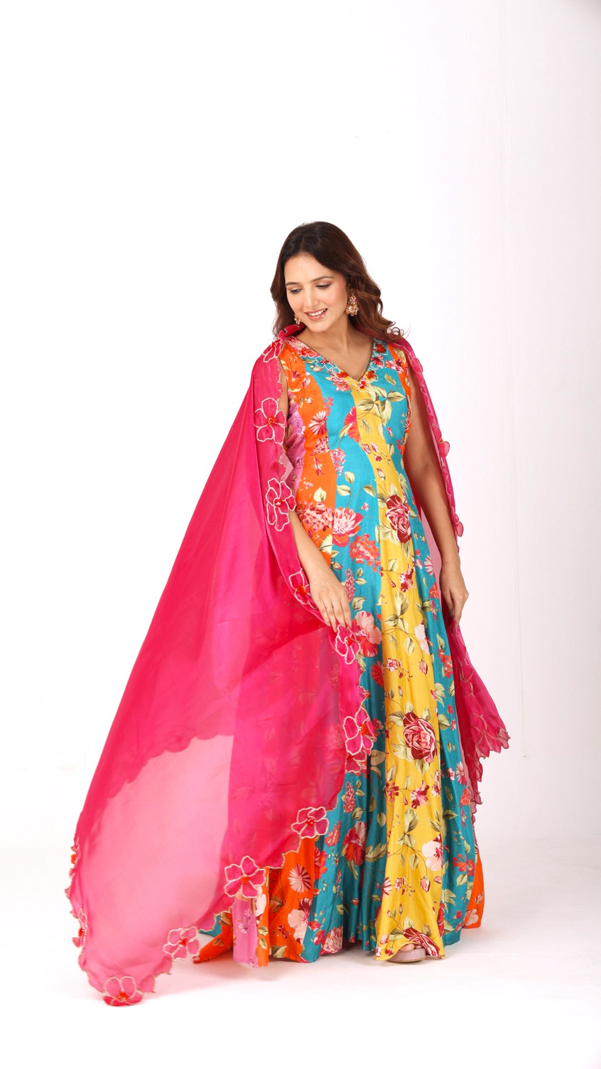 Orangeade Multicolour hand-embroidered floral anarkali paired with a vibrant dupatta