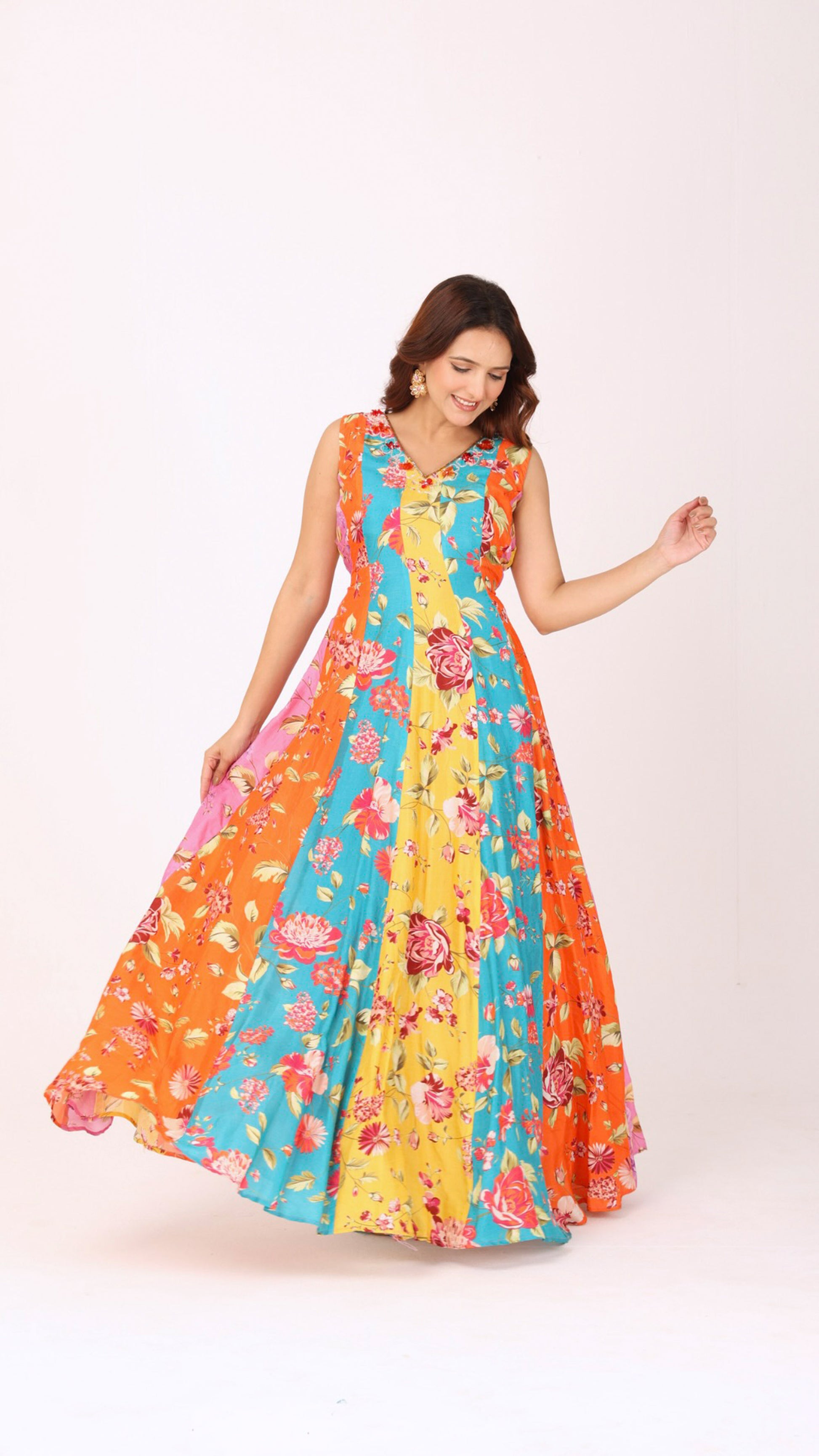 Orangeade Vibrant multi-colour floral dress with delicate hand embroidery