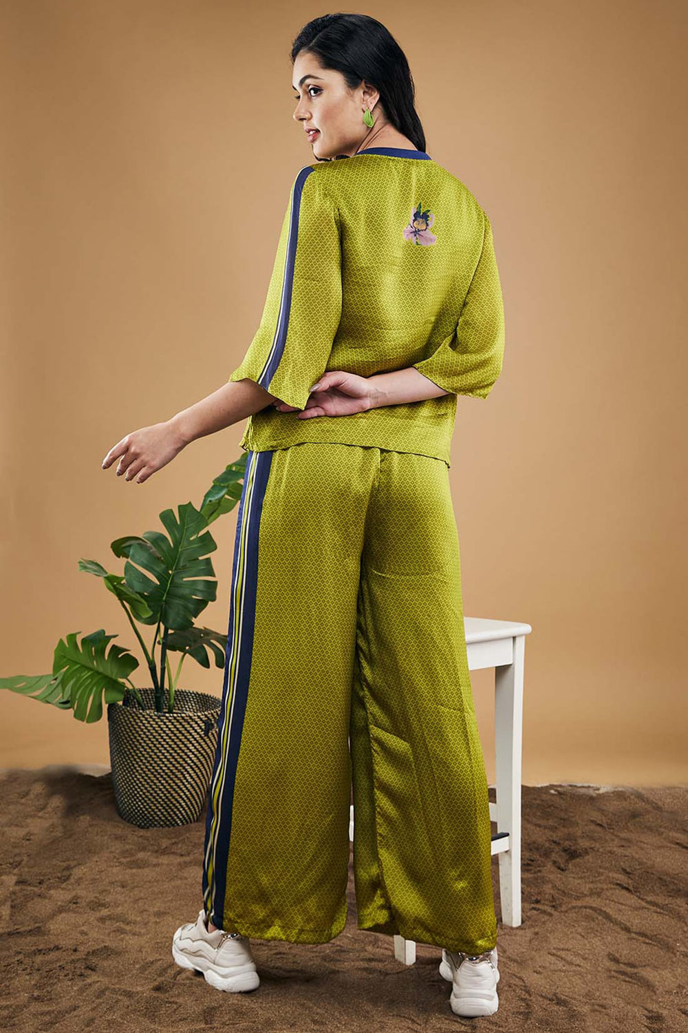 Green Orchid Bloom Printed T-Shirt And Flared Pants Cotton Silk.